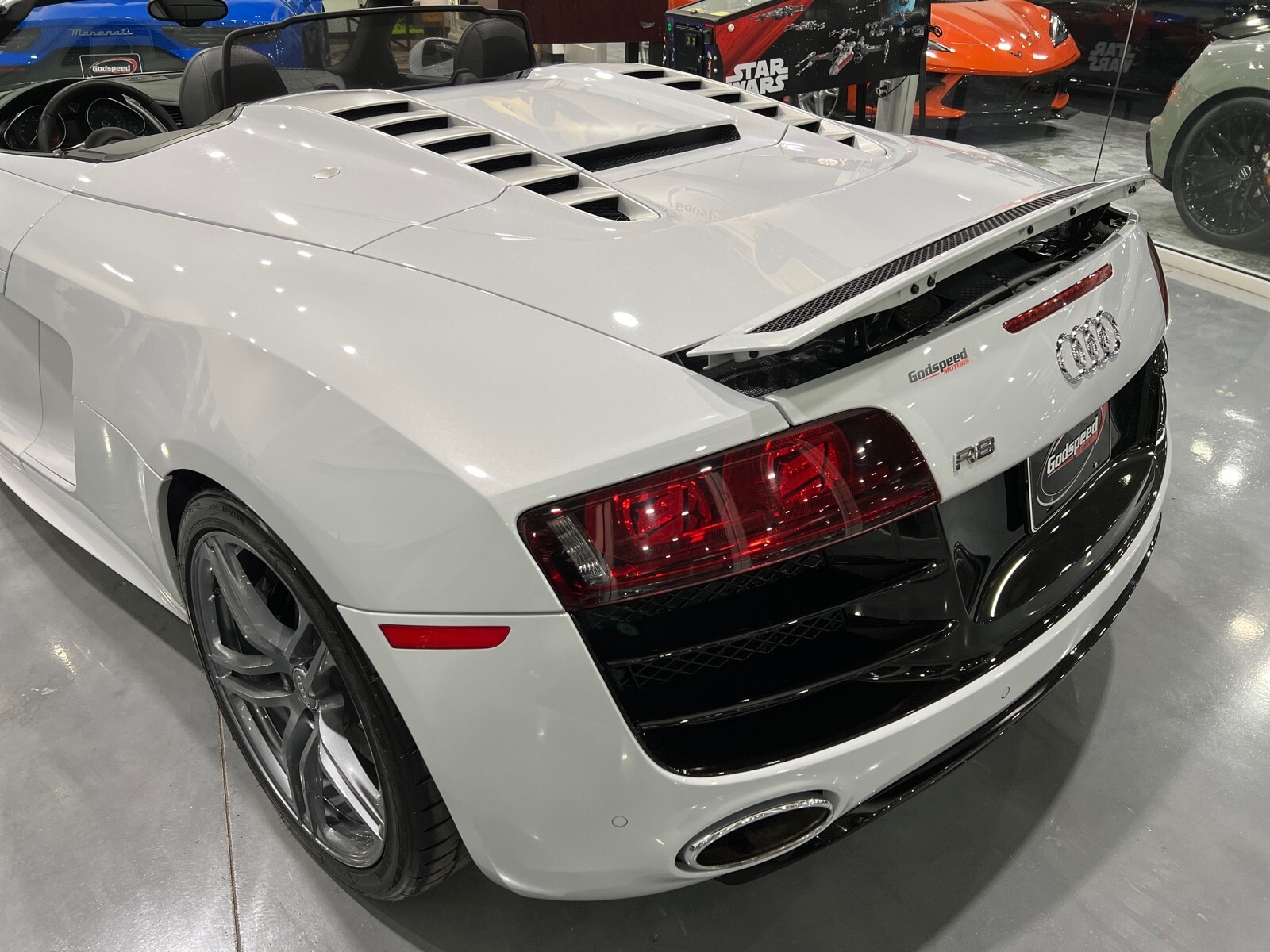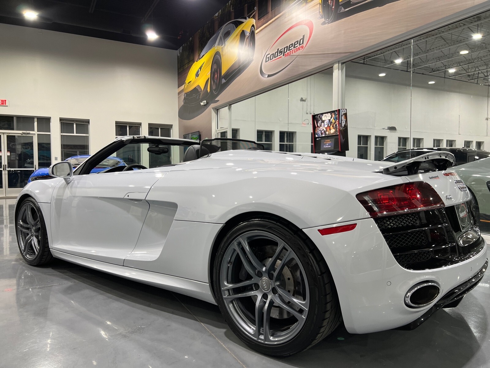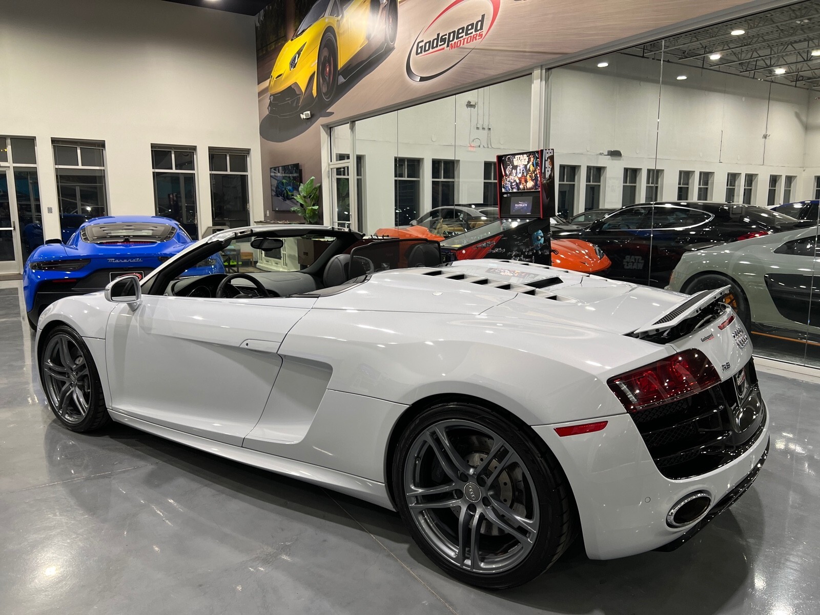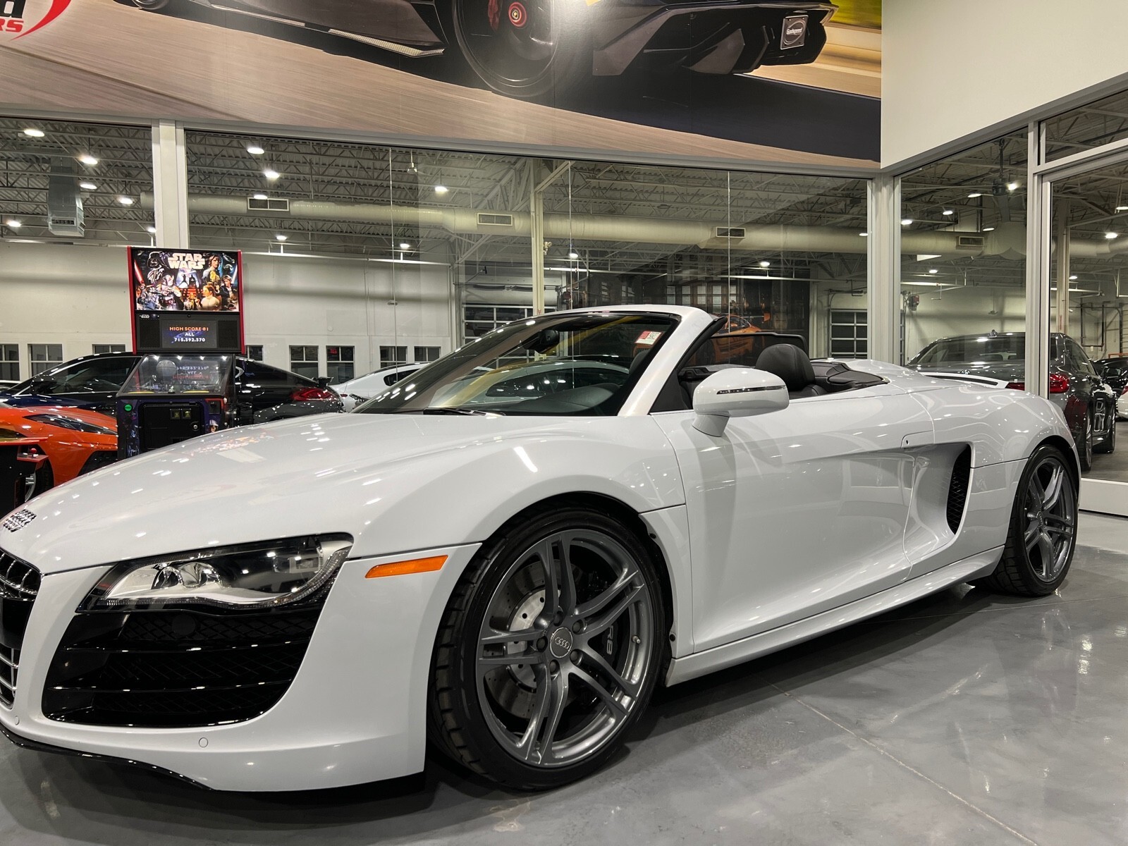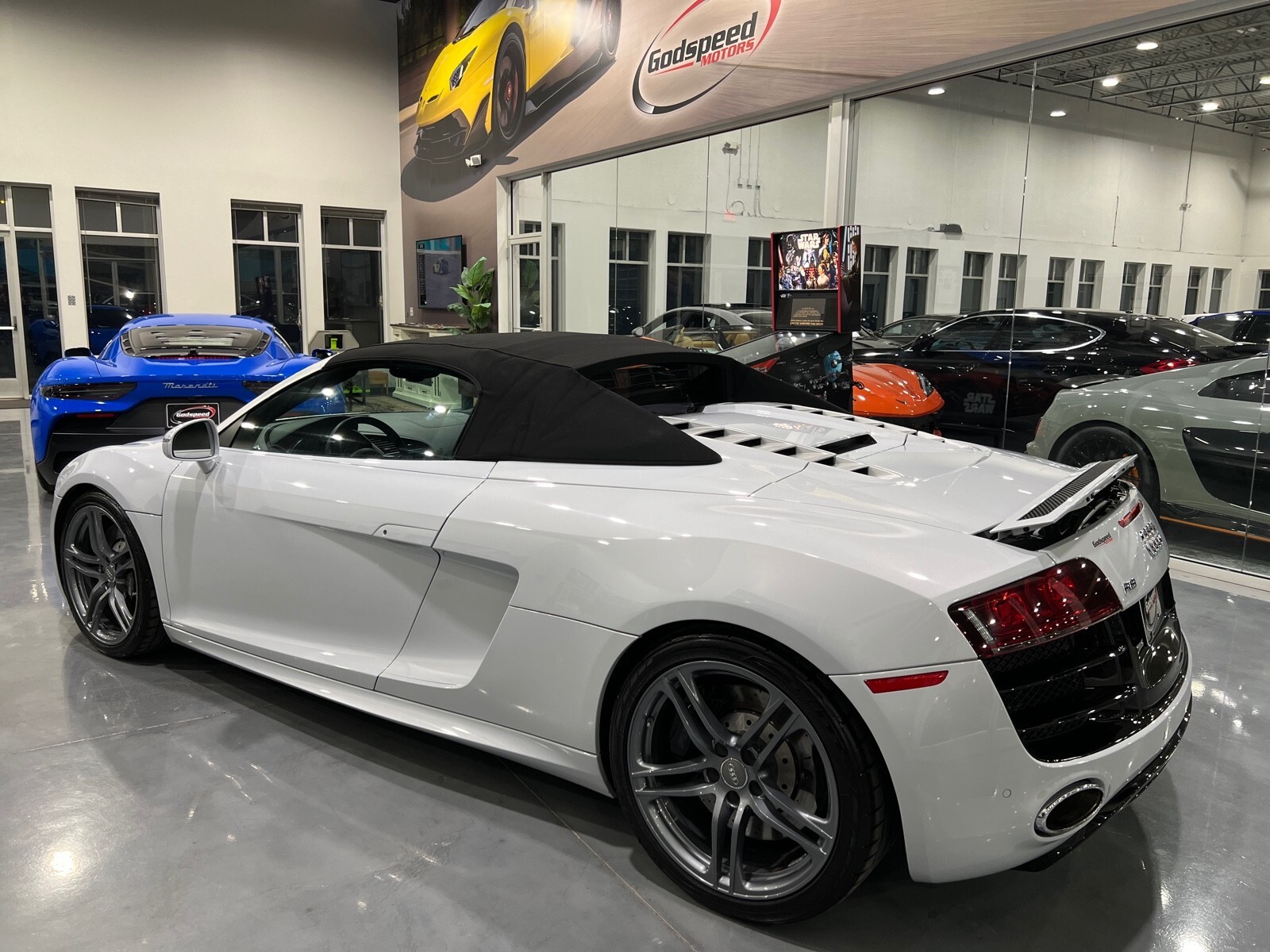 5.2L V10 rated at 525 horsepower! Power-operated convertible top, quattro all-wheel drive, Bang & Olfusen audio, SiriusXM capable, Audi Navigation Plus, Bluetooth, heated seats, rearview camera and much more! $174,550 MSRP when new! Since its debut in 2006, the Audi R8 has forged its position among the ranks of Europe's best sportscars. In 2008, Audi released the Spyder version featuring a convertible top and the desirable 5.2L V10. Godspeed Motors is pleased to offer this 2011 Audi R8 Spyder! The open air experience gives the driver and passenger a front row experience to the symphony coming from the rear tailpipes. Screaming all the way up to 8,000 rpm and beyond, the Lamborghini-built engine is rated at 525 horsepower and is capable of propeling this drop-top to 60 mph in less than 4 seconds! That top needs only 19 seconds to go from a fully-closed cabin to a sunny atmosphere. Comfort and convienence was not compromised, as standard options include: quattro all-wheel drive, Bluetooth, cruise control, 10-way power heated seats, rearview camera, AM/FM/CD, and more! If you're looking for an exciting sports car that is easy to live with everyday, this Audi R8 deserves your consideration! Recent service/maintenance include: FRESH OIL CHANGE CARFAX does show a minor accident. To see more details click on the True 360 report towards the bottom of the CARFAX, or the link below view-report/betlXrWUsEtfjBgwUJPJ **Window sticker is a duplicate version, prices and options might vary** MSRP $172,800.00 INSTALLED OPTIONS [T9PA] Ibis White black soft top $0 [JN] Black, Leather Seating Surfaces $0 [PQK] 19 5 Arm Double Spoke Titanium Finish Forged Aluminum Alloy Wheels P235/35R19 front & P305/30R19 rear summer performance tires $500 [PNC] Audi Navigation System Plus W/Audi Music Interface color screen $0 Original Shipping Charge $1,250 RETAIL PRICE (ORIGINALLY NEW) $174,550.00