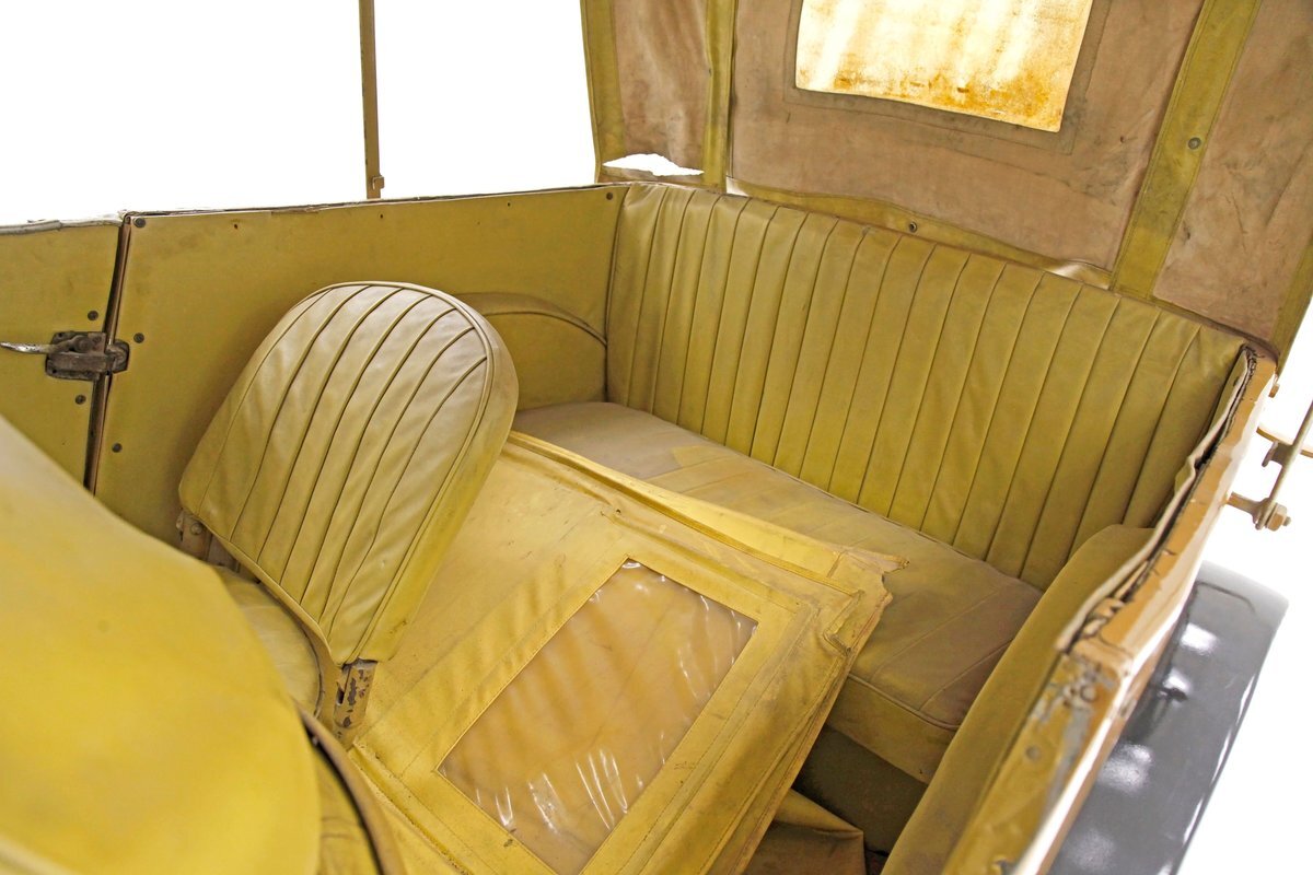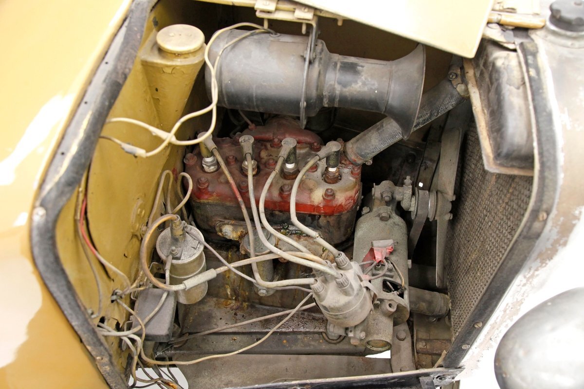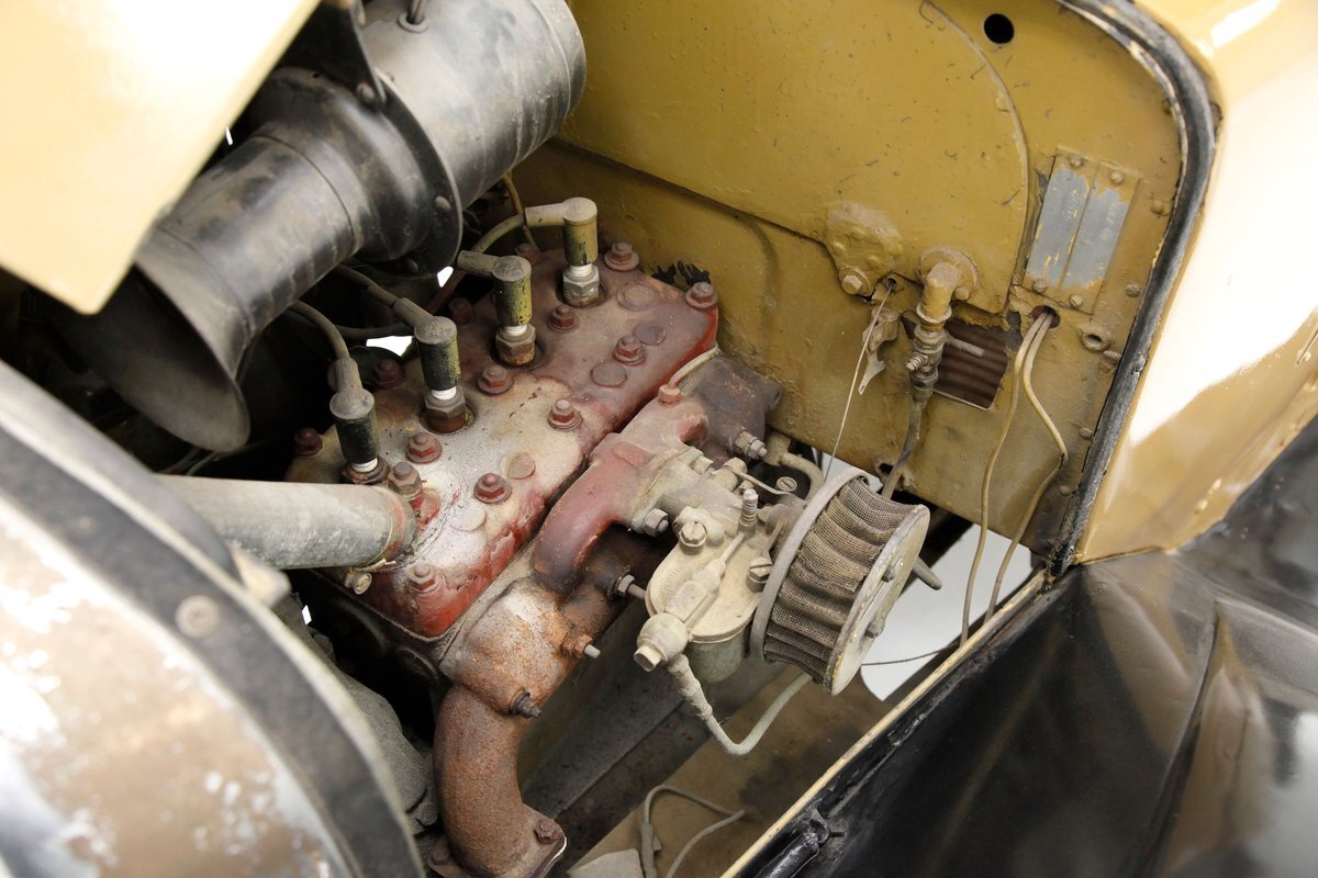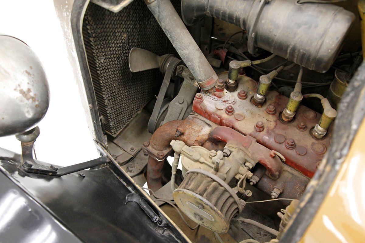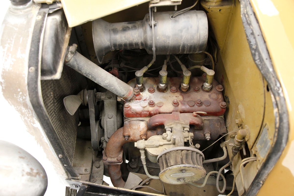 With the ubiquitous 1920's and early 1930's design of a vertical radiator, (this one is nice and shiny), cowled hood, wide firewall and single door per side"tub" for the passengers, also throw on some curved exterior fenders and we are ready to roll. This car is painted in mustard yellow and has black fenders. As noted a shiny radiator surround is in front flanked by a single circular headlight on either side. A framed large windscreen protects the passengers as well as a canvas top which is dirty, has a few tears and a clouded plastic rear window. On the back of the car is room for luggage or storage in the form of a steel black painted rack in lieu of the rear bumper. Also a spare tire and wheel is mounted to the back of the bodywork. 19-inch wire wheels are on and wrapped by 3.50-19 rubber, dry rotted and going flat.