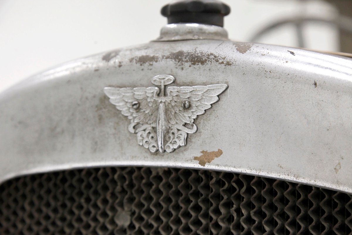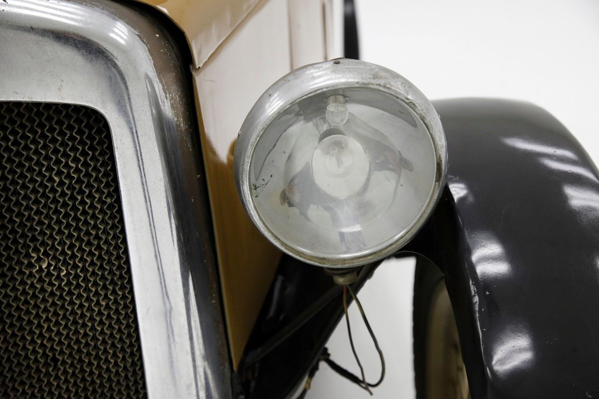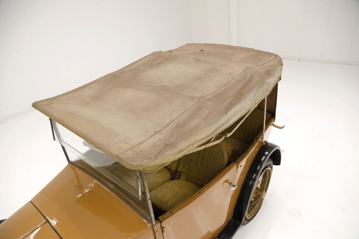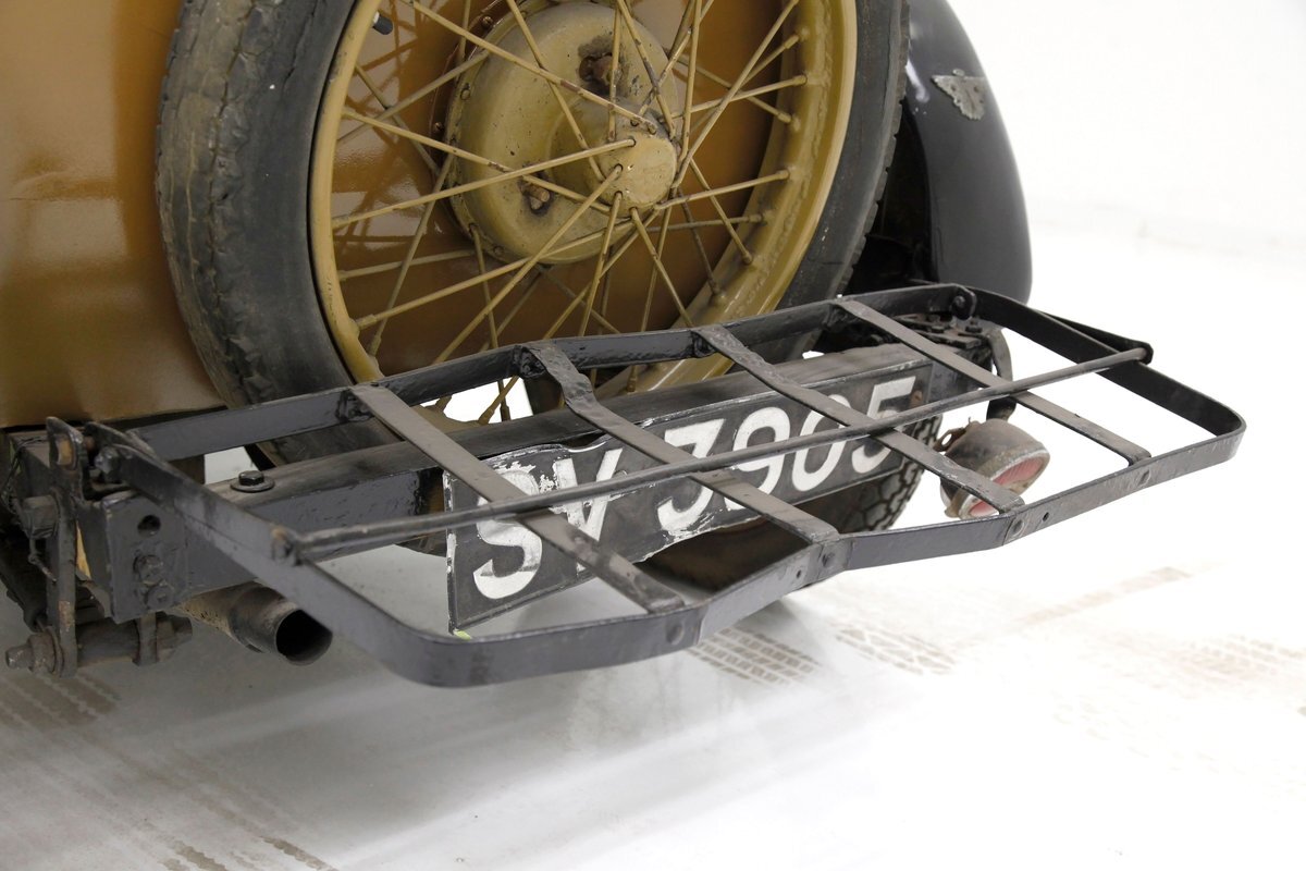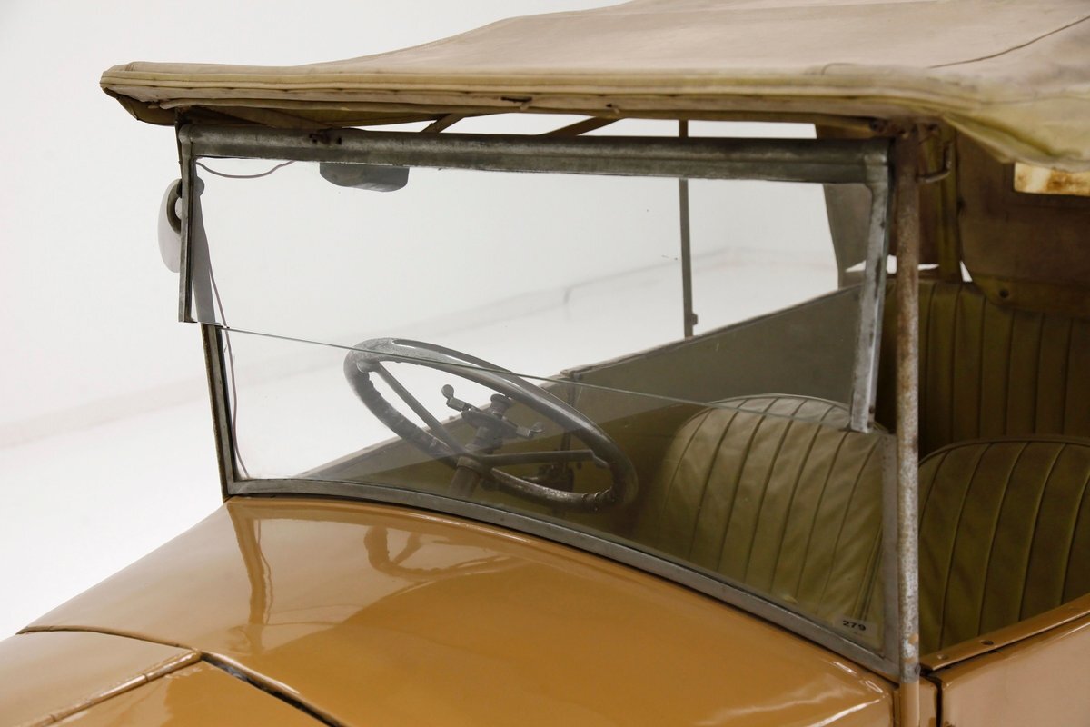 With the ubiquitous 1920's and early 1930's design of a vertical radiator, (this one is nice and shiny), cowled hood, wide firewall and single door per side"tub" for the passengers, also throw on some curved exterior fenders and we are ready to roll. This car is painted in mustard yellow and has black fenders. As noted a shiny radiator surround is in front flanked by a single circular headlight on either side. A framed large windscreen protects the passengers as well as a canvas top which is dirty, has a few tears and a clouded plastic rear window. On the back of the car is room for luggage or storage in the form of a steel black painted rack in lieu of the rear bumper. Also a spare tire and wheel is mounted to the back of the bodywork. 19-inch wire wheels are on and wrapped by 3.50-19 rubber, dry rotted and going flat.