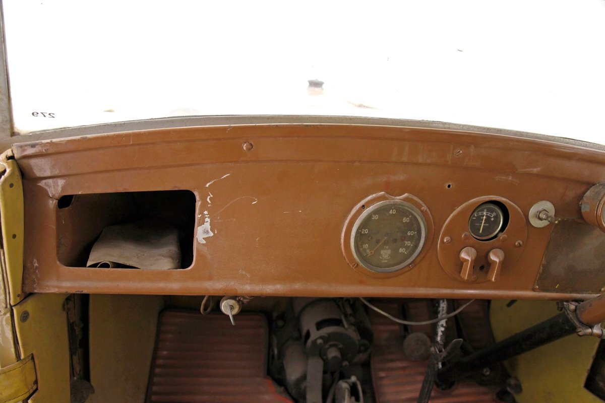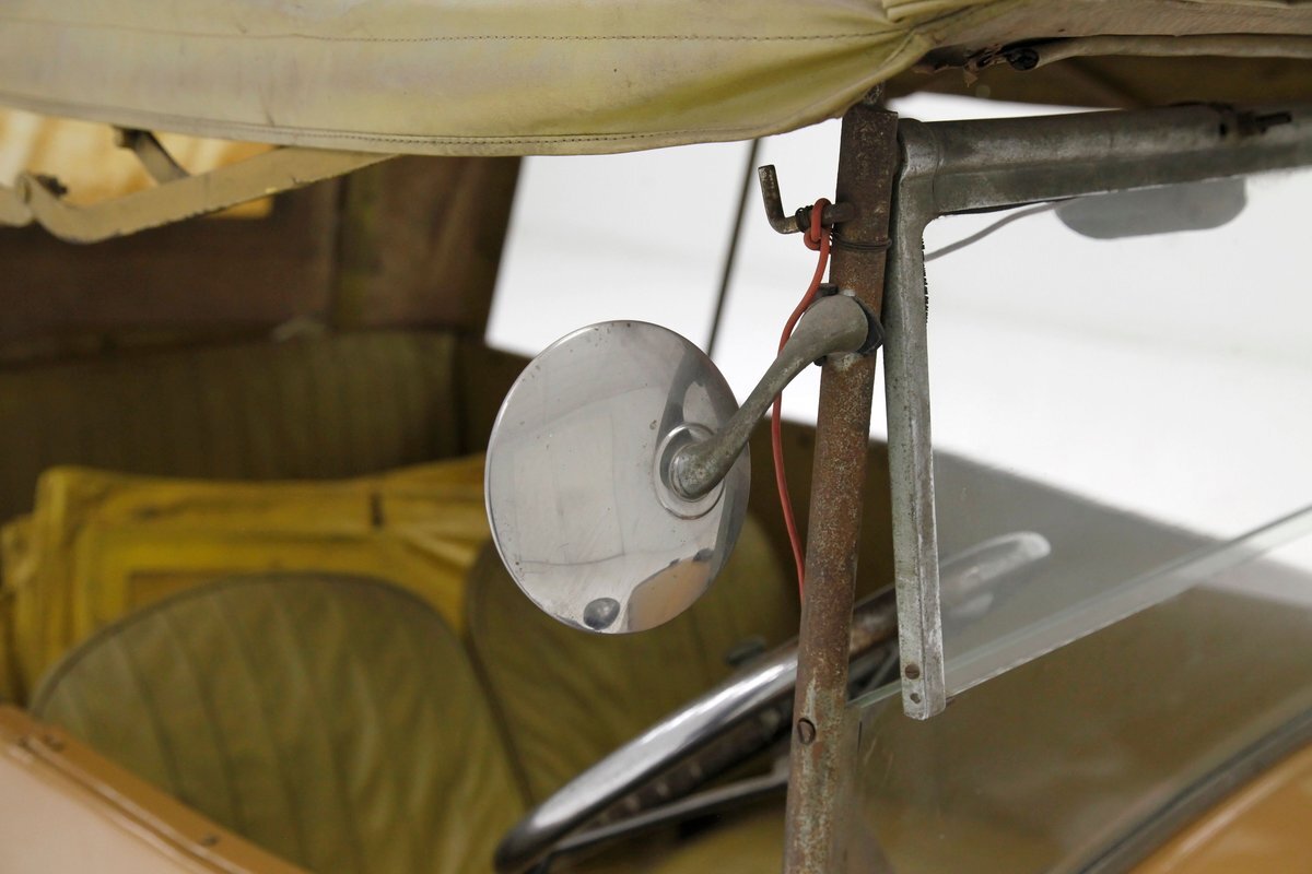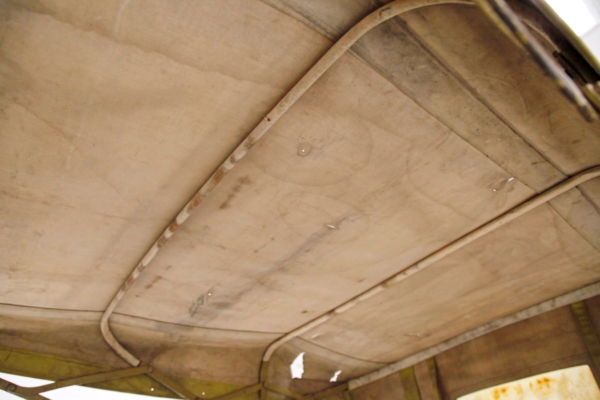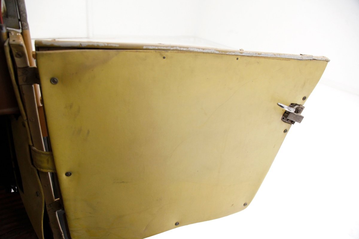 Yellow vinyl in the form of bomber low back styled front buckets and a rear bench all have some light tuck and roll inserts for the seats and backs with smooth bolsters. The seats are still in fair to good condition and basically just need a good cleaning. Upfront, a butterscotch dash in full metal is on and has a few instruments, some levers, and in front of the steering column an oil pressure gauge. This column has a large steering wheel attached to its top which is encircled in metal. The floors are ribbed rubber/plastic and a shift lever reaches for the driver. There are two storage areas which are missing their doors on either end of the dash front. Door panels are yellow smooth vinyl and present as very simple and utilitarian. The framework for the canvas too is in good conduit as it moves up and down easily.