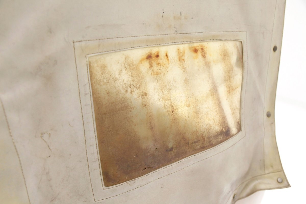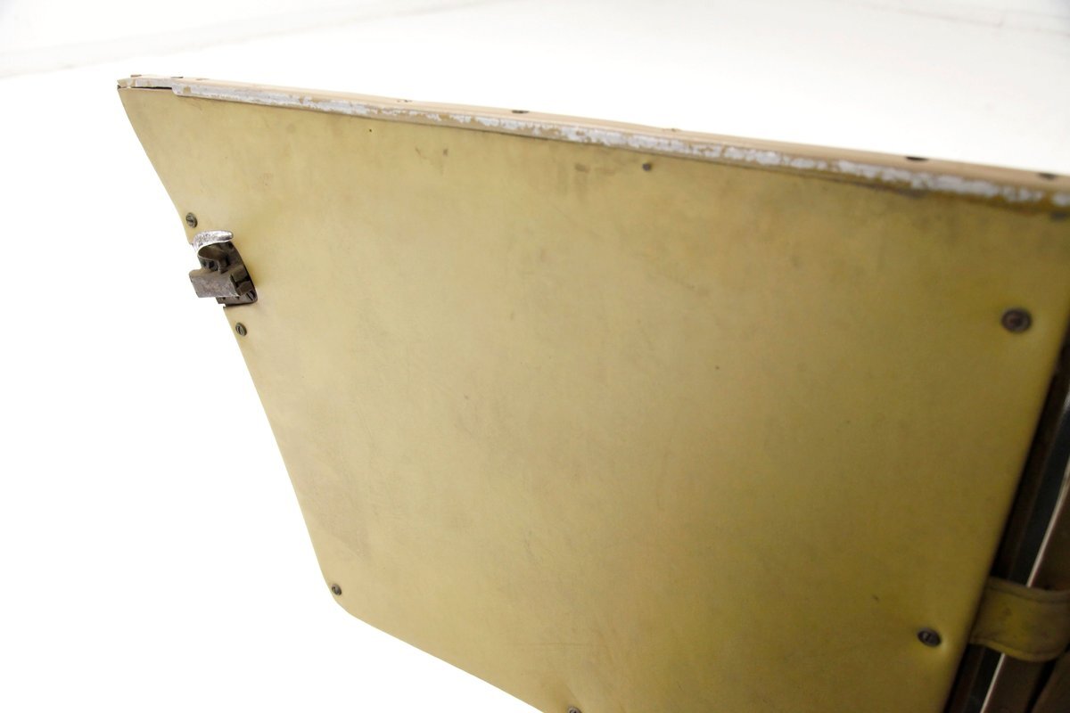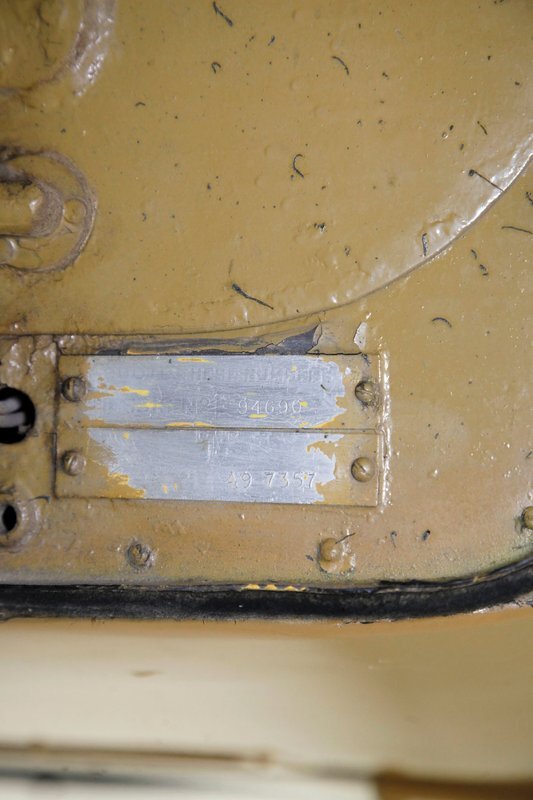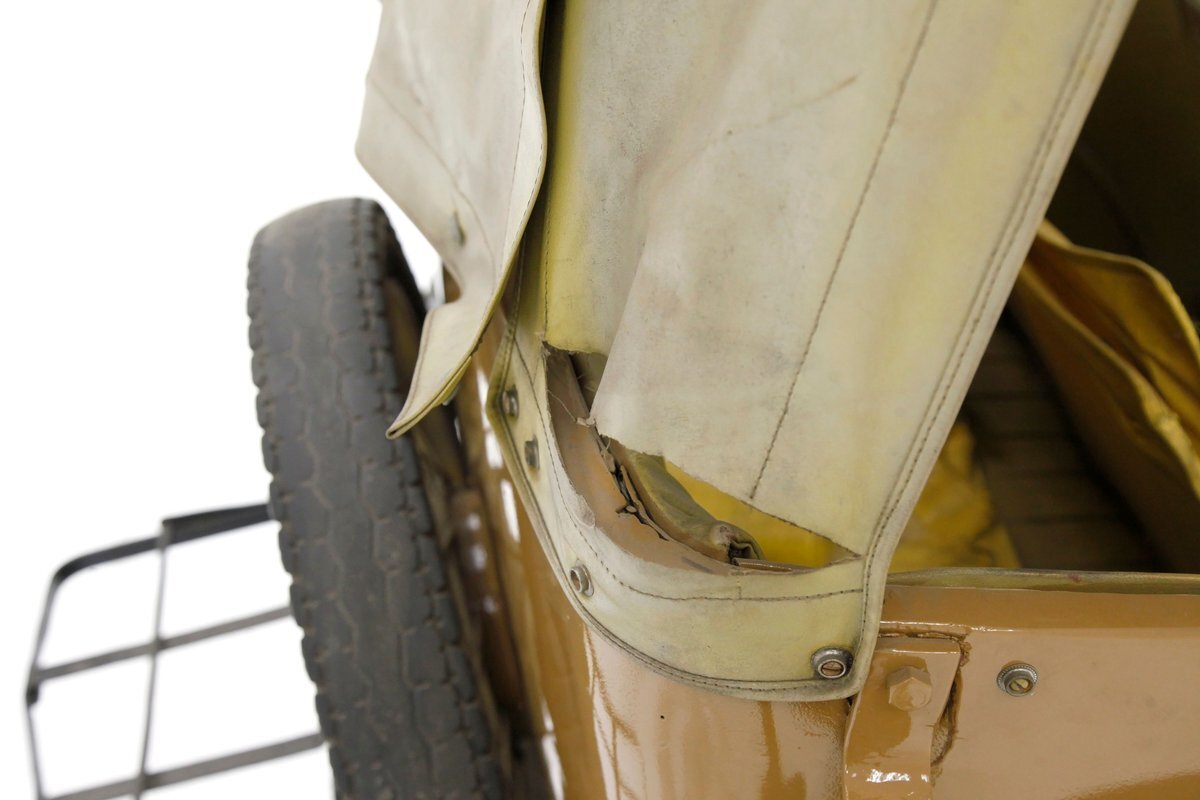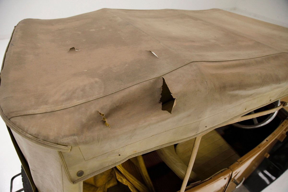 Yellow vinyl in the form of bomber low back styled front buckets and a rear bench all have some light tuck and roll inserts for the seats and backs with smooth bolsters. The seats are still in fair to good condition and basically just need a good cleaning. Upfront, a butterscotch dash in full metal is on and has a few instruments, some levers, and in front of the steering column an oil pressure gauge. This column has a large steering wheel attached to its top which is encircled in metal. The floors are ribbed rubber/plastic and a shift lever reaches for the driver. There are two storage areas which are missing their doors on either end of the dash front. Door panels are yellow smooth vinyl and present as very simple and utilitarian. The framework for the canvas too is in good conduit as it moves up and down easily.