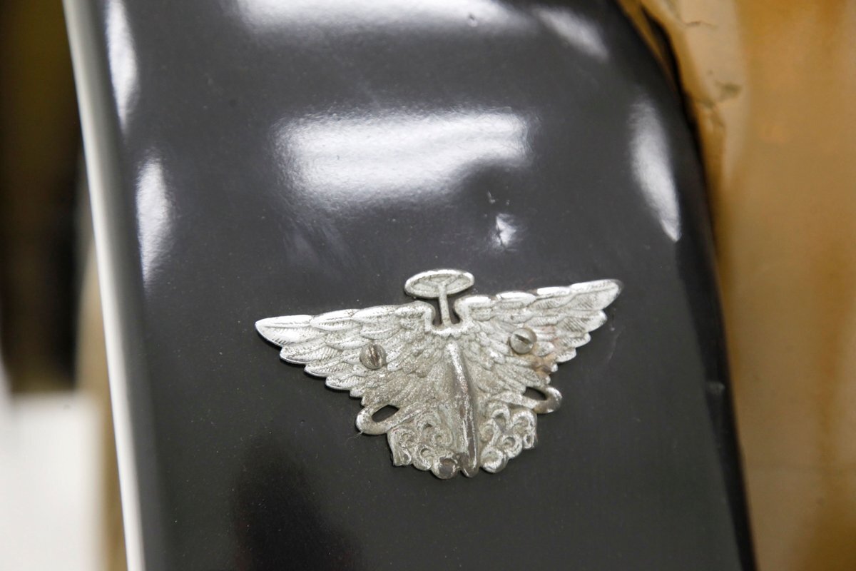 Some surface rust, but none invasive, and we note transverse leaf springs for the front and leaf springs for the back. Mechanical drum braking is on all 4 corners, the front brakes are operated by a hand lever, and the rears are with the foot pedal.