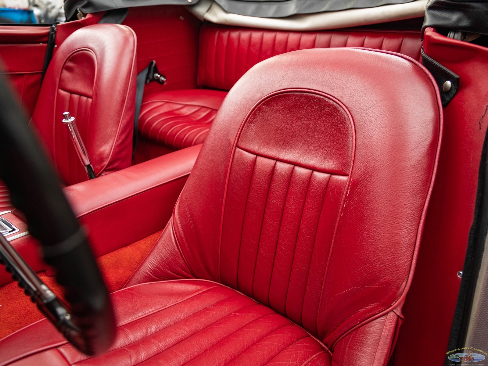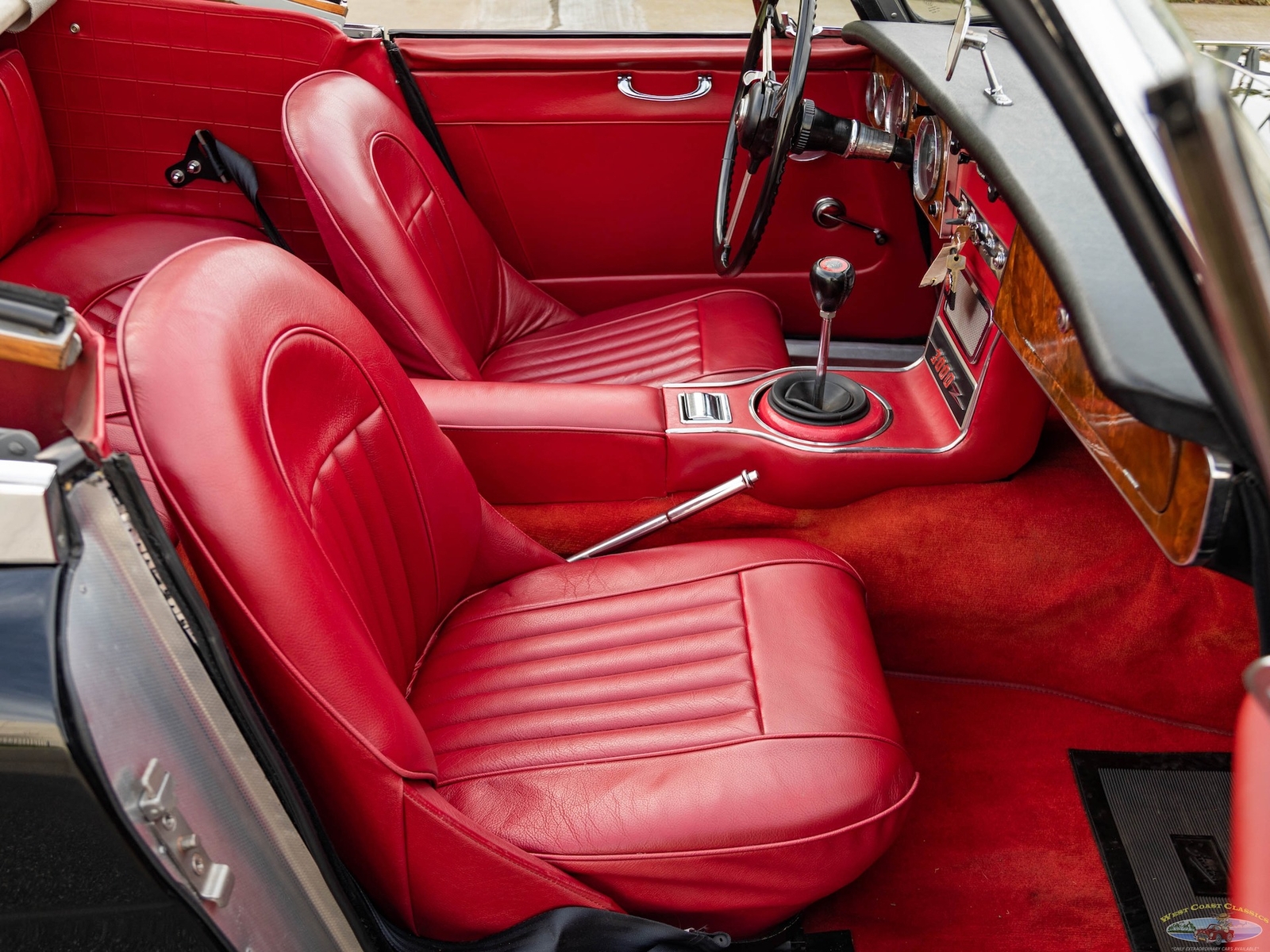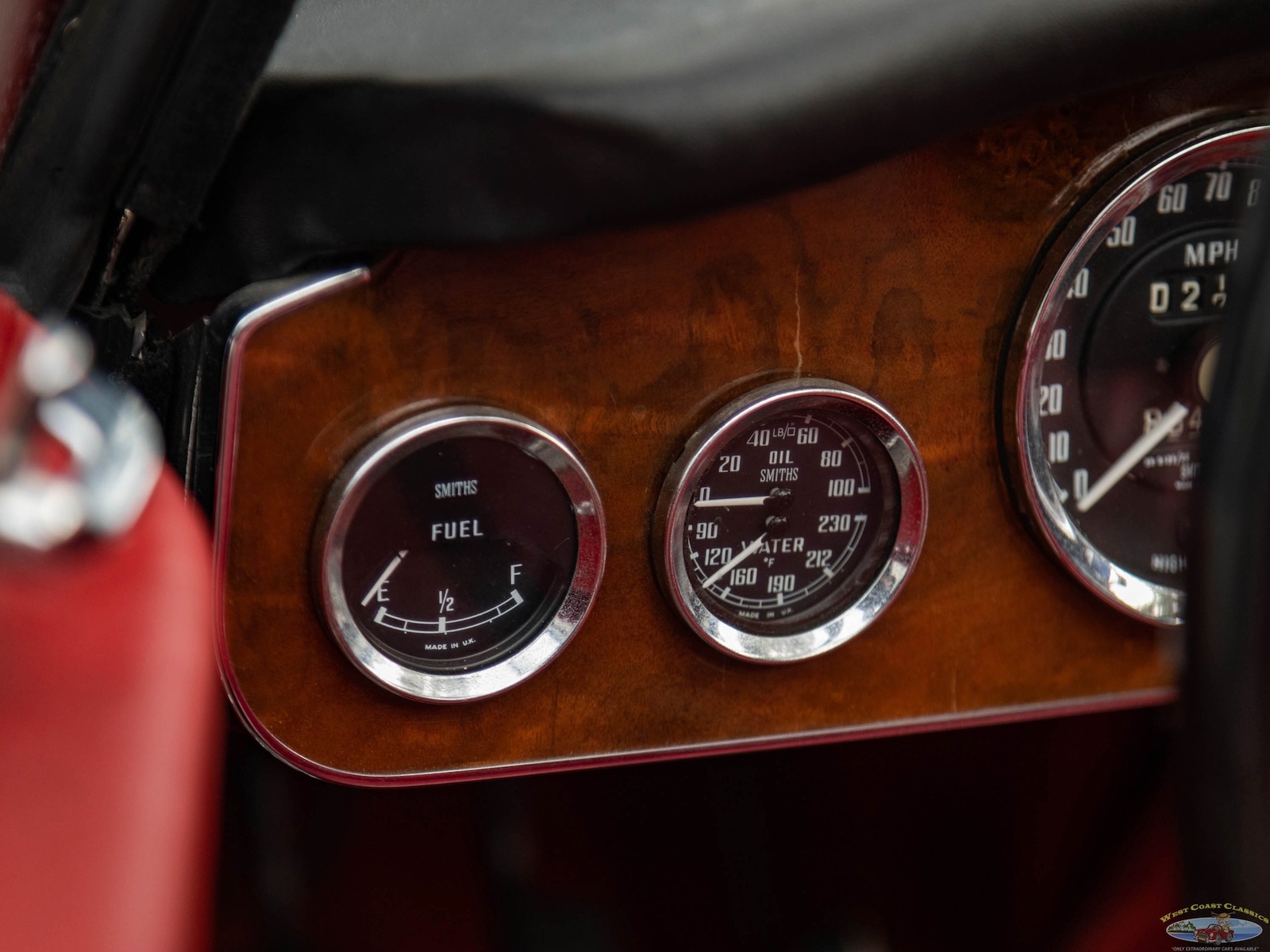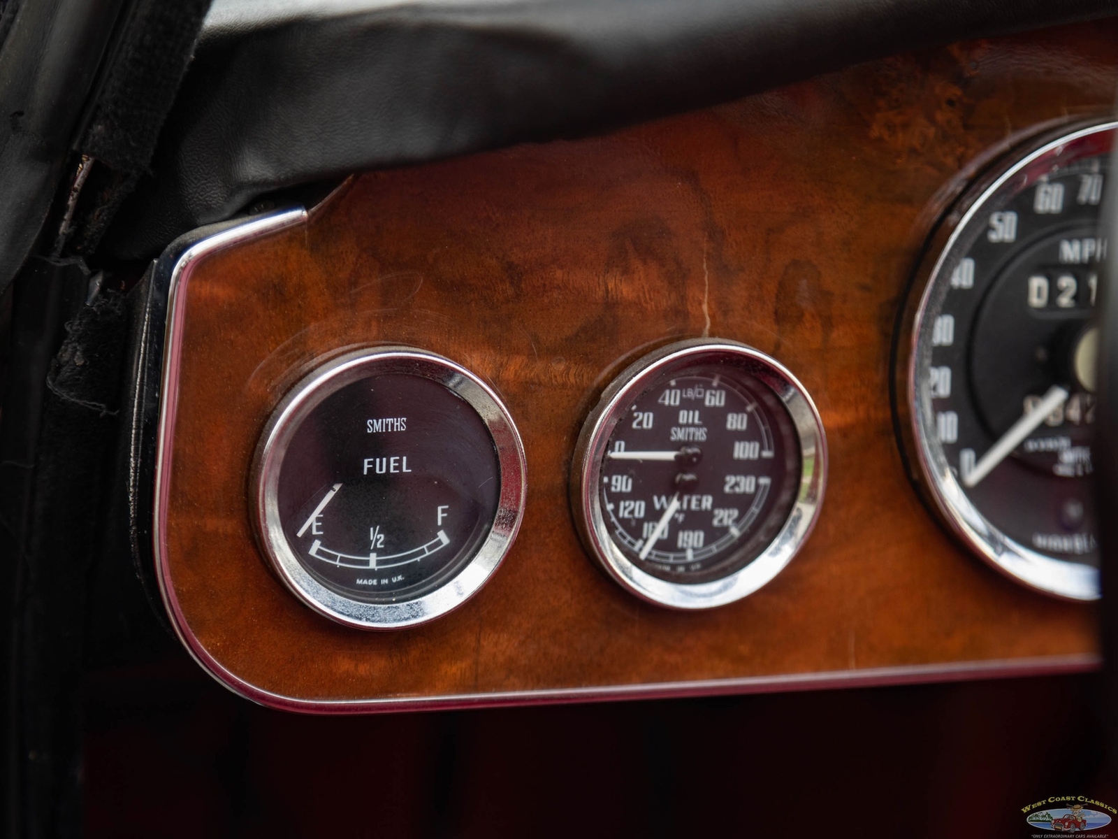 The car looks extremely impressive and is certainly of 'show quality' presented in this highly striking color combination with completely original specifications throughout including the original 'Smiths' gauges which are all in correct working order! The matching Black soft top is also obviously in as new shape, both functionally and otherwise and the cars chrome wire 'knock off' wheels are all in as new condition also with no curb rash or marks and the spare wire wheel and knock off mallet are in their right places in the trunk!