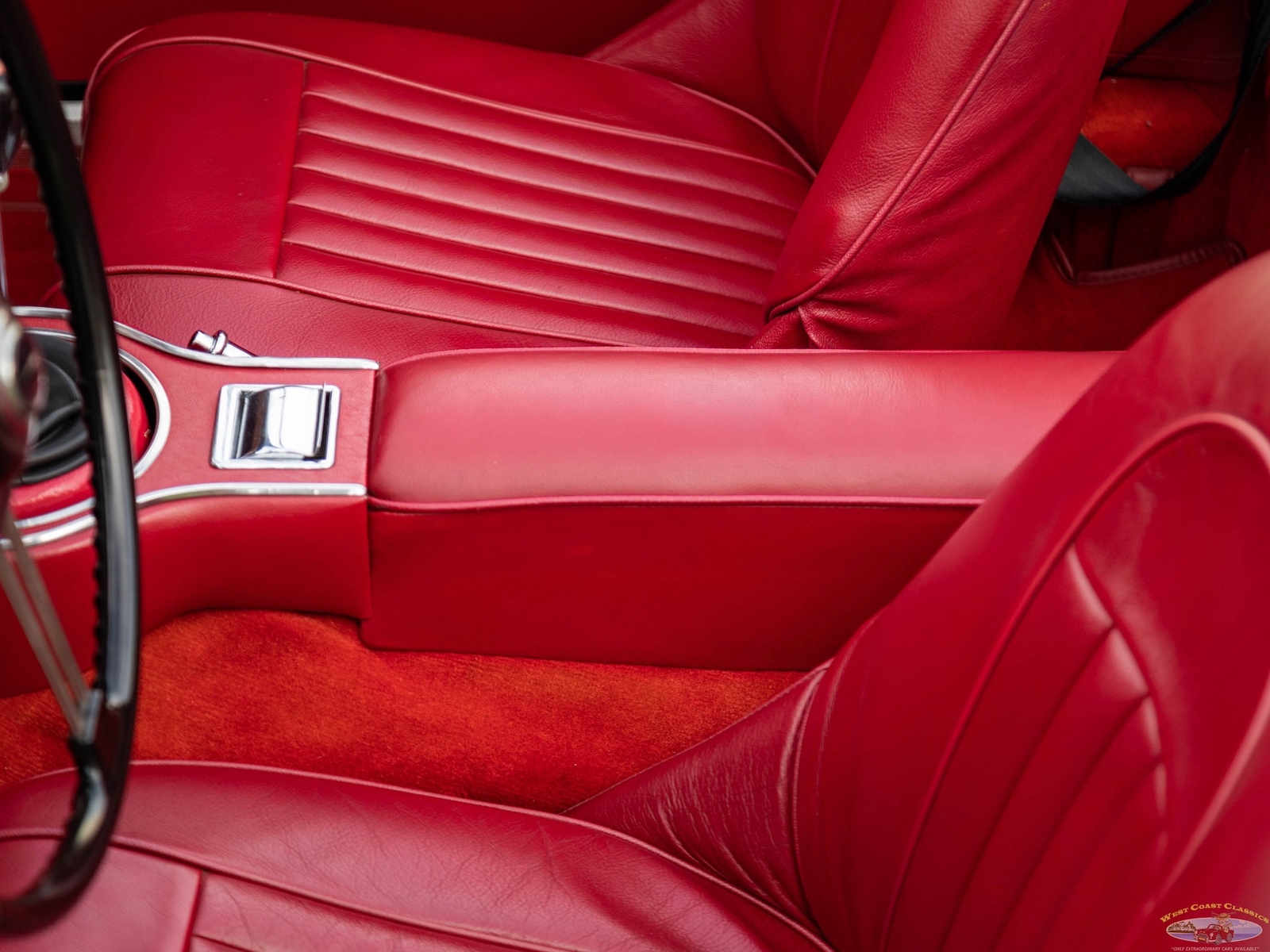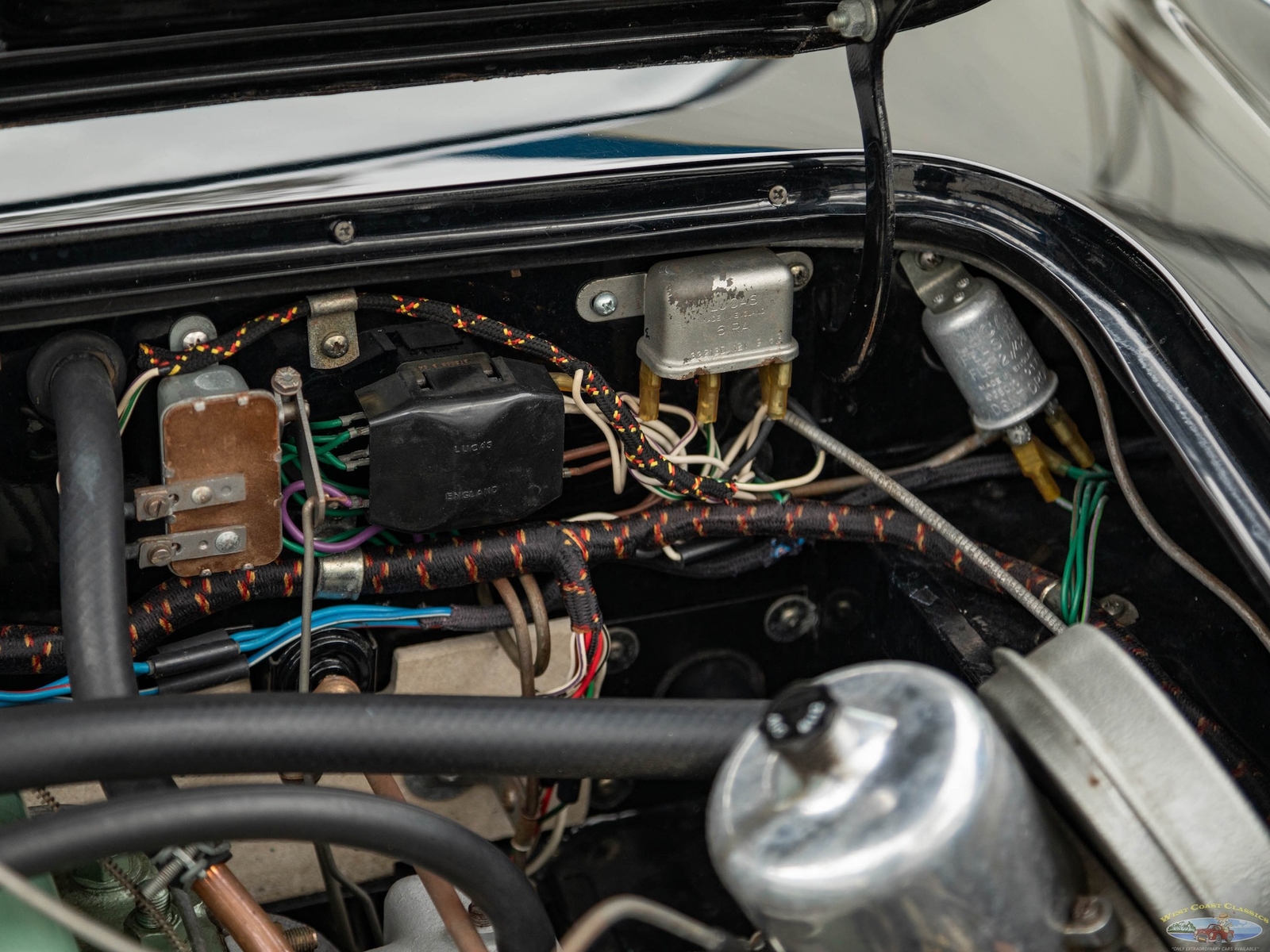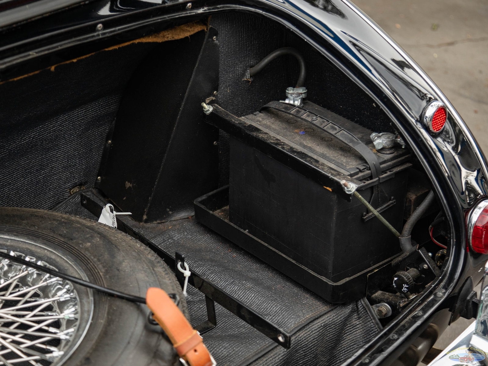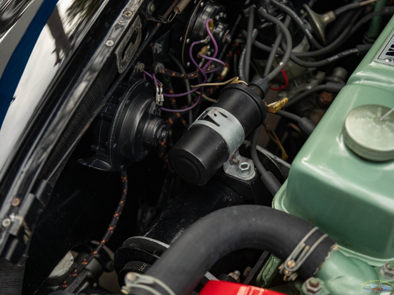 The car looks extremely impressive and is certainly of 'show quality' presented in this highly striking color combination with completely original specifications throughout including the original 'Smiths' gauges which are all in correct working order! The matching Black soft top is also obviously in as new shape, both functionally and otherwise and the cars chrome wire 'knock off' wheels are all in as new condition also with no curb rash or marks and the spare wire wheel and knock off mallet are in their right places in the trunk!