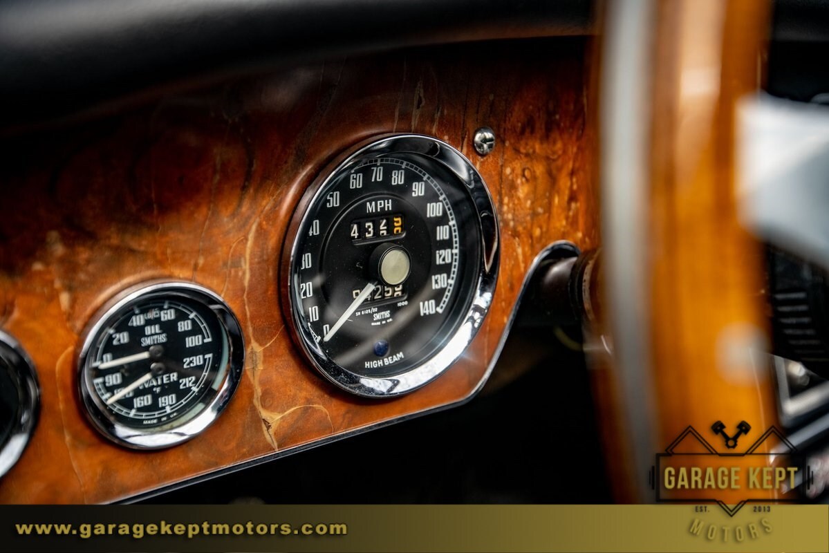As a Mark III model, this car features the updated dashboard, which features wood trim. Smiths gauges that have black faces and white digits keep track of engine vitals, shiny panels of toggle switches control functions like the overdrive, wipers, and lighting, and motoring club and rallye plaques are mounted on the dashboard. The interior has been well kept since restoration from the carpet to the seats and dash trim, though some of the wood veneer is showing a bit of age.