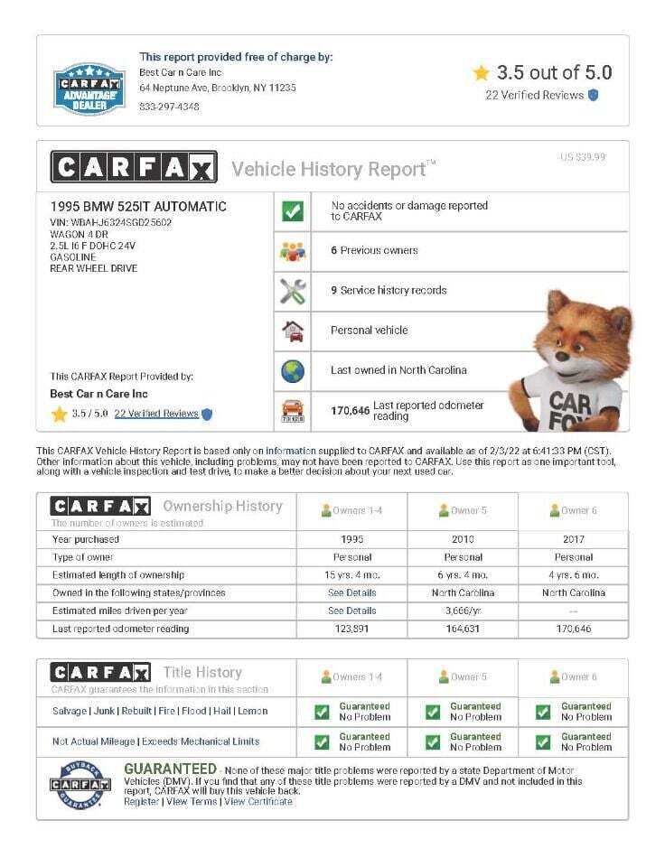 GORGEOUS 1995 BMW 525IT TOURING SPORT WITH 170652 ORIGINAL MILES. AMAZING COLOR COMBINATION, SUPER RARE E34 WAGON IN PRISTINE CONDITION, UPGRADED WITH M WHEELS, DRIVES NEW, NO ANY ISSUES. A/C ICE COLD, UPGRADED SONY HD-RADIO SOUND. NON-SMOKER ADULT DRIVEN BIMMER, NEVER SEEN SNOW, ALWAYS GARAGE KEPT. GREAT CHANCE TO OWN MASTERPIECE OF GERMAN CAR INDUSTRY, VERY HARD TO FIND, DO NOT LOSE IT AGAIN. CLEAN CARFAX REPORT, PERFECT HIGH SCORE AUTOCHECK. WE FINANCE. ANY CREDIT. WE DO TRADES. WARRANTY. WE SHIP ALL OVER 48 STATES AND ANY WORLDWIDE PORT.