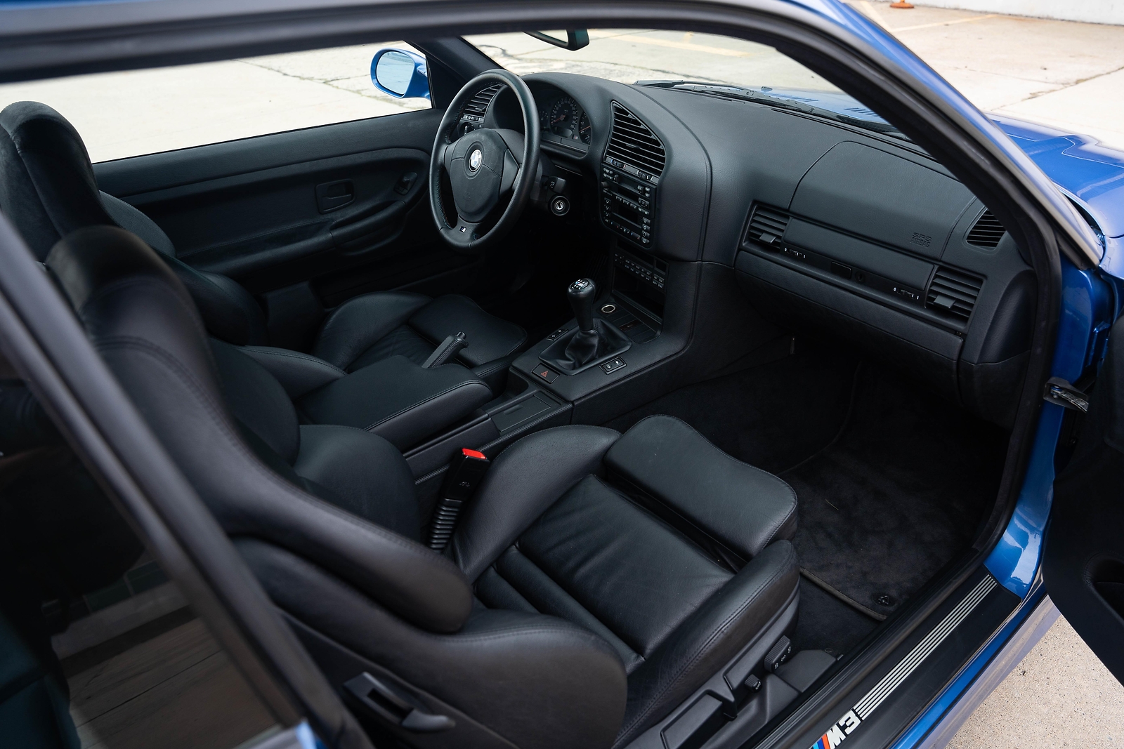 In June 1997, this M3 Evolution Coupe, chassis # WBSBG91060EW39311, was delivered new to Valencia, Spain, in a rare left-hand drive configuration. The car left the factory wearing the stunning Estoril Blue Metallic exterior and an extended leather black buffalo interior. It is reportedly 1 of only 1,799 in this configuration produced. It was also very generously optioned with limited-slip differential, heated seats, a headlight cleaning system, rear sunblind, park distance control, electric sunroof, automatic climate control, front power windows, and a pass-through rear seat.