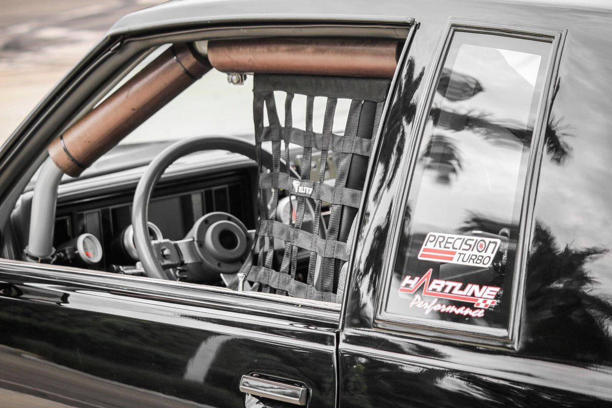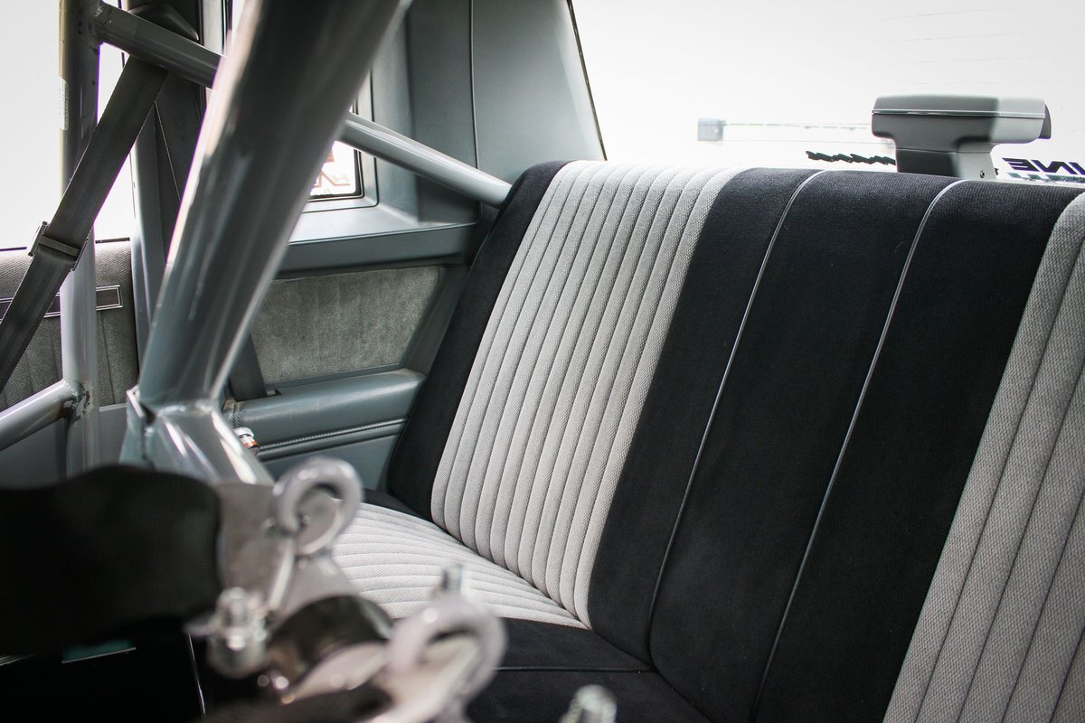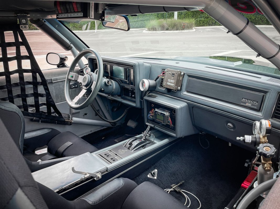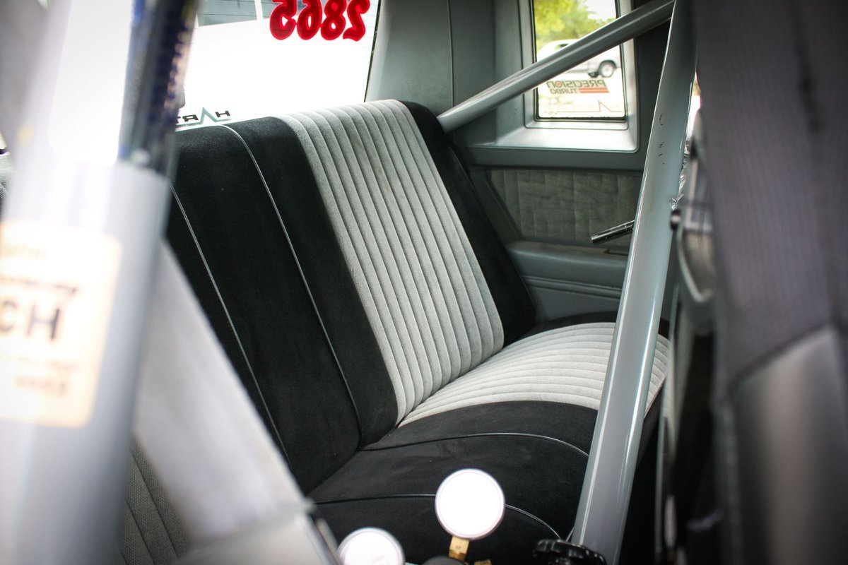 The cabin houses Corbeau racing seats and a two-tone factory rear bench and features metal door panel inserts as well as a full roll cage. The driver's seat is fitted with an Elite five-point racing harness, and additional equipment includes an NLR AMS-1000 boost controller, an aftermarket shifter, a parachute release lever, a FAST XFI 2.0 ECU, and a Speedwire Systems overhead ignition switch panel relay controller mounted in the glove box. This is a Full Glass Car, with power windows. A five-gallon fuel cell, a fuel pump, and a 16-volt battery are fitted in the trunk. The three-spoke steering wheel features a transbrake button and fronts a digital instrument cluster and AutoMeter gauges for oil pressure, transmission temperature, and boost pressure. A Dedenbear RPM switch is mounted on the dashboard and set to shift at 6,800-rpm.