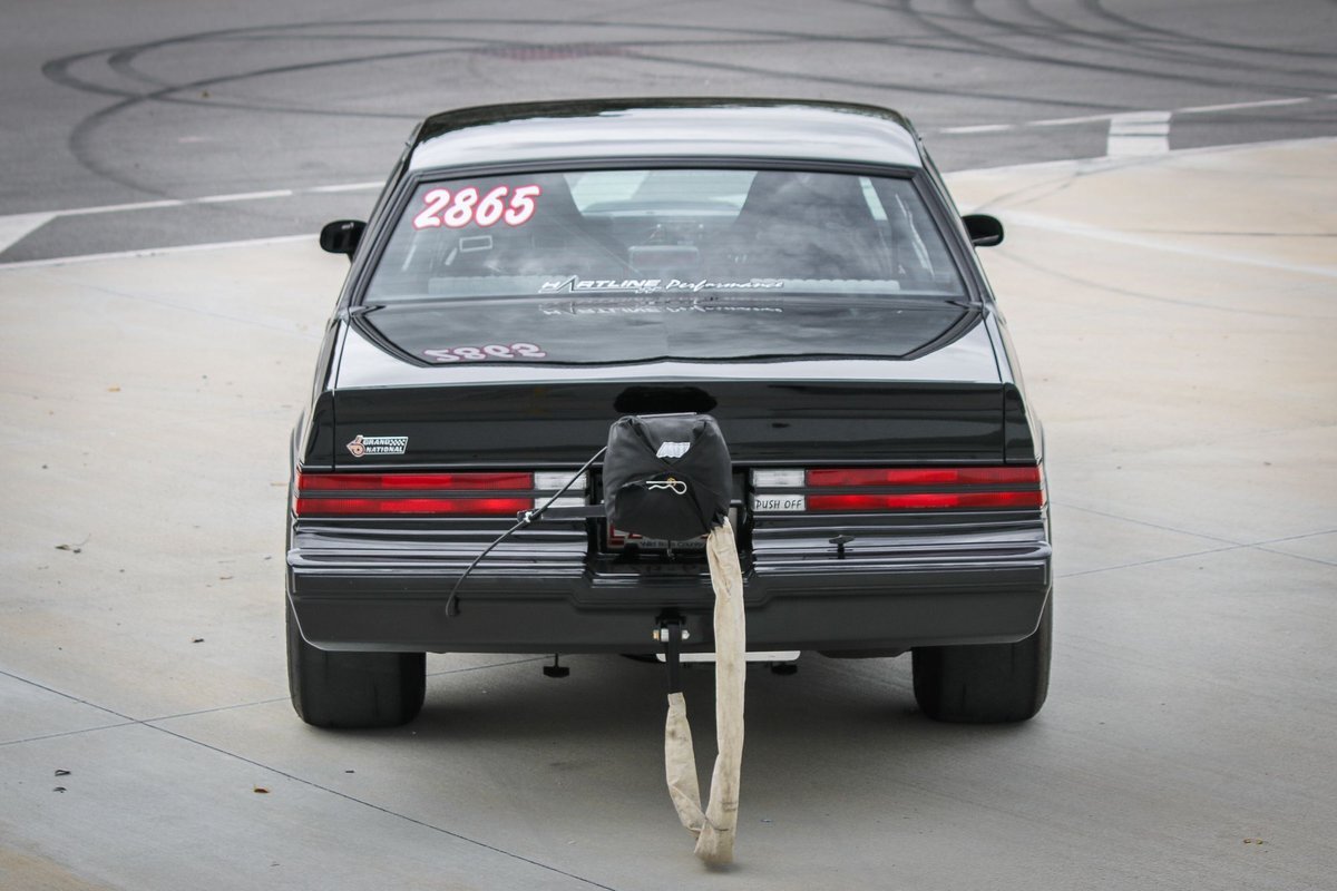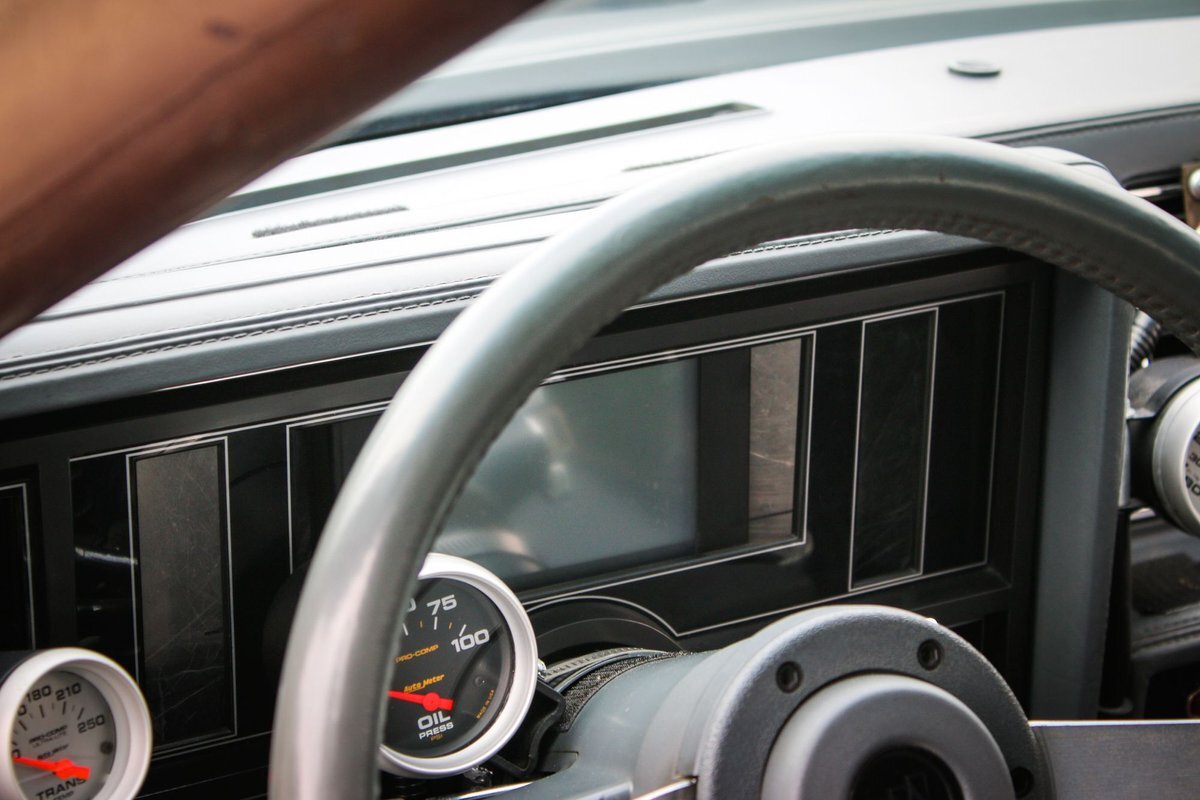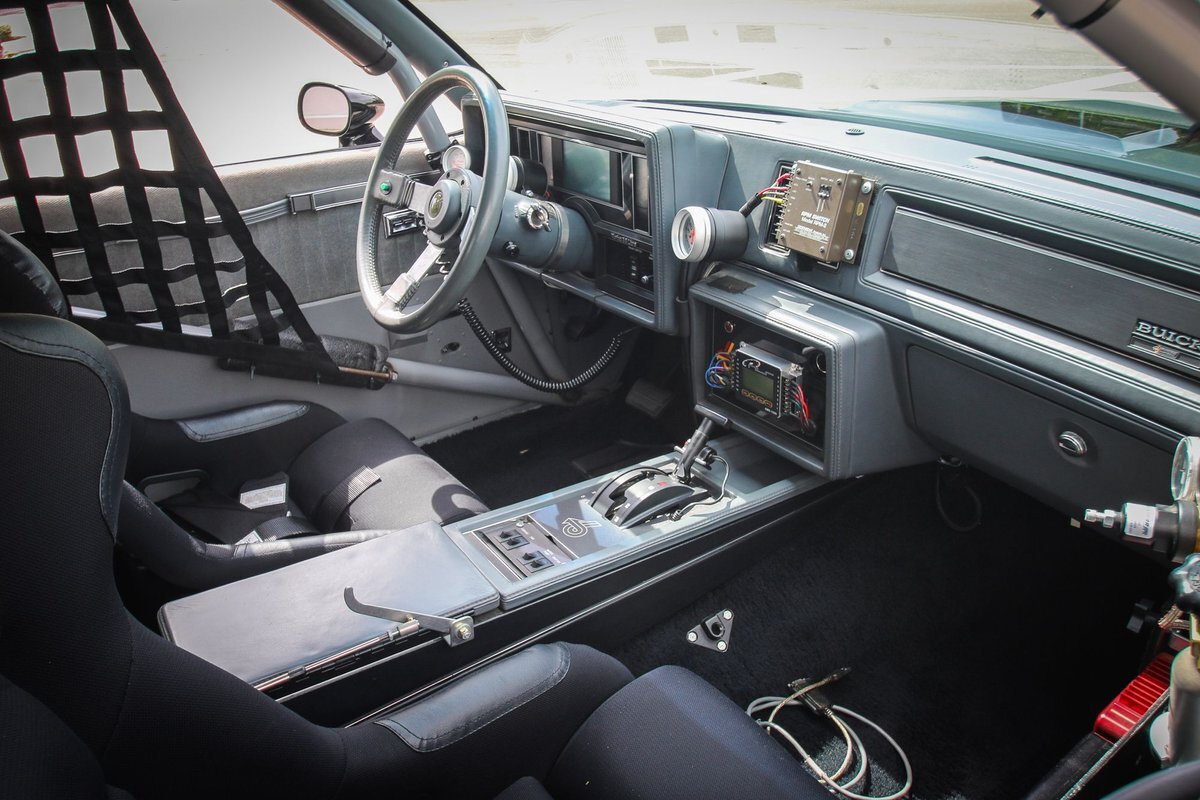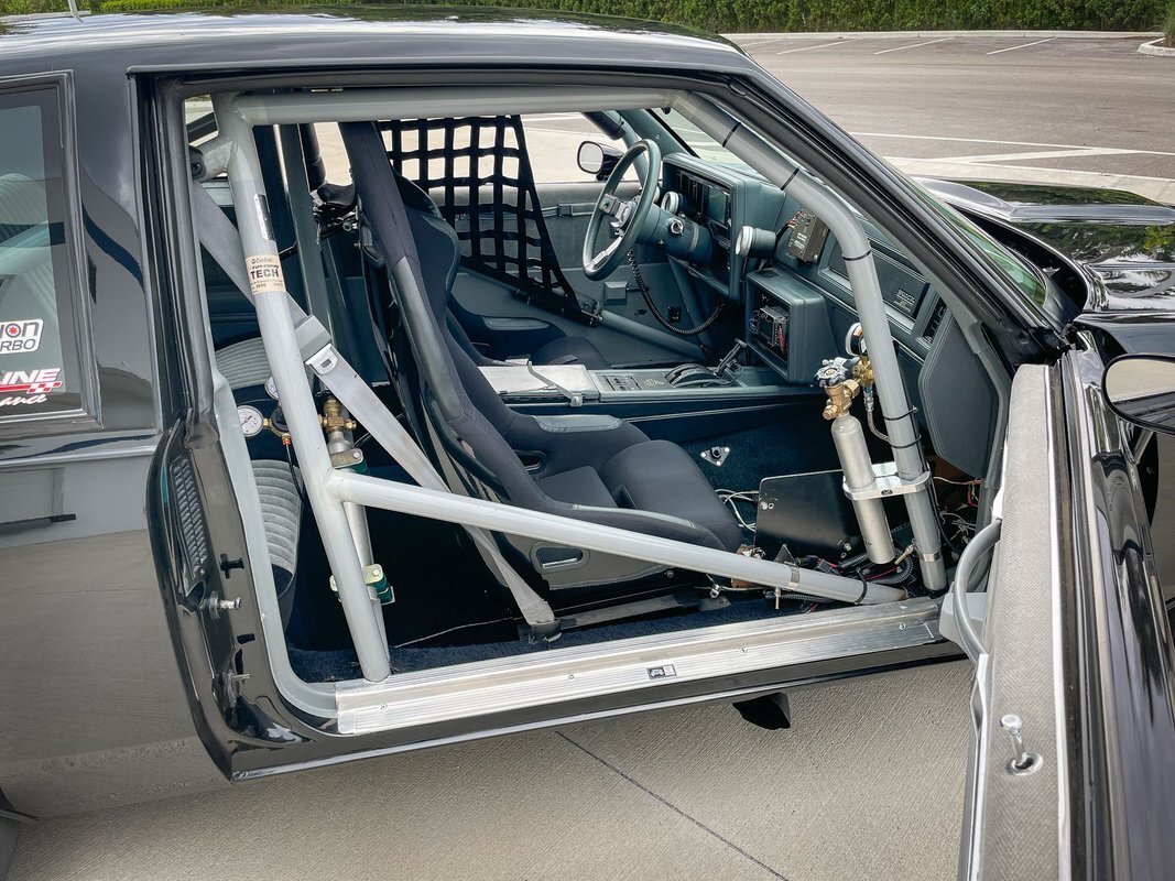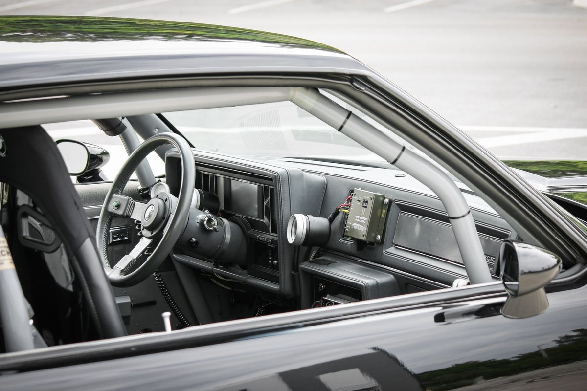 The cabin houses Corbeau racing seats and a two-tone factory rear bench and features metal door panel inserts as well as a full roll cage. The driver's seat is fitted with an Elite five-point racing harness, and additional equipment includes an NLR AMS-1000 boost controller, an aftermarket shifter, a parachute release lever, a FAST XFI 2.0 ECU, and a Speedwire Systems overhead ignition switch panel relay controller mounted in the glove box. This is a Full Glass Car, with power windows. A five-gallon fuel cell, a fuel pump, and a 16-volt battery are fitted in the trunk. The three-spoke steering wheel features a transbrake button and fronts a digital instrument cluster and AutoMeter gauges for oil pressure, transmission temperature, and boost pressure. A Dedenbear RPM switch is mounted on the dashboard and set to shift at 6,800-rpm.