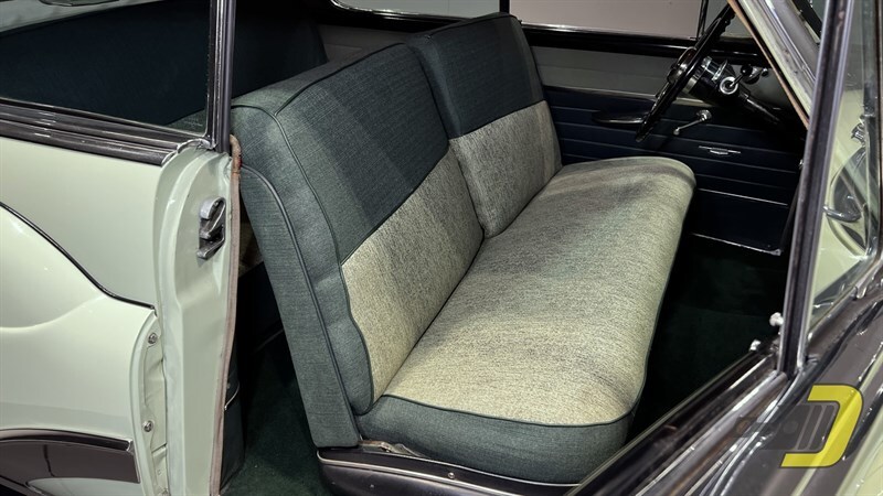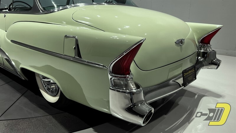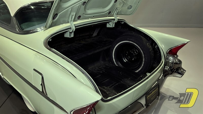 Atop the metal work is an attractive light green and white paint scheme. The car really wears the colors well, especially with all the great chrome and stainless trim. It has also been lowered and shod with 15” Coker Classic wide whitewalls that tie into the roof color. Note the Cadillac wheel covers too.
