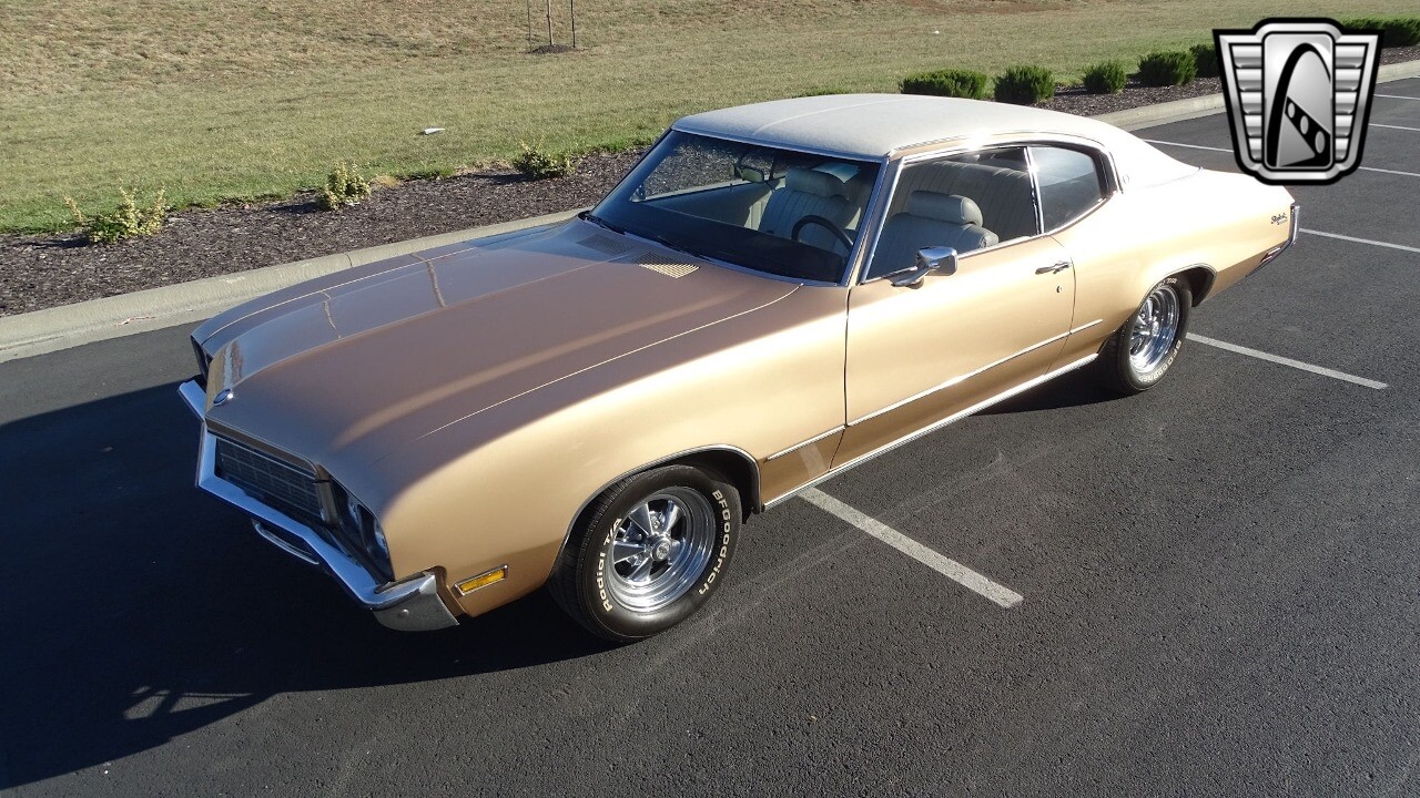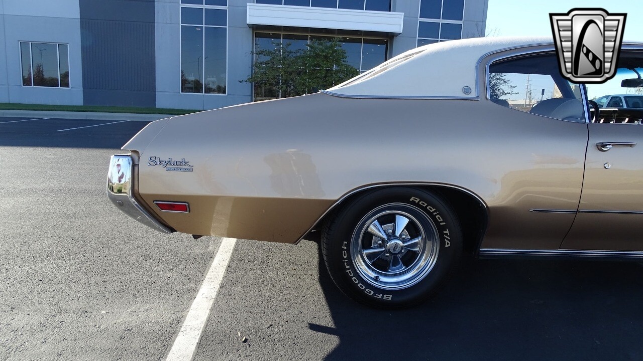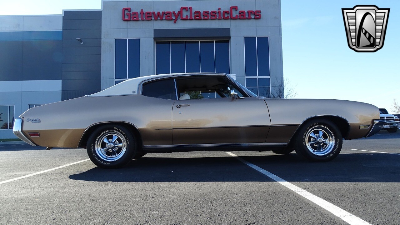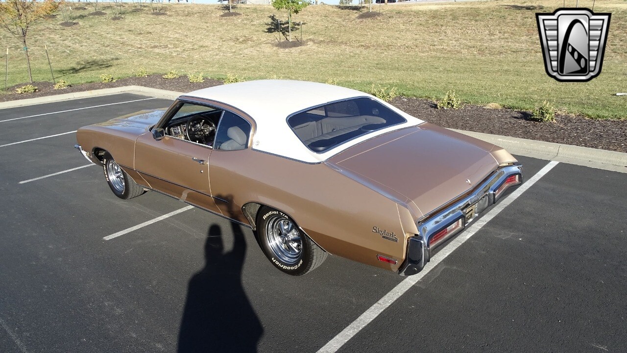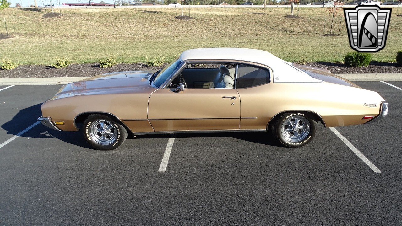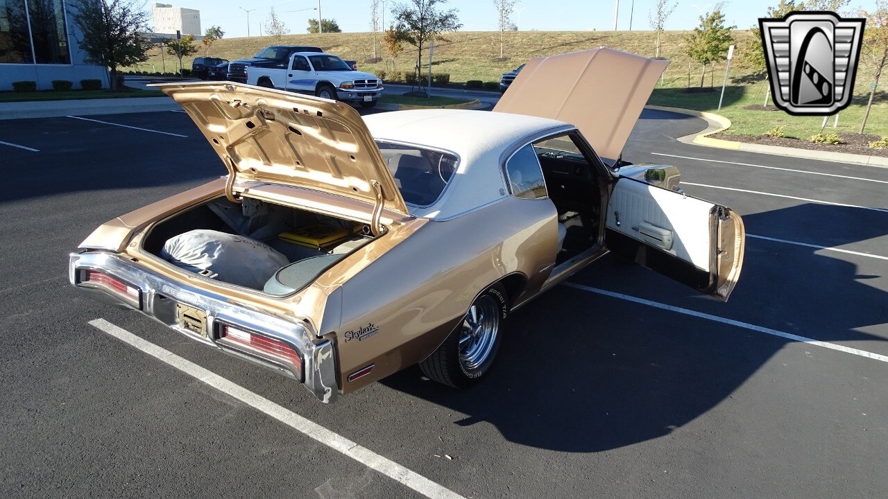 Gateway Classic Cars of Kansas City is proud to present this stunning 1972 Buick Skylark. This stunning Buick Skylark has been under the same ownership since 2005 and is ready for its new loving owner. It is powered by a strong 350 2BBL V8 paired to a smooth shifting 3 speed automatic. This Buick has been finished in a gorgeous Gold with an awesome white vinyl interior and a matching white vinyl top. This Skylark contains tons of creature comforts such as A/C, Power steering, Power Brakes, and the current owner has also added a Viper Alarm that can be controlled using a key fob. The owner has also added an aftermarket radio in case you prefer listening to music rather than the sound of that engine!