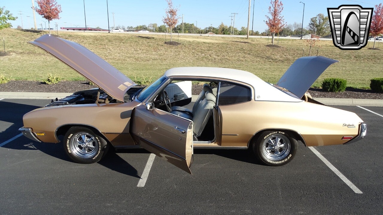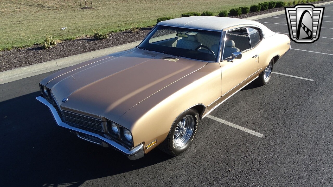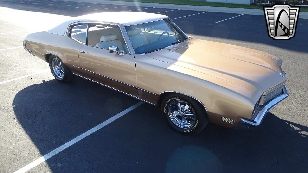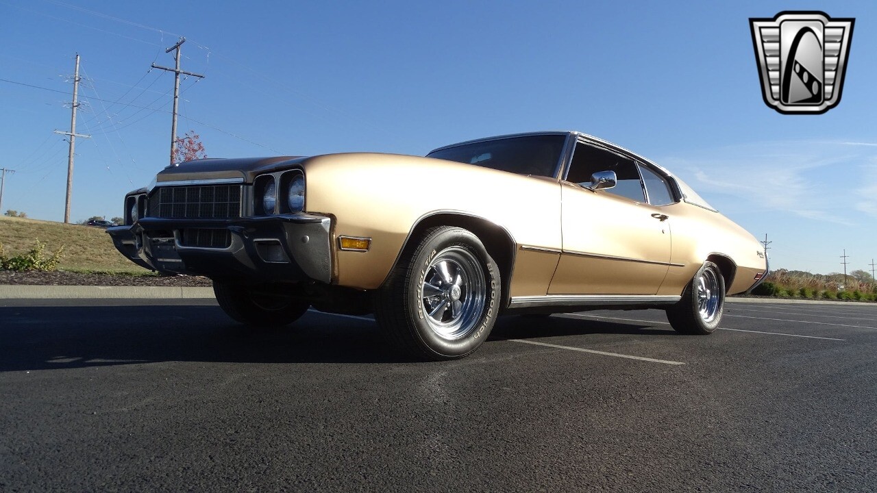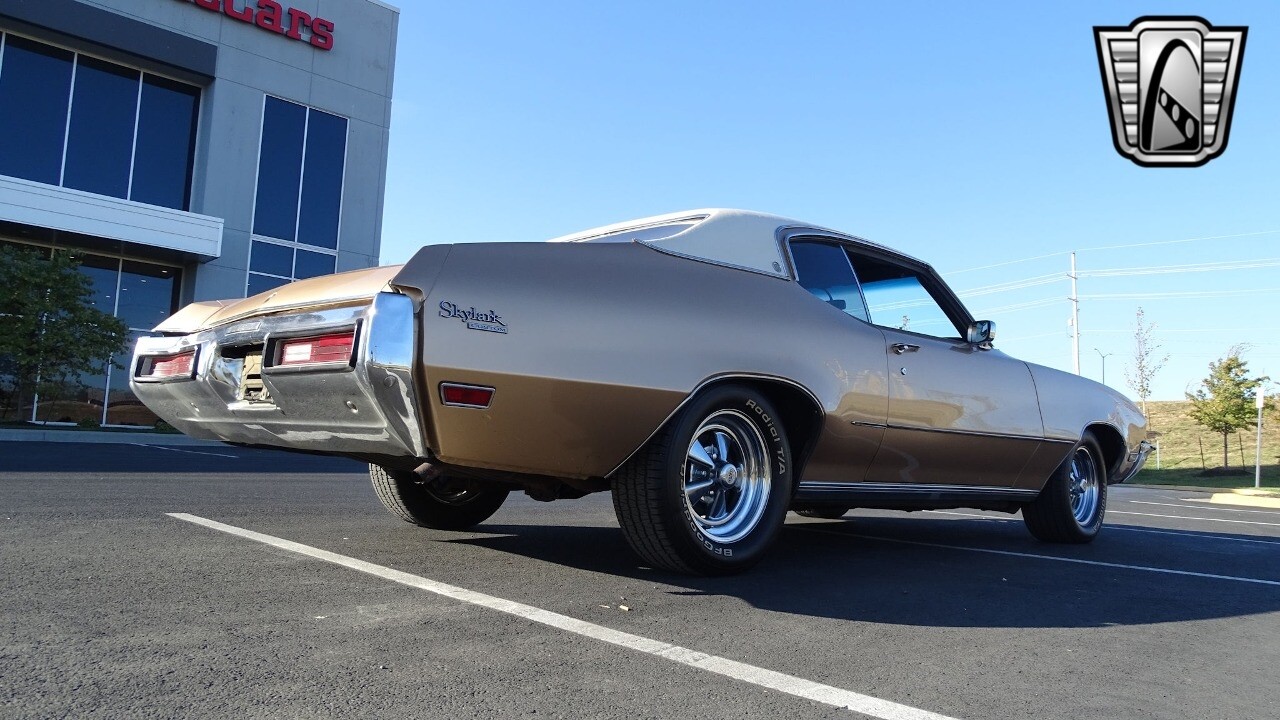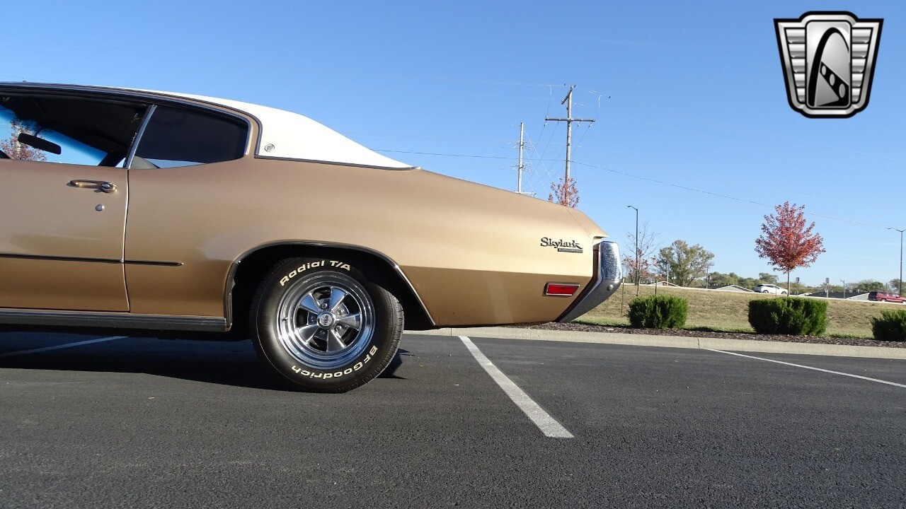 Gateway Classic Cars of Kansas City is proud to present this stunning 1972 Buick Skylark. This stunning Buick Skylark has been under the same ownership since 2005 and is ready for its new loving owner. It is powered by a strong 350 2BBL V8 paired to a smooth shifting 3 speed automatic. This Buick has been finished in a gorgeous Gold with an awesome white vinyl interior and a matching white vinyl top. This Skylark contains tons of creature comforts such as A/C, Power steering, Power Brakes, and the current owner has also added a Viper Alarm that can be controlled using a key fob. The owner has also added an aftermarket radio in case you prefer listening to music rather than the sound of that engine!