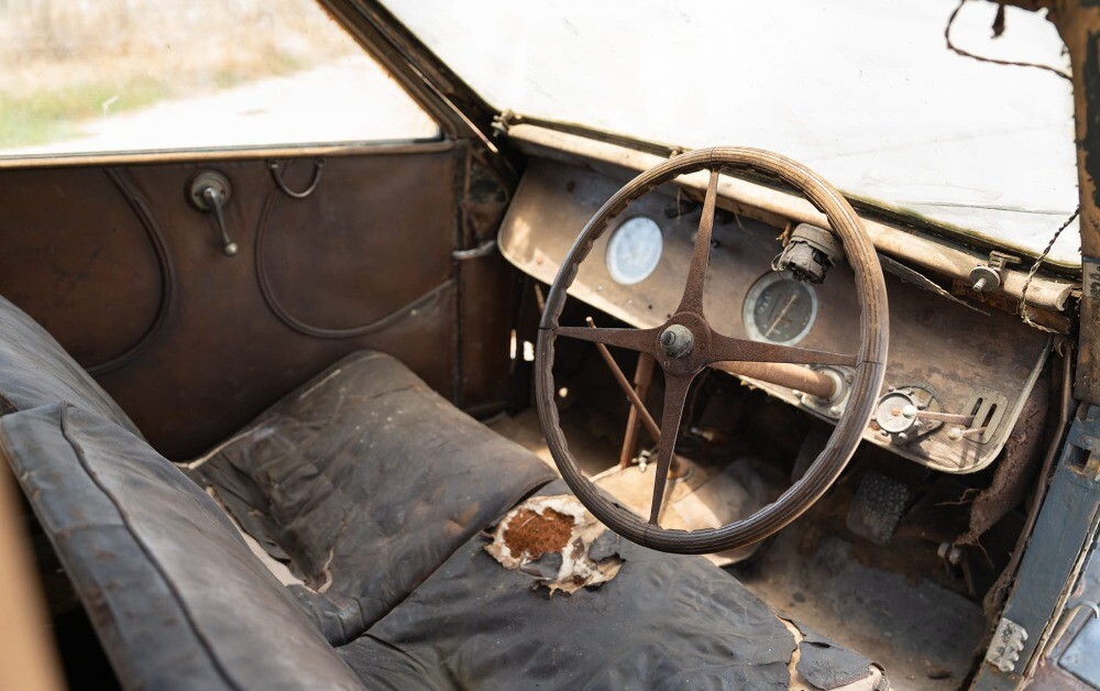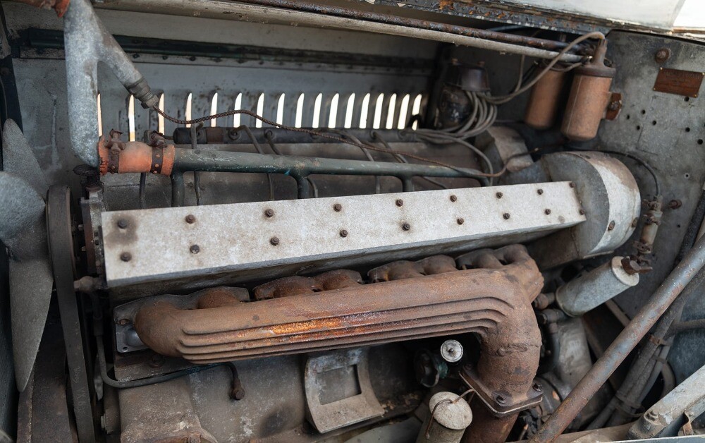 Today, 57422 presents as an exciting discovery among the precious few Type 57 Bugattis that remains in fundamentally original, unrestored condition. As a result of decades spent in storage, rarely seen original details have been preserved, including sections of original paint, glass, carpeting, and upholstery. Significantly, the Bugatti retains its matching-numbers engine (no. 310) per factory records on file, factory data tag, and Ventoux coachwork, which can be seen stamped with body no. 54 in several locations, including the trunk and fender box covers.