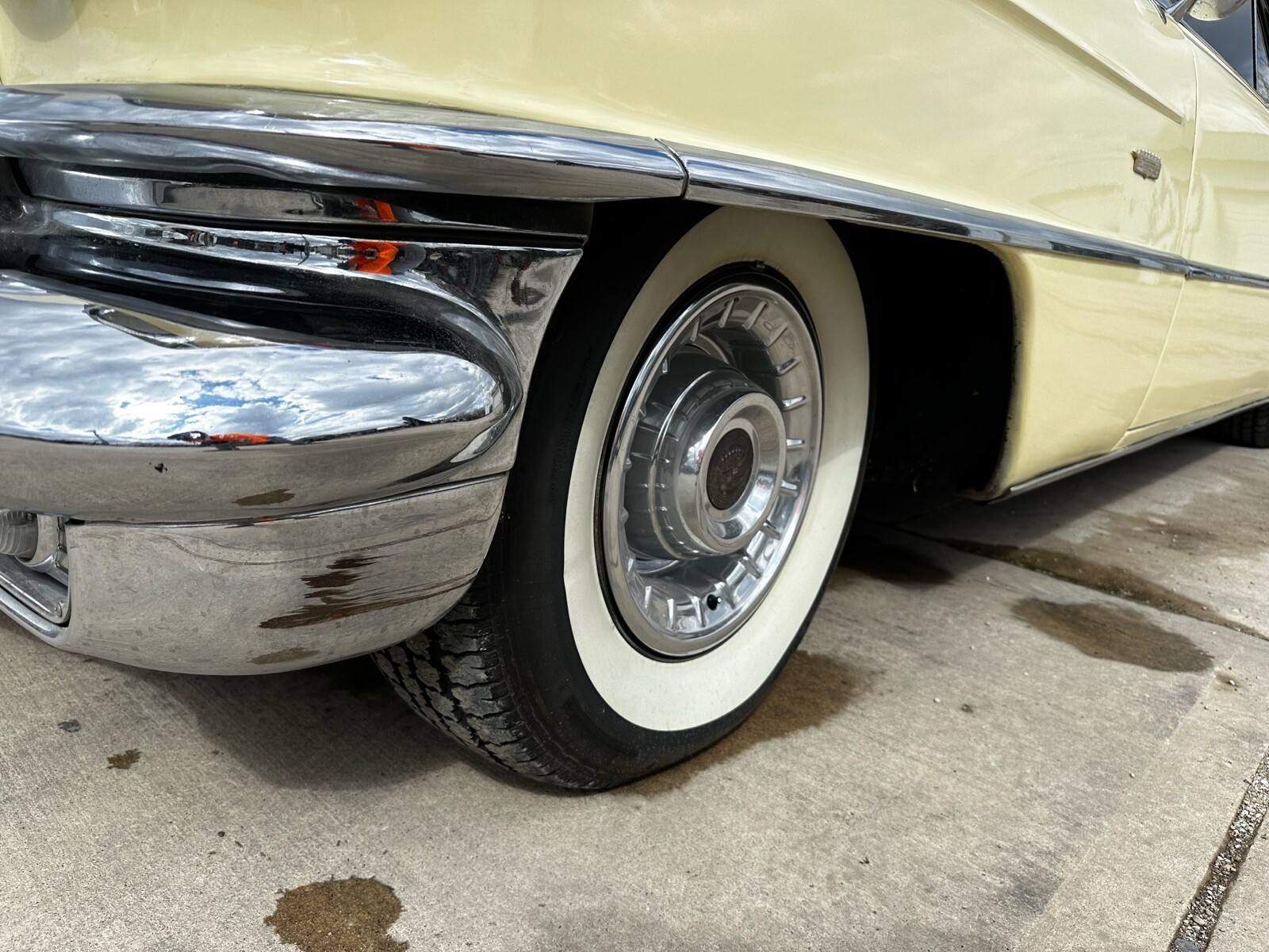I bought the caddy about 2 year’s ago and don’t drive it much, I believe it was probably restored late 90s early 2000s don’t actually know, runs and drives excellent the interior is in excellent condition as well newer radio digital dash ac blows cold, new injectors installed in the throttle body were just installed updated air cleaner and valve covers, all windows working, white walls are in great shape, carpet is in great shape, trunk is finish and battery has been relocated to trunk, there is a full Continental tire kit that is not pictured, but is painted to match that comes with the car, ask any questions at 816-805-8943 or email