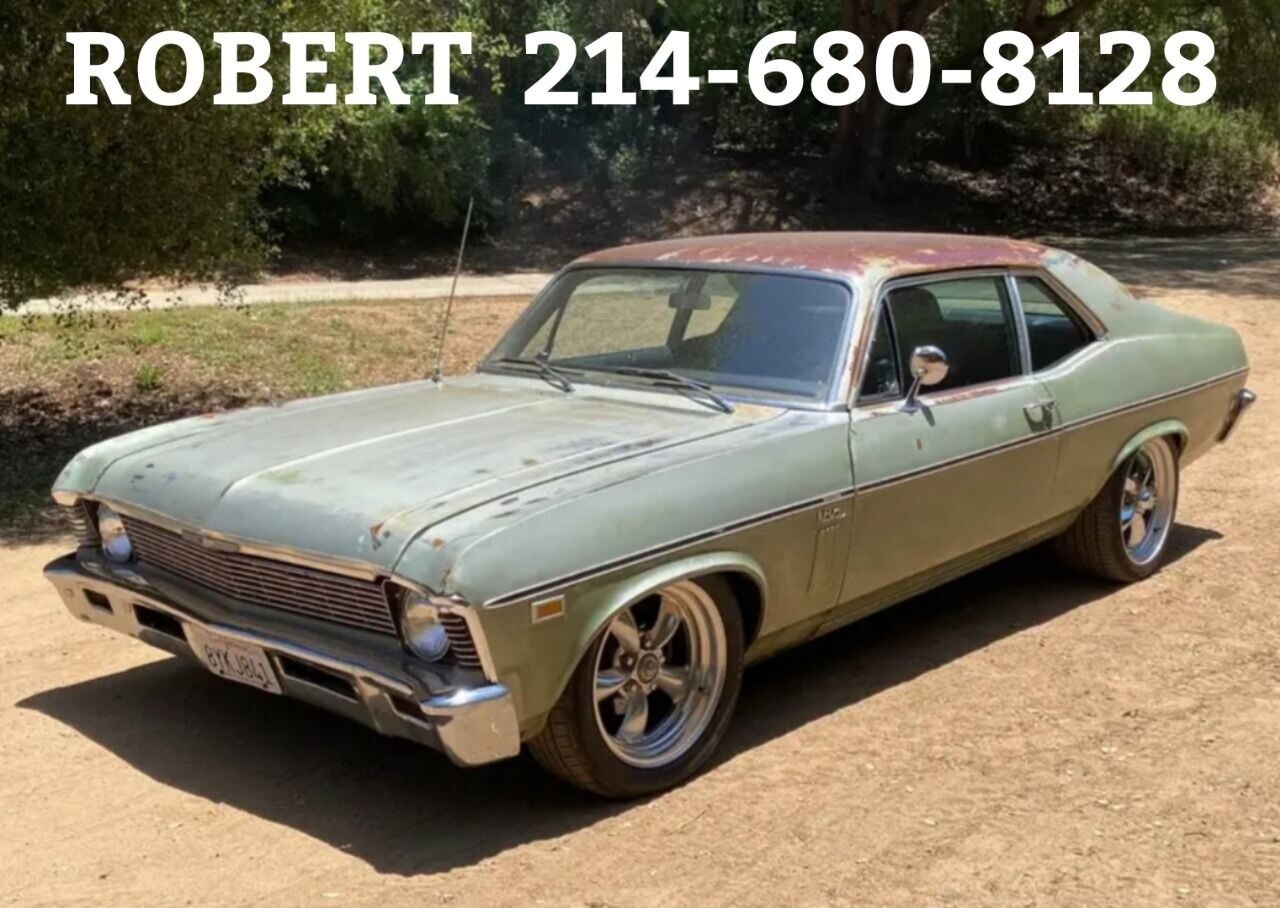 1969 Chevy Nova.. Runs & drives amazing. - Don't let the surface fade on the original paint fool ya. The body is solid and ready for a new look if so desired. Some folks prefer the classic worn look of the way it is now but that up to you. - Take a look at the car all the way around and see that it's not full of rust but actually clean & solid. It's been taken care of and functions fantastically. - Here is a list of just some upgrades.. Suspension: -hotchkins tubular arms -hotchkins dropped springs -hotchkins front sway bar -hotchkins rear sway bar -hotchkins dropped leaf springs -bilstein shocks all the way around Power brakes and power steering Slotted front rotors Limited slip 8.2 Eaton posi New gas tank Performance 350sbc Th400 transmission New trans cool lines Headers Electric fan Lokar shifter New bucket seats New carpet New headliner New dash pad New front door panels American racing wheels New floors Clean title Tags up too date - Can't go wrong with this machine. - CALL OR TEXT ANYTIME. ROBERT877-211-7157 - We offer help with services such as financing, global shipping and encourage professional independent vehicle inspections. All deposits are nonrefundable to hold a vehicle for any amount of time.