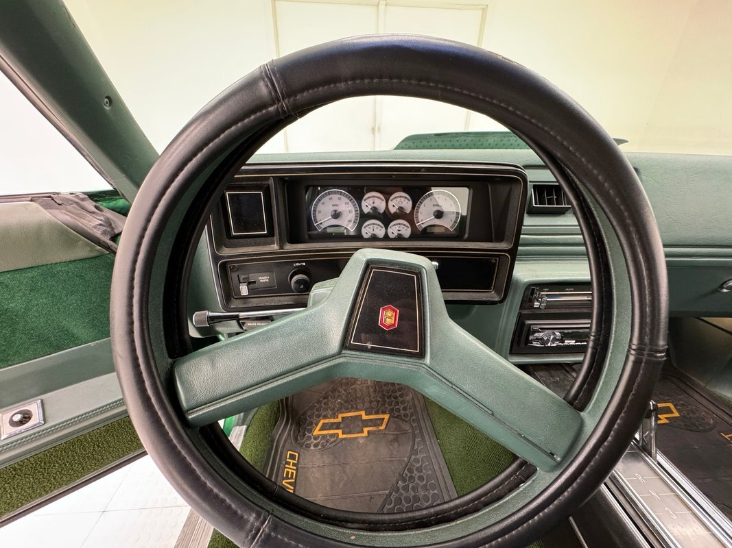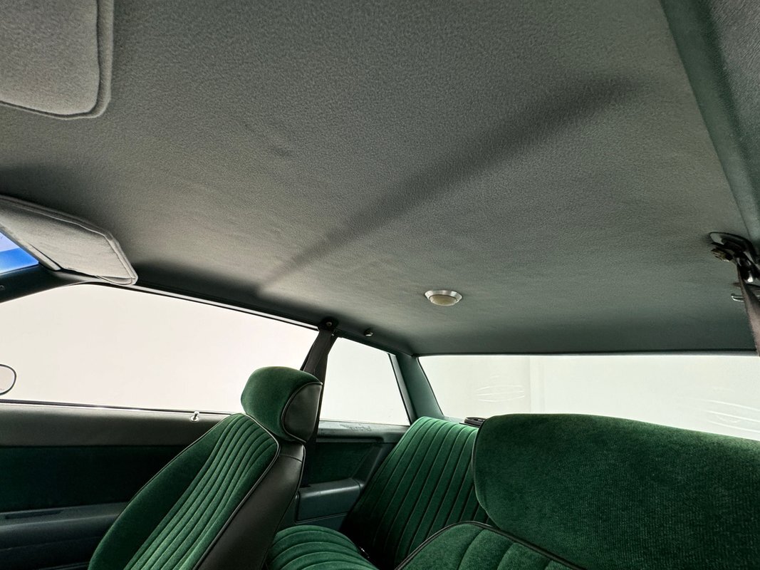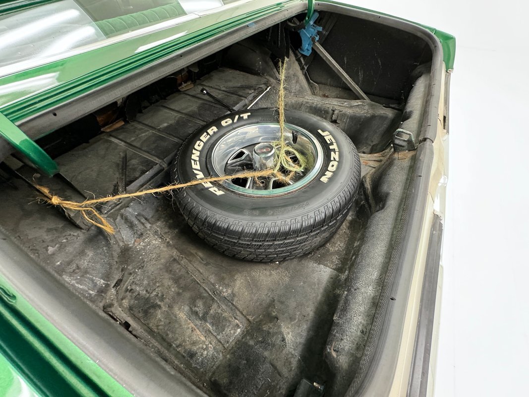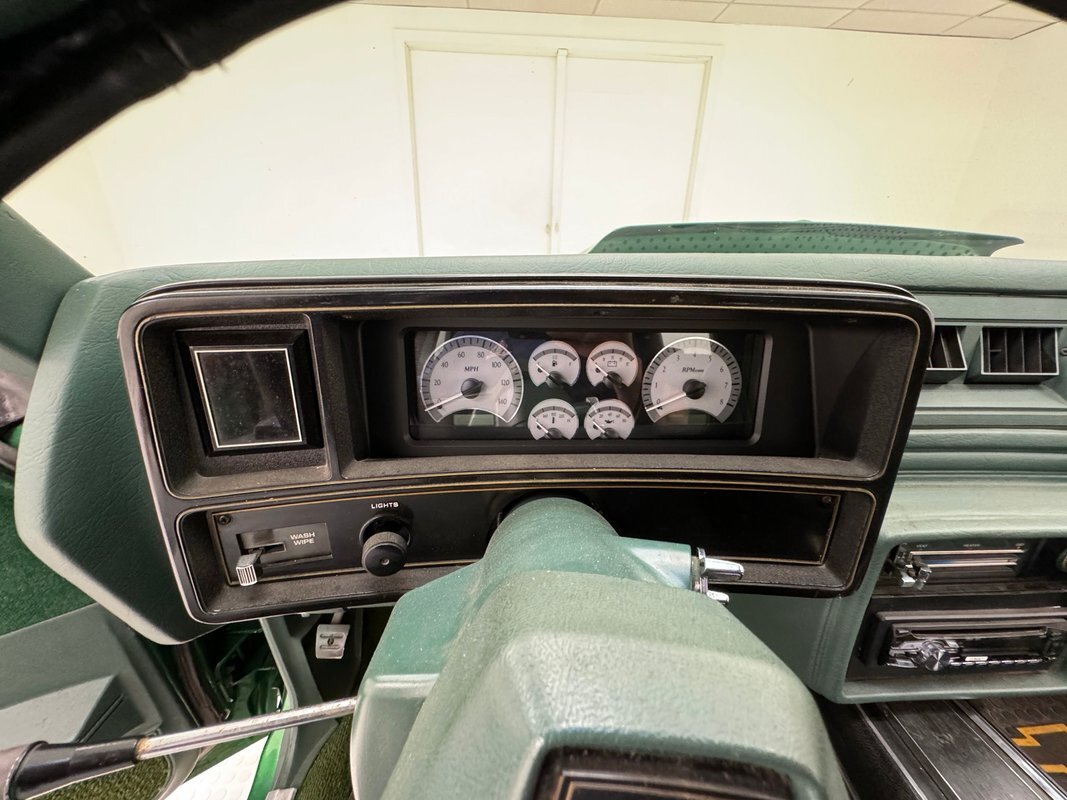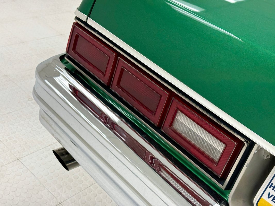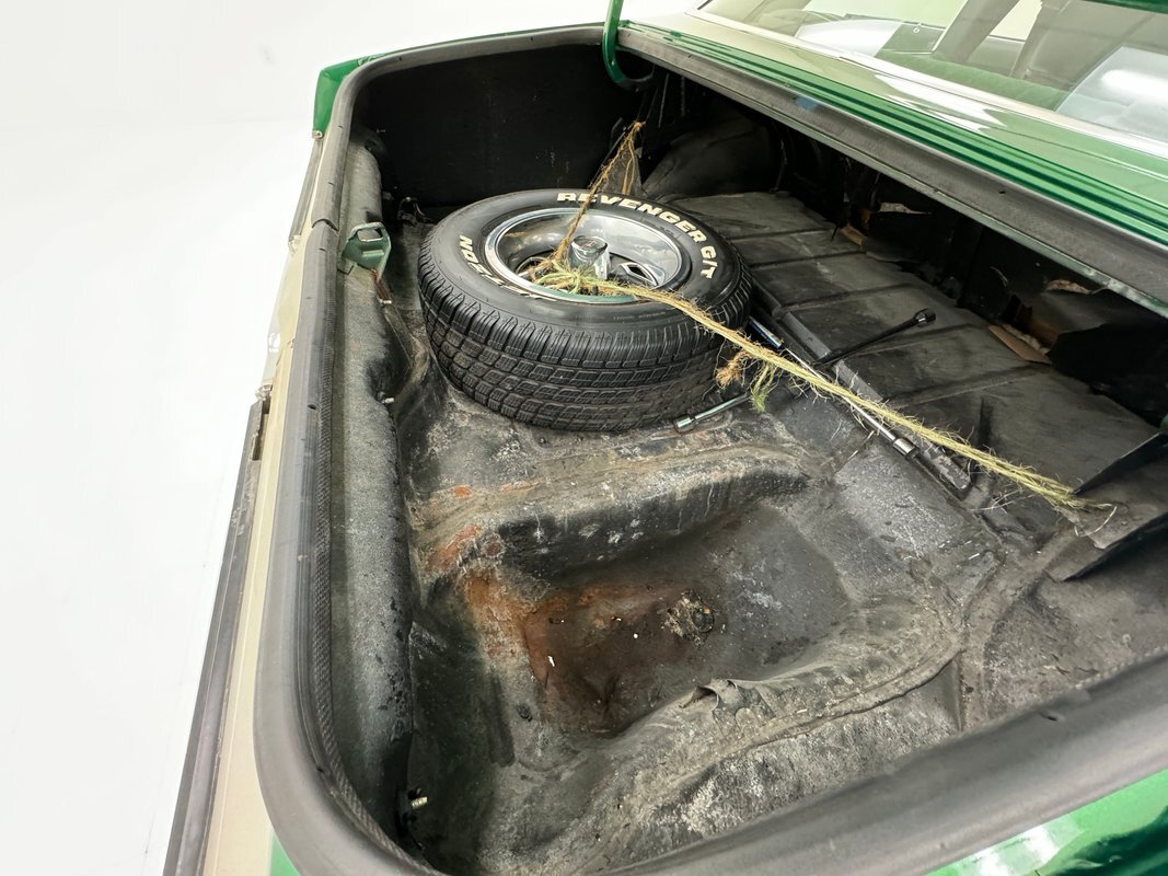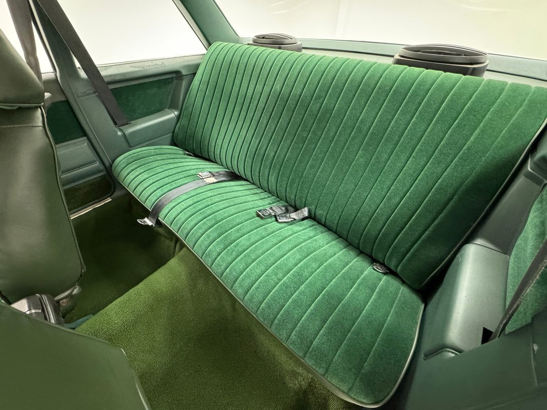 Two stage Green Metallic paint coats the car with near flawless coverage. A cowl hood rises behind the simple front fascia, a flat nosed basic layout of single headlights, a rectangle grille filled with smaller rectangles, and a hefty chrome bumper. Other than the slight rise of the cowl, all horizontal surfaces are flat and square and the car has great proportions. Long tail lights hover over a large chrome rear bumper below which we see two tailpipes that may have been borrowed from the Alaskan pipeline. 15-inch rally wheels hold staggered 60 series tires that give the car a slightly aggressive stance. For comparison, the rear tires are 3 inches taller and 3 1/2 inches wider than what would have been on the car in 1978. Some slight bubbling on a lower panel is the only flaw we noted.