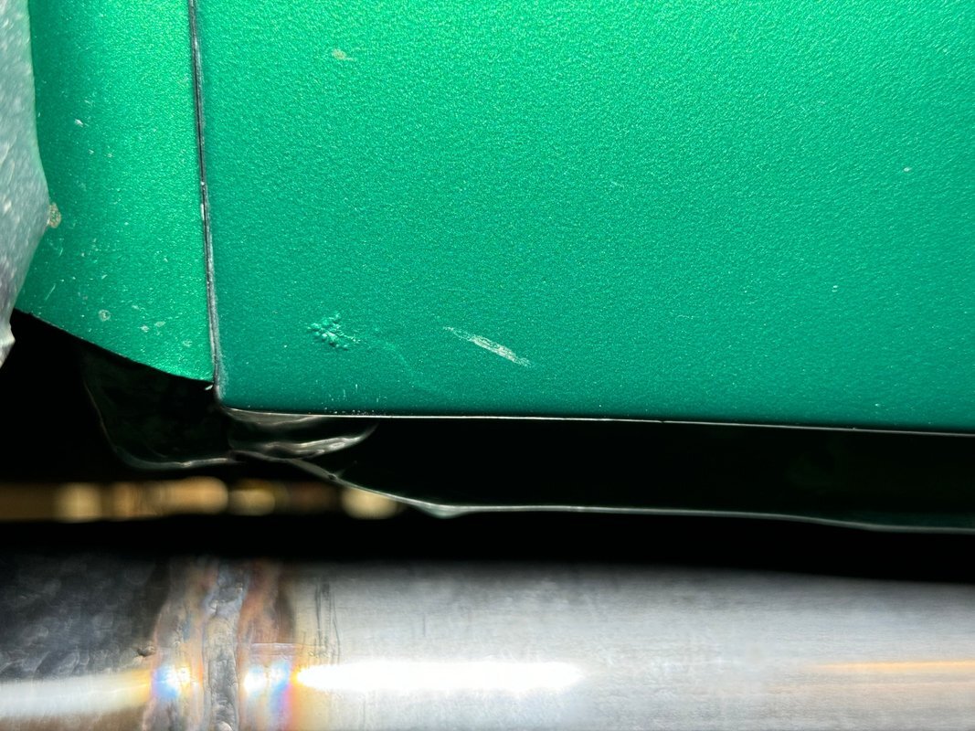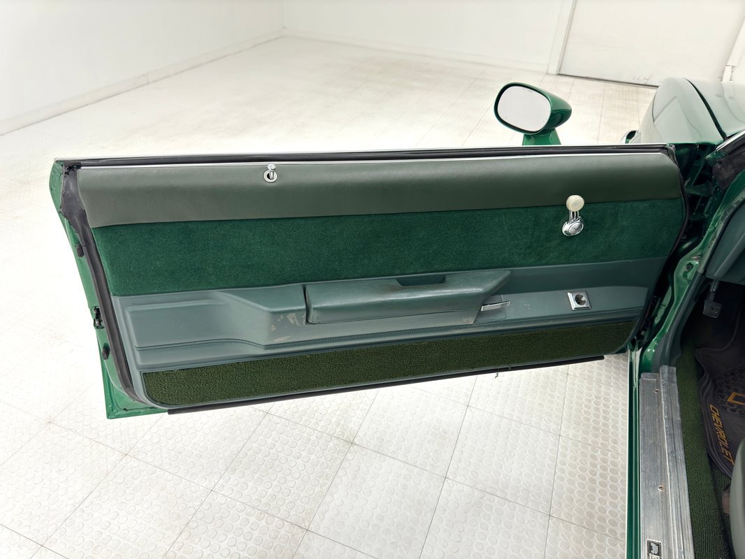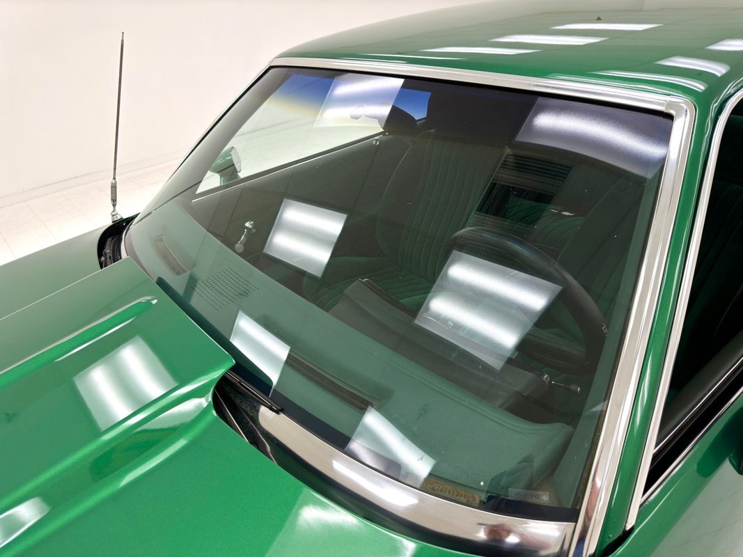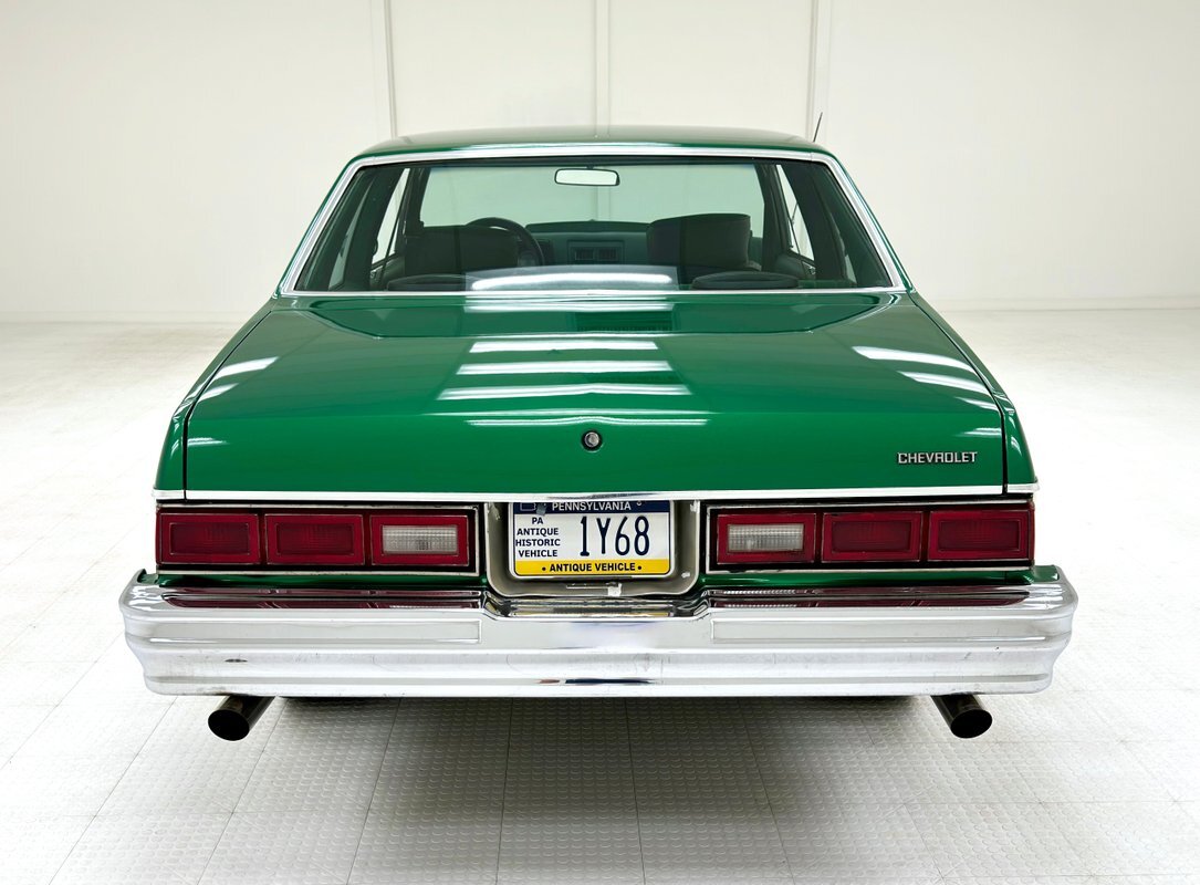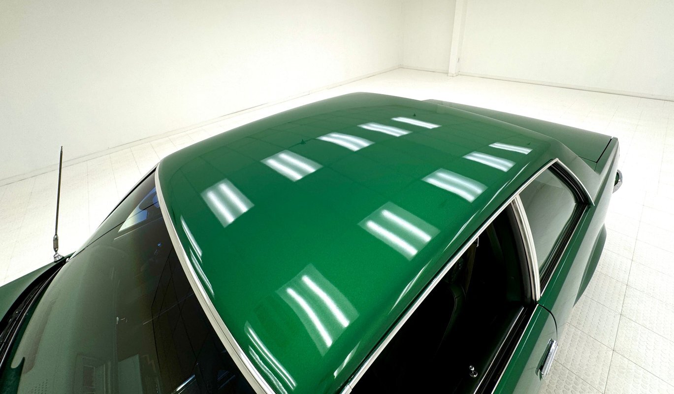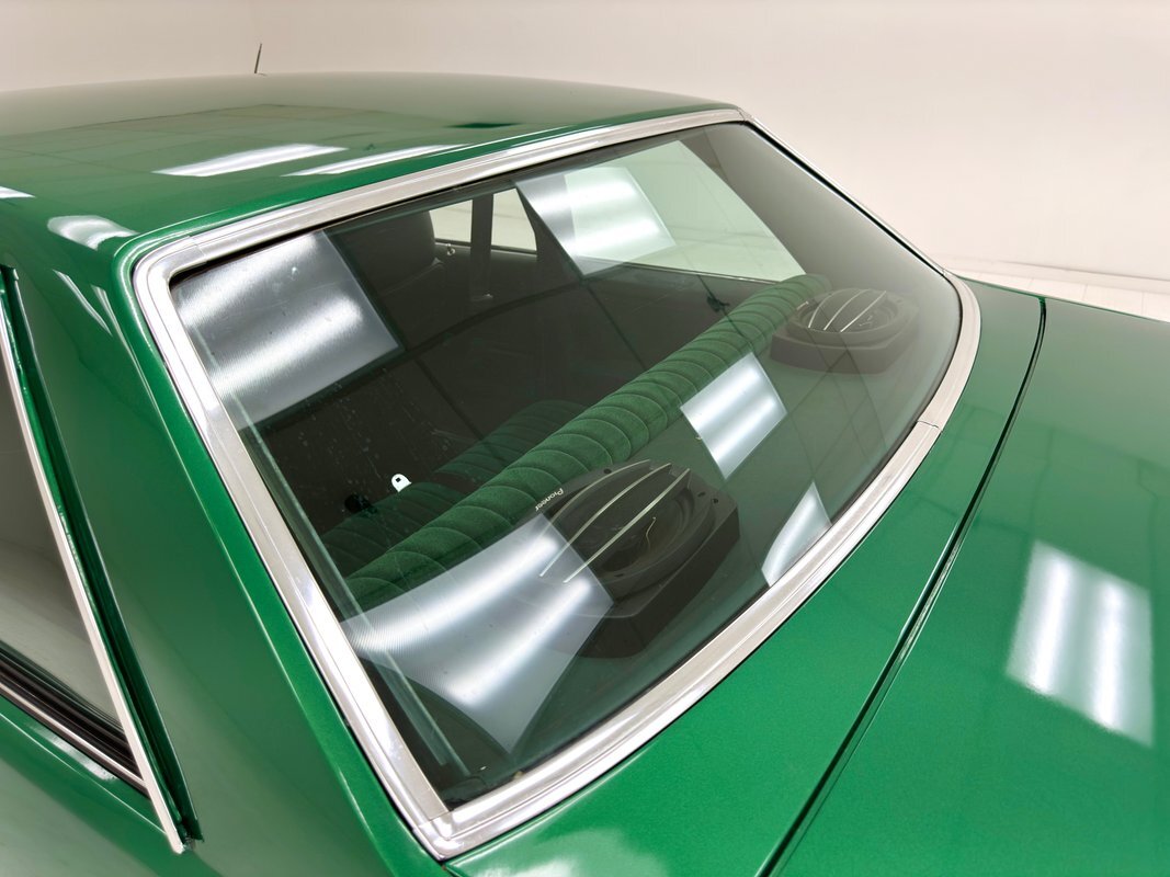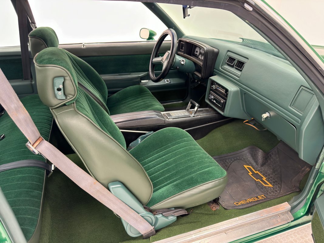 Two stage Green Metallic paint coats the car with near flawless coverage. A cowl hood rises behind the simple front fascia, a flat nosed basic layout of single headlights, a rectangle grille filled with smaller rectangles, and a hefty chrome bumper. Other than the slight rise of the cowl, all horizontal surfaces are flat and square and the car has great proportions. Long tail lights hover over a large chrome rear bumper below which we see two tailpipes that may have been borrowed from the Alaskan pipeline. 15-inch rally wheels hold staggered 60 series tires that give the car a slightly aggressive stance. For comparison, the rear tires are 3 inches taller and 3 1/2 inches wider than what would have been on the car in 1978. Some slight bubbling on a lower panel is the only flaw we noted.