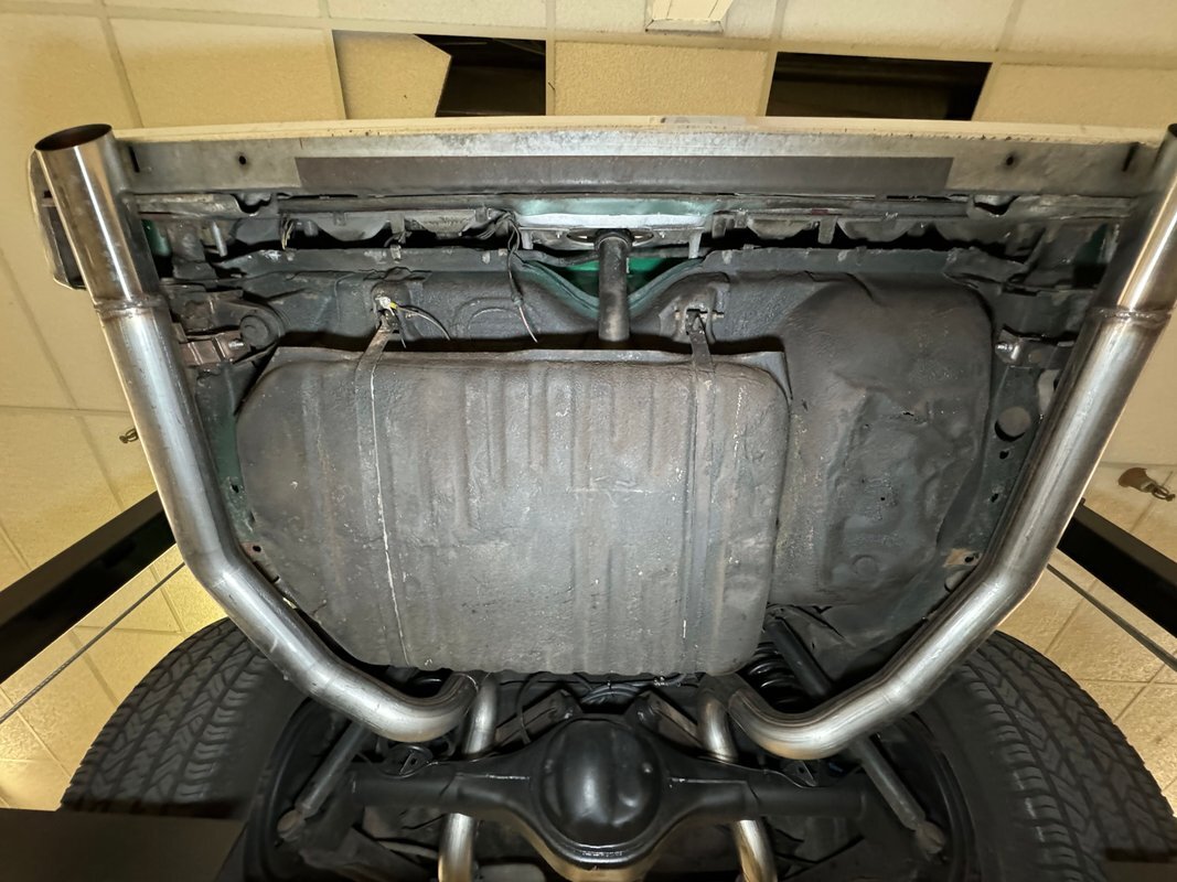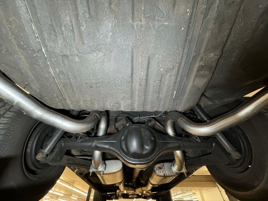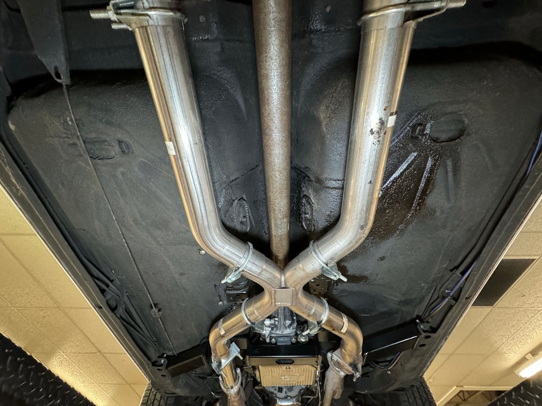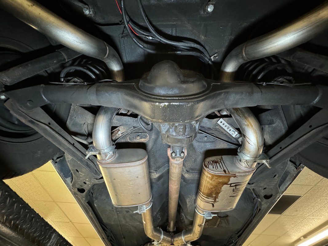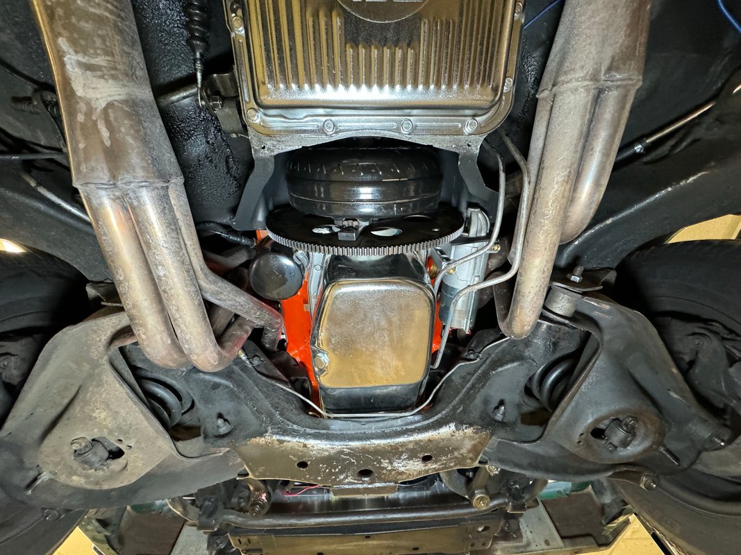 Nice and clean underneath and those headers lead into a 3-inch Pypes stainless steel exhaust system that meet at an X, then travel in tandem to a pair of mufflers, finally escaping out the back through those massive tips. We note the lack of catalytic converters. A G-force transmission crossmember supports the transmission which has a polished pan. The oil pan is polished too and there's no sign of wayward oil save for some oil slung onto the passenger's muffler from a leaky pinion seal. Our consignor states the driveshaft is new. Meanwhile, coil springs are on the front and a 4-link with coil springs are in back.