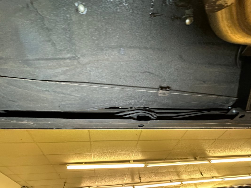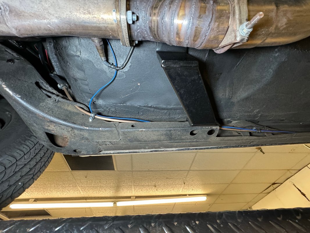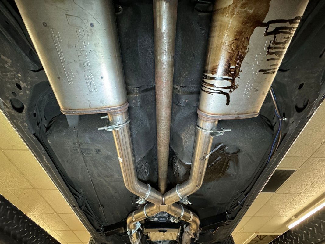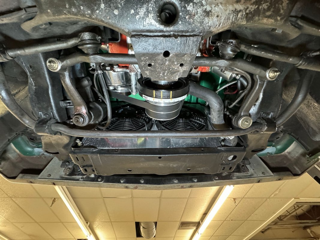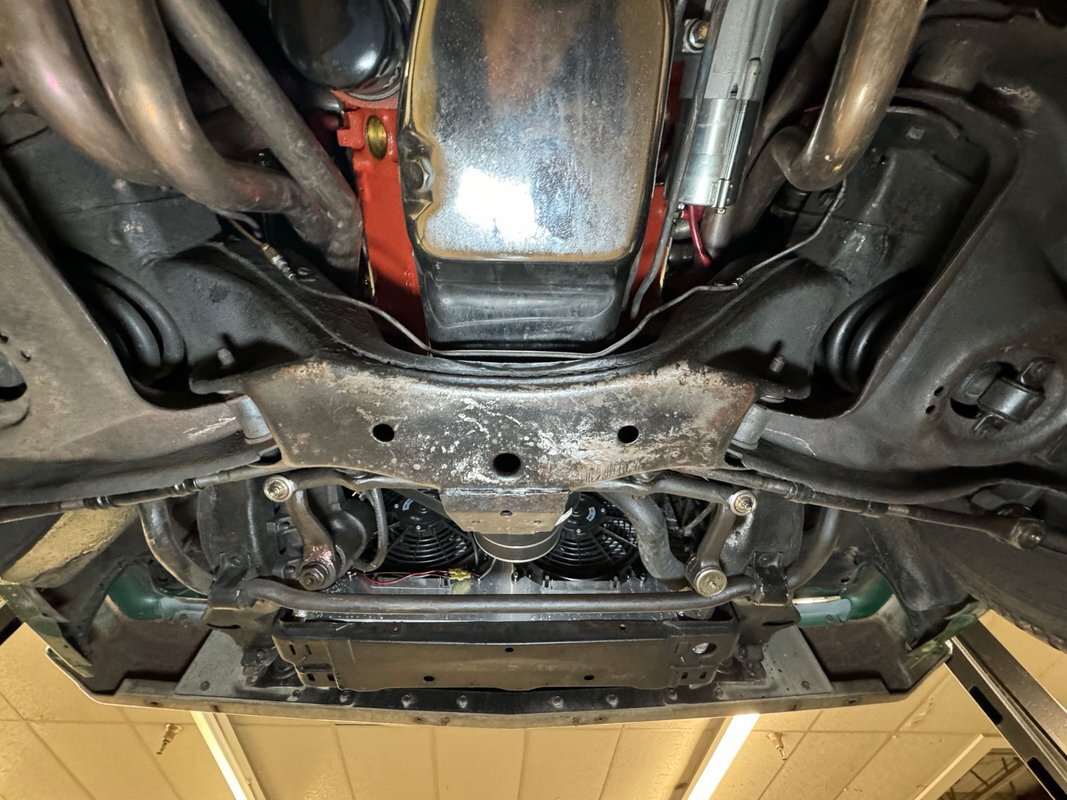 Nice and clean underneath and those headers lead into a 3-inch Pypes stainless steel exhaust system that meet at an X, then travel in tandem to a pair of mufflers, finally escaping out the back through those massive tips. We note the lack of catalytic converters. A G-force transmission crossmember supports the transmission which has a polished pan. The oil pan is polished too and there's no sign of wayward oil save for some oil slung onto the passenger's muffler from a leaky pinion seal. Our consignor states the driveshaft is new. Meanwhile, coil springs are on the front and a 4-link with coil springs are in back.