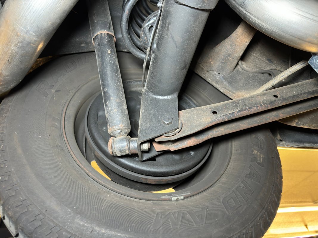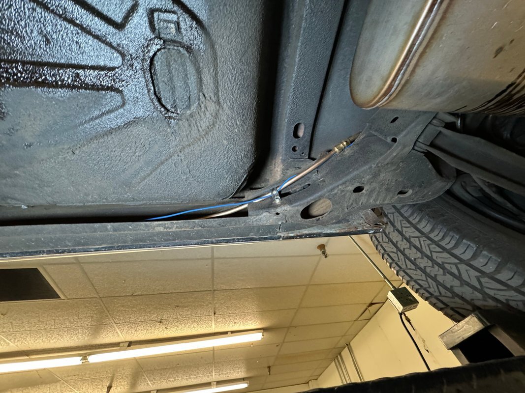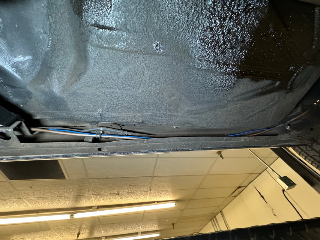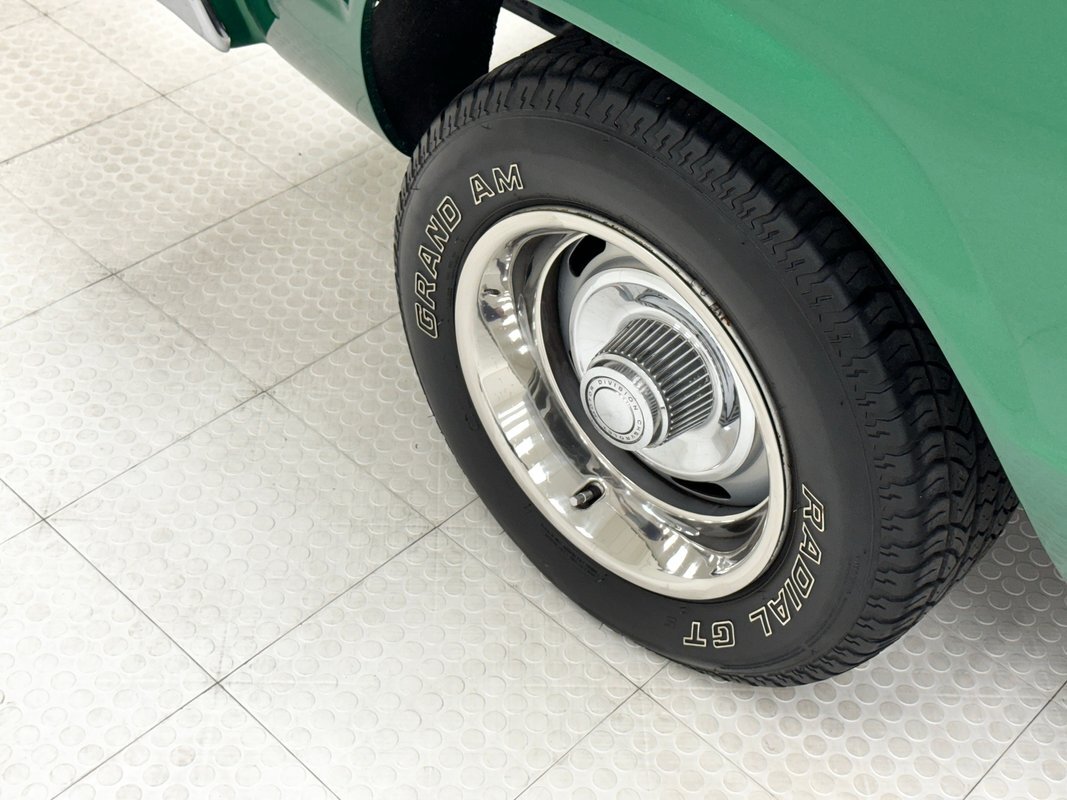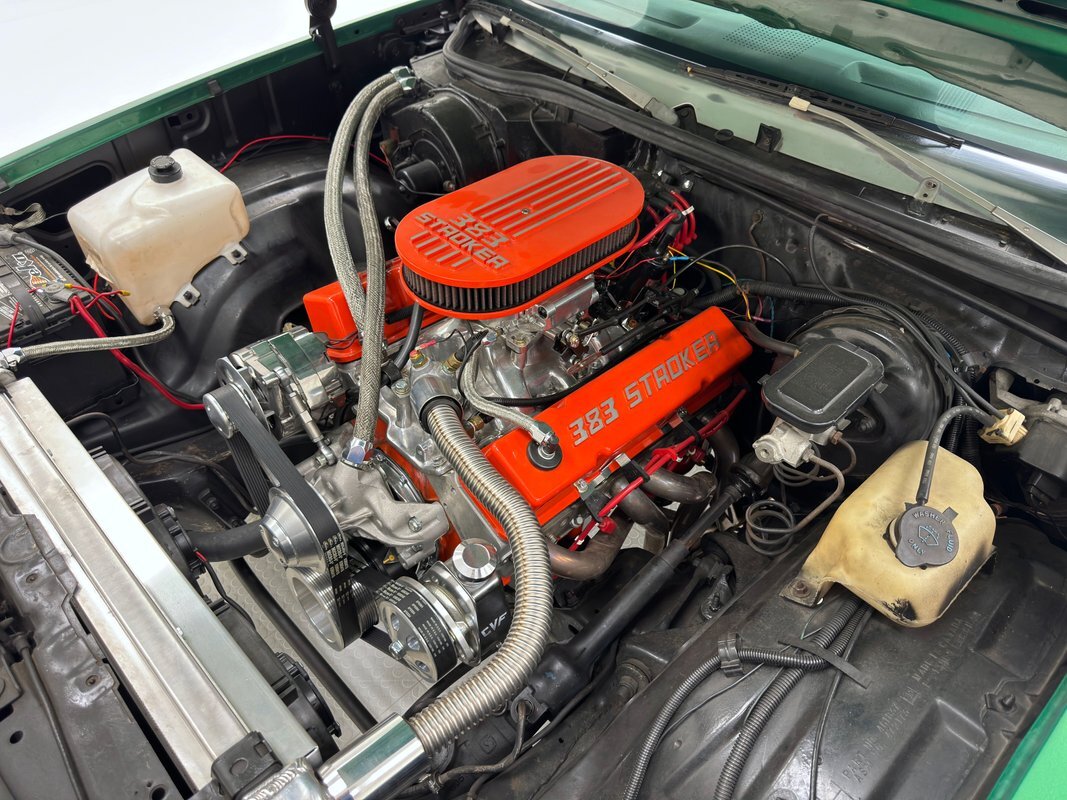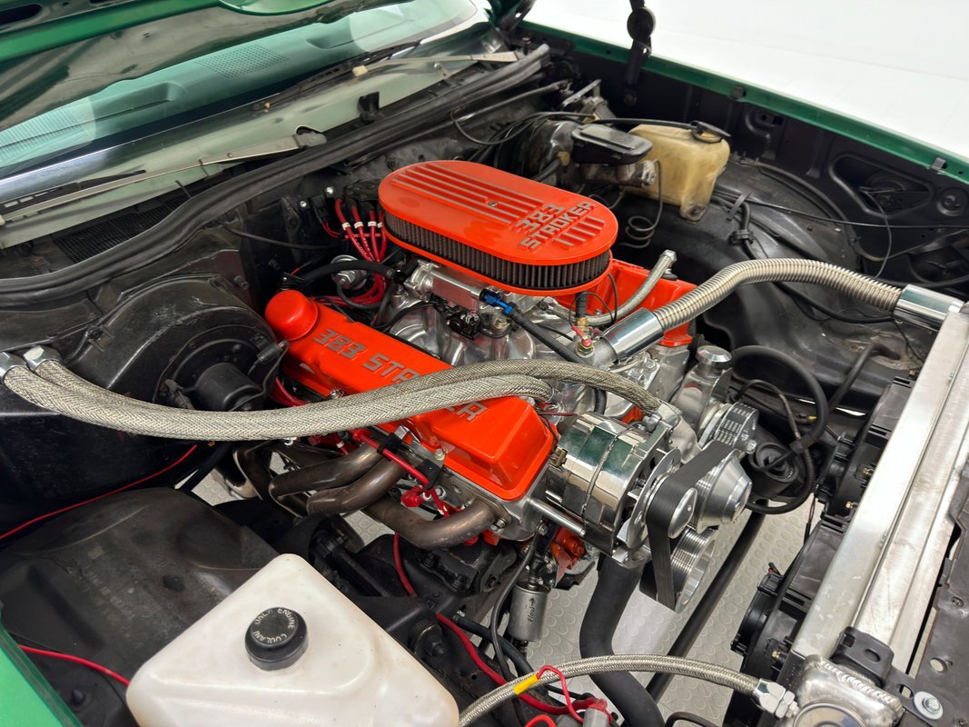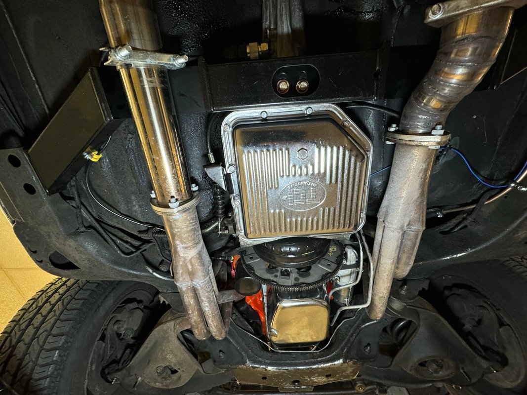 A very clean crate engine is under the cowl hood which our consignor states is a 383ci stroker V8, and it says so on the bright orange valve covers. The polished engine also includes a Holley Sniper electronic fuel injection system, aluminum heads, and a 3-core aluminum radiator and fan, while headers begin the exhaust process. A TH350 3-speed automatic transmission backs the engine and sends power to the Ford 9" rear. Power disc brakes are assigned to the front while power drums get the job in the back. Our consignor states that the engine and transmission were installed in 2023.