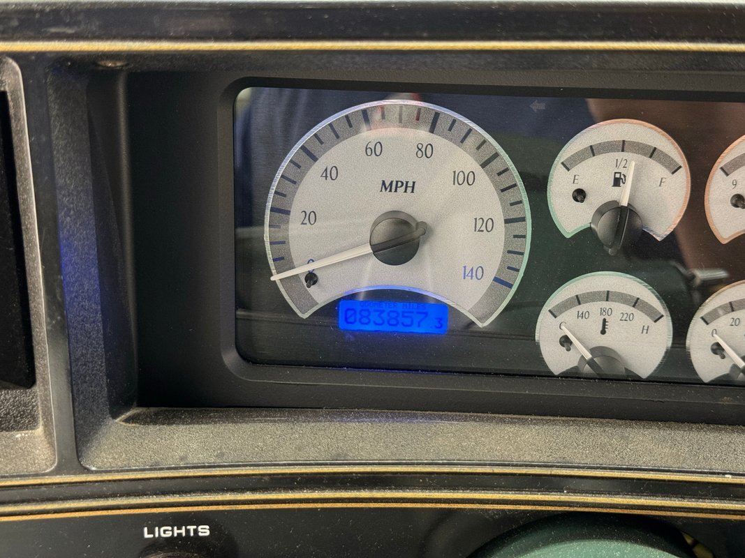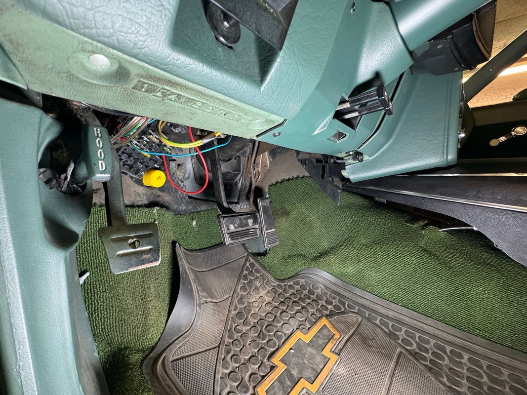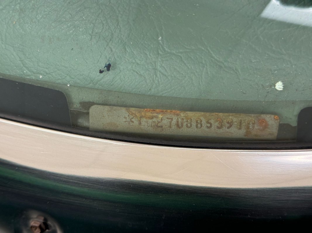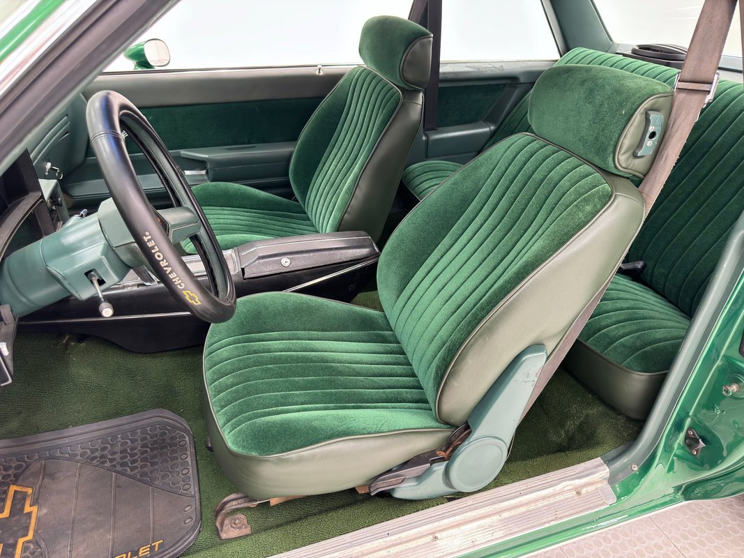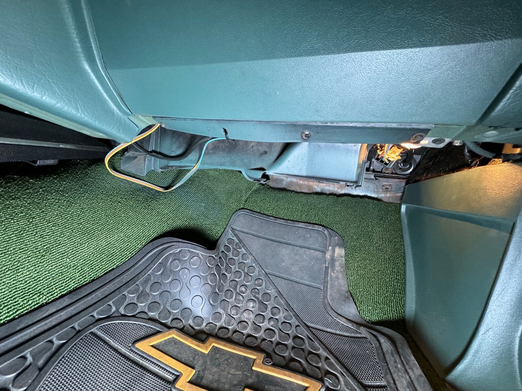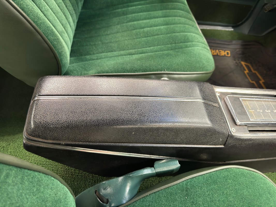 Varying shades of green and materials make up the door panels with manual window cranks and locks and the integrated door handle and armrest seemingly used by GM for decades. Tall green front bucket seats have a velour texture, and the sides are vinyl. The same pattern for the back bench which is straight and clean and in front of two speakers on the rear shelf. The standard steering wheel is covered with an aftermarket vinyl cover while the hard plastic bezel of the gauge cluster houses a Dakota digital gauge package. GM's center stack box contains the climate controls and an AM/FM/CD radio with aux capability. The horseshoe shifter is in the center console which shows some age but is intact, and melds into a center, plastic topped storage bin. Green loop carpet covers the floor while the soft headliner shows some dimpling but is in otherwise good condition.