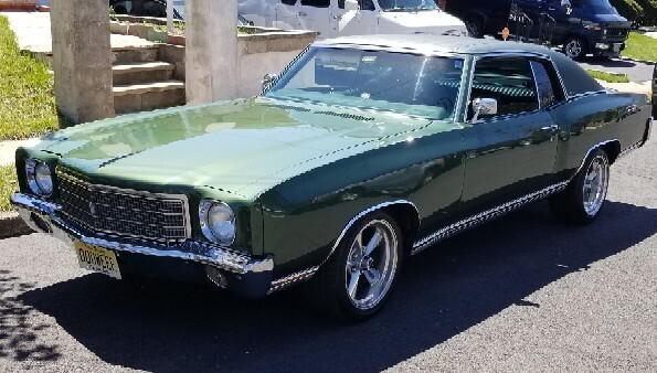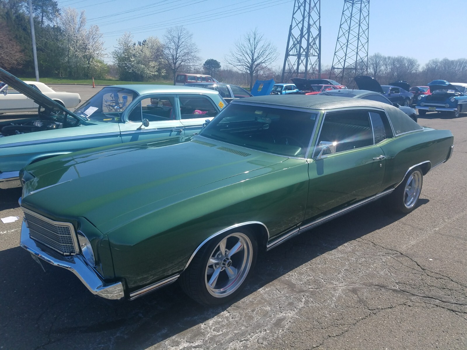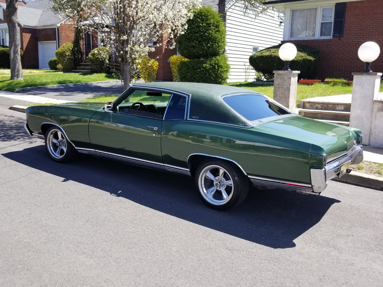 1970 Chevrolet Monte Carlo. 2 Dr Green exterior and interior. ***ORIGINAL 350cc engine***, Runs Good but note original engine. Flow Master mufflers, Leather Seats. Wood Grain Steering Wheel, Alloy Wheels and New Tires. MSD Ignition start and clean engine as seen in pictures. **Garage kept under a cover** all the time. Dual Pipes, Vinyl Green roof top , AM/FM CD Radio with a trunk Amplifier.$23,500 or Best Offer....Buyer is responsible for vehicles pickup.