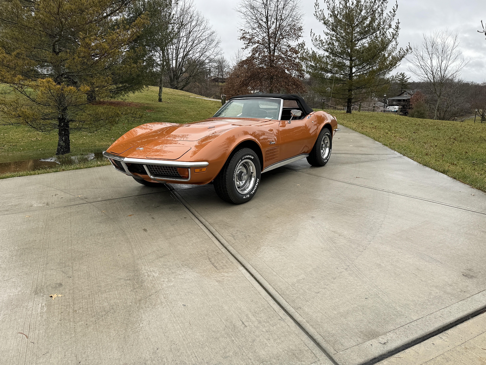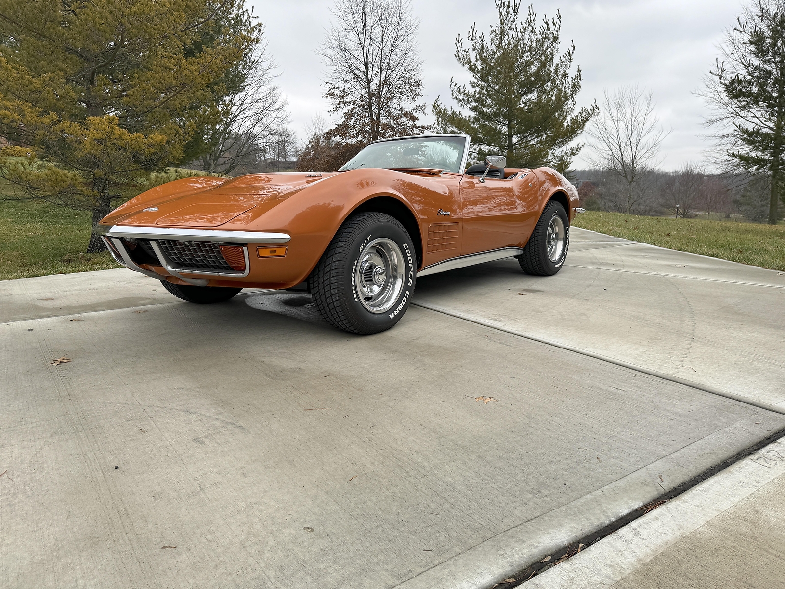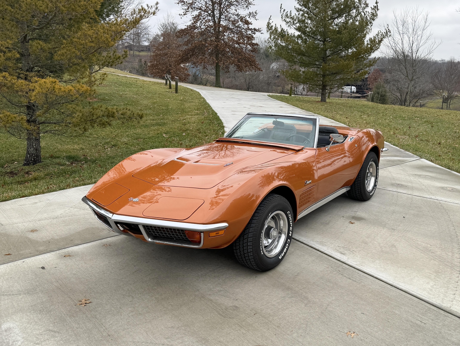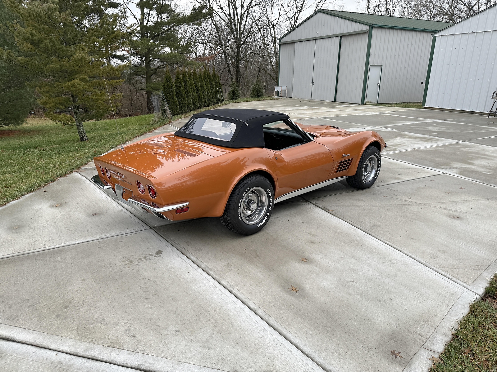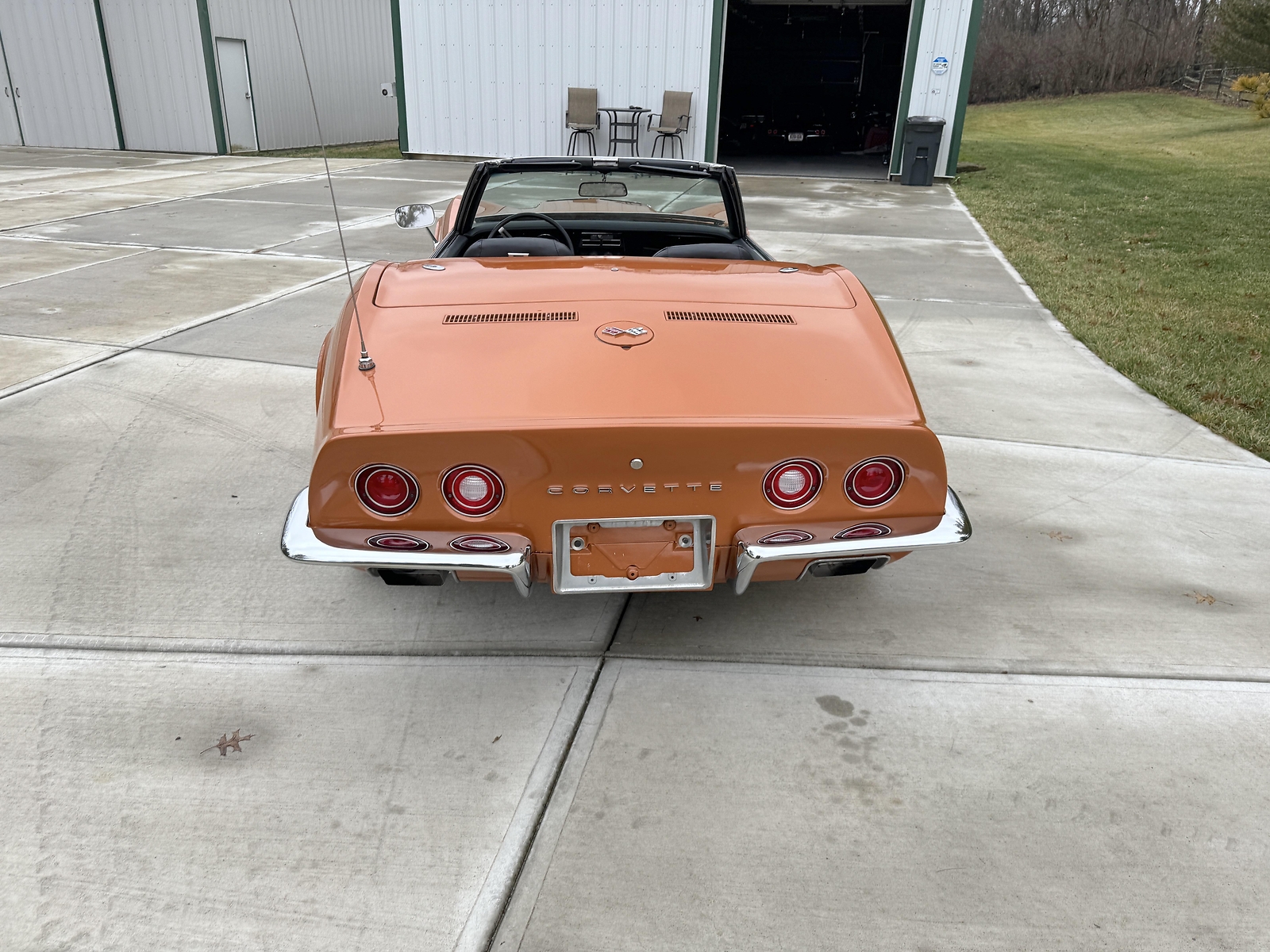 THIS IS A NICE QUALITY FRAME OFF RESTORED CORRECT AND NUMBERS MATCHING 1972 LS5 CORVETTE CONVERTIBLE. SMOOTH AND STRONG ORIGINAL 454 ENGINE, TURBO 400 TRANNY, PS, PDB, TILT/TELI. BEAUTIFUL NEW BLACK DELUXE LEATHER BUCKETS AND CONSOLE INTERIOR. EXCELLENT BODY, FLOORS AND FRAME. FACTORY CORRECT ONTARIO ORANGE PAINT. THIS CORVETTE RUNS AND DRIVES GREAT. THE HEADLIGHTS, THE LIGHTS, TURN SIGNALS, WIPERS, PARKING BRAKE, SPEEDO, TACH AND GAUGES ALL WORK AS THEY SHOULD, EXCEPT CLOCK. THE AC AS NEW AND STILL NEEDS TO BE CHARGED.