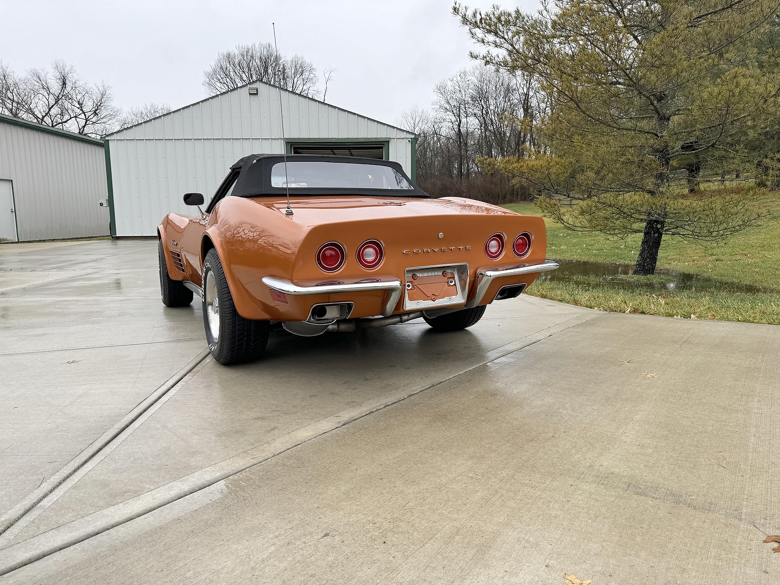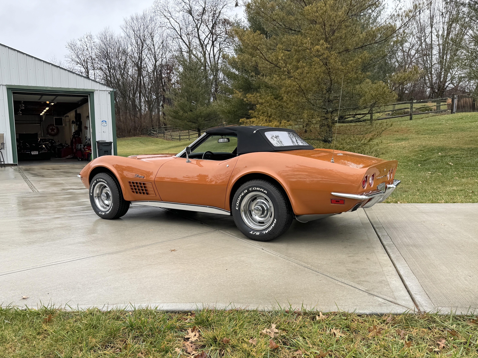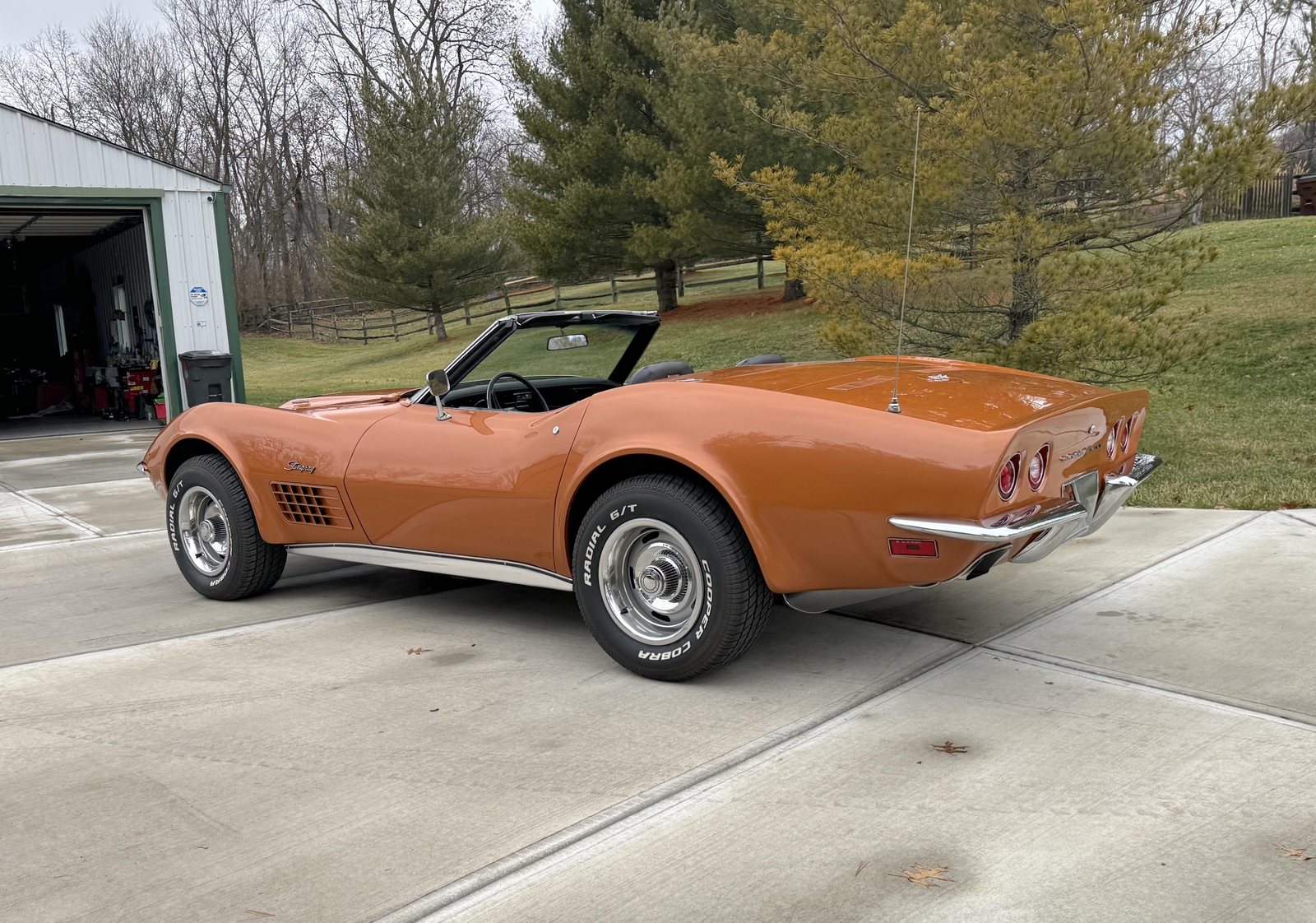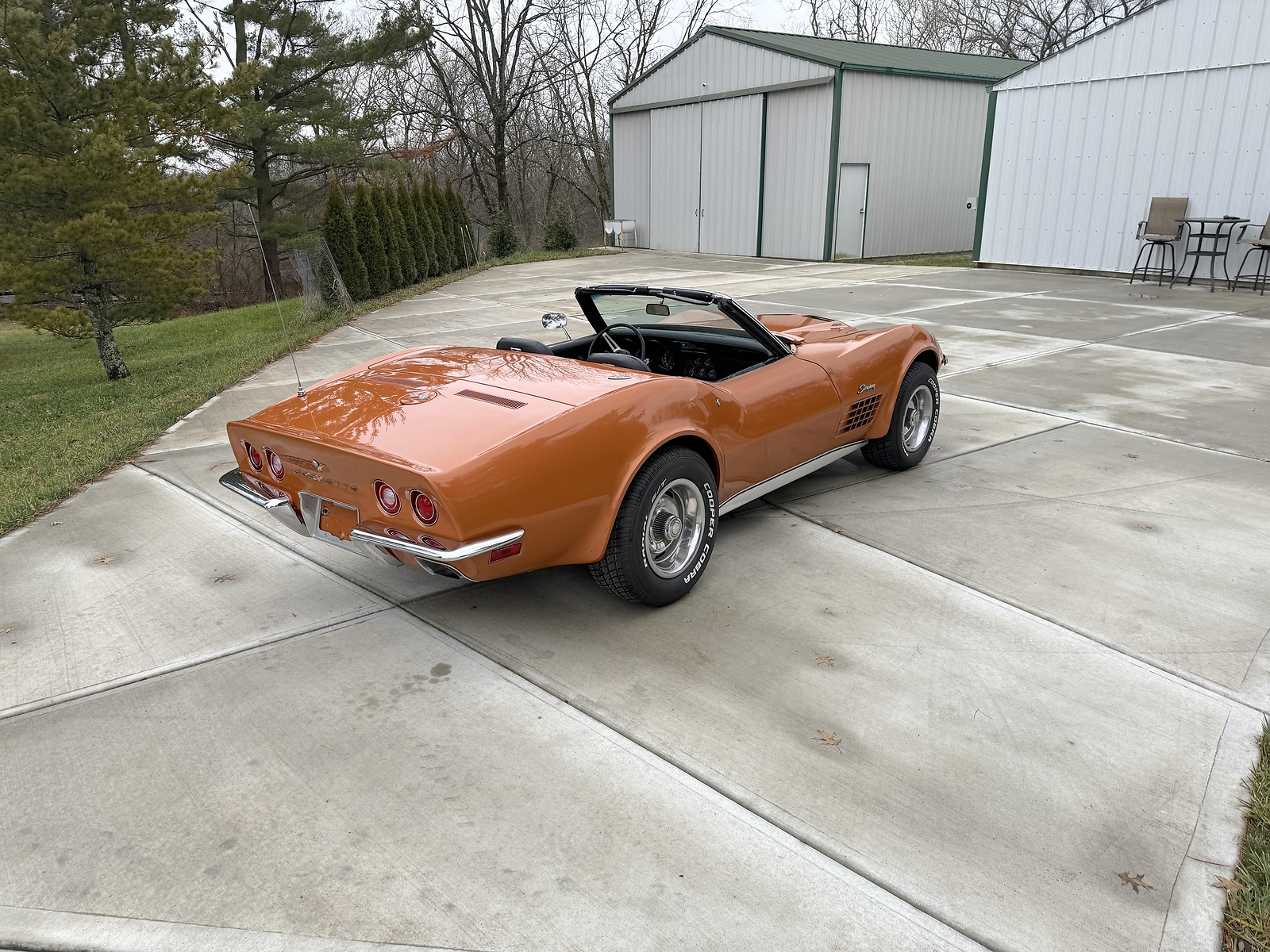 THIS IS A NICE QUALITY FRAME OFF RESTORED CORRECT AND NUMBERS MATCHING 1972 LS5 CORVETTE CONVERTIBLE. SMOOTH AND STRONG ORIGINAL 454 ENGINE, TURBO 400 TRANNY, PS, PDB, TILT/TELI. BEAUTIFUL NEW BLACK DELUXE LEATHER BUCKETS AND CONSOLE INTERIOR. EXCELLENT BODY, FLOORS AND FRAME. FACTORY CORRECT ONTARIO ORANGE PAINT. THIS CORVETTE RUNS AND DRIVES GREAT. THE HEADLIGHTS, THE LIGHTS, TURN SIGNALS, WIPERS, PARKING BRAKE, SPEEDO, TACH AND GAUGES ALL WORK AS THEY SHOULD, EXCEPT CLOCK. THE AC AS NEW AND STILL NEEDS TO BE CHARGED.
