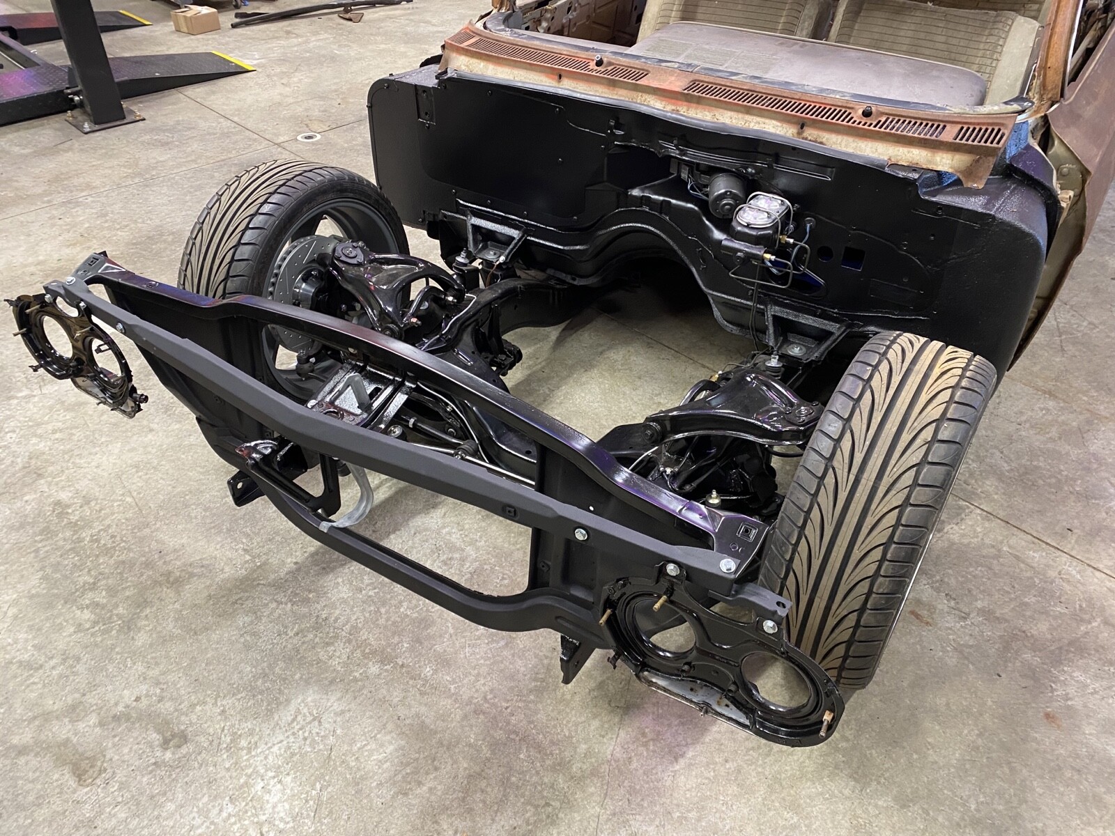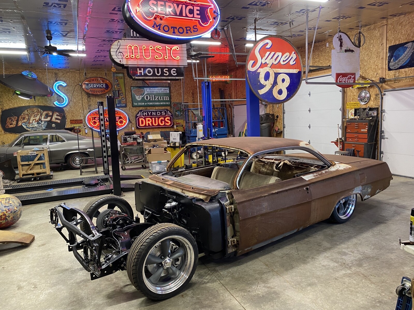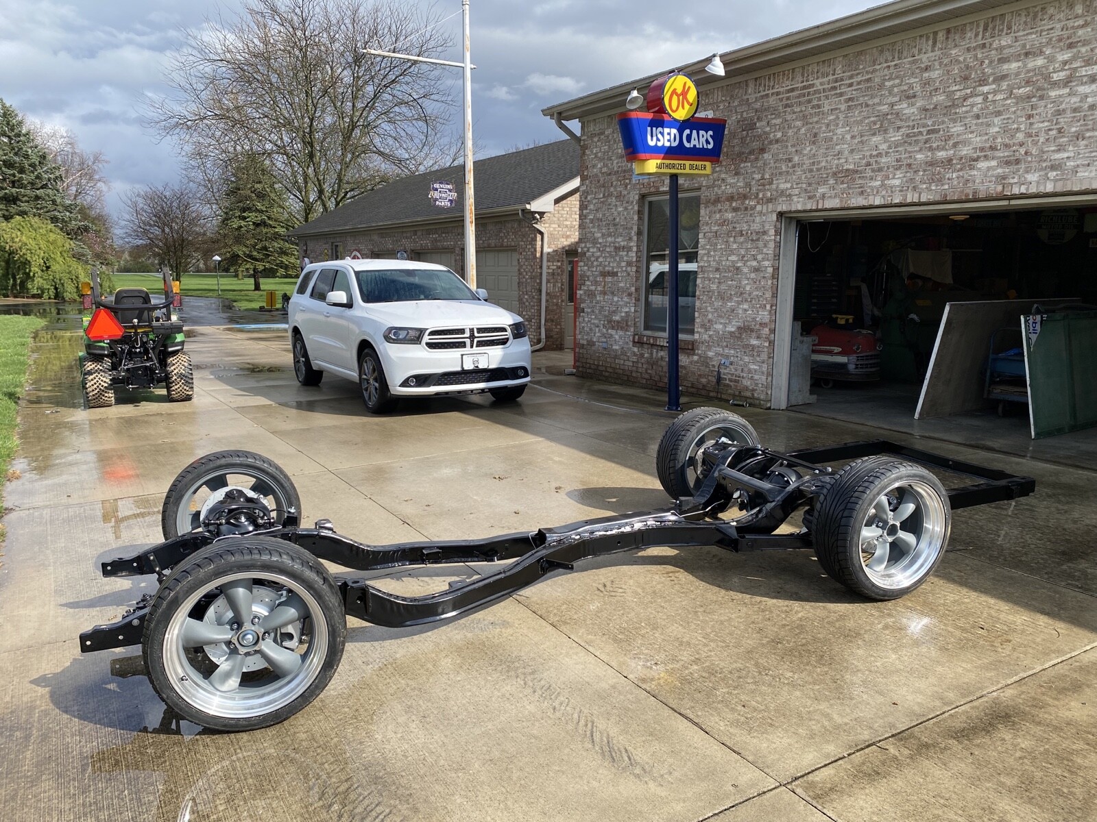 Chassis: the chassis was sandblasted and powder coated with for four-way air suspension added the car has Street Machinery 13 inch front Corvette BAER disc brakes with drop spindles. The control arms have been sandblasted and powder coated with new ball joints and bushings. The rear end has been raptor coated with all new seals bearings and bushings with 11 inch cross drilled disc brakes. All the brake lines have been ran on the chassis. All the air suspension has been installed and is functional.