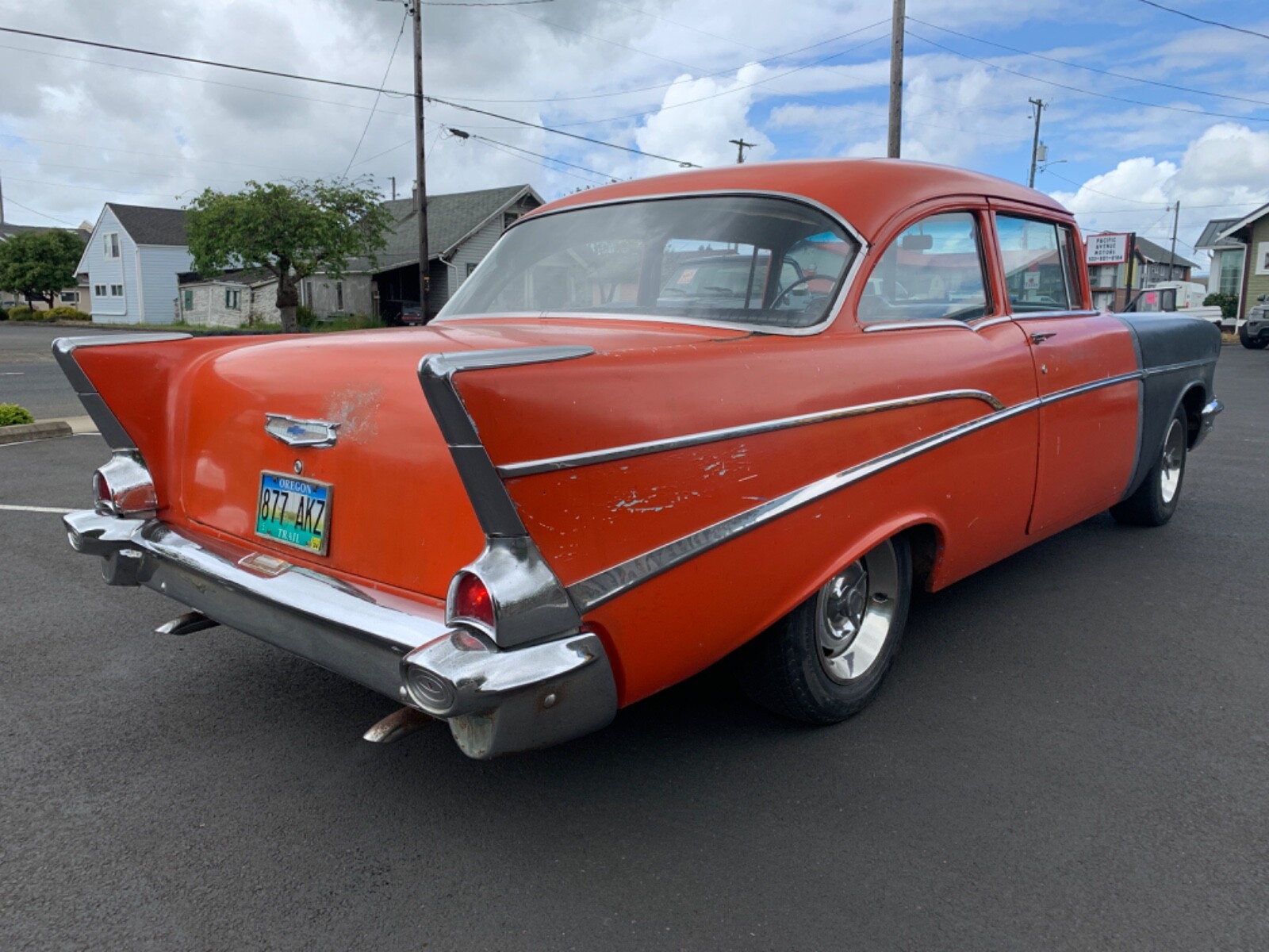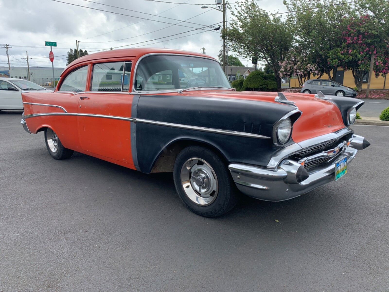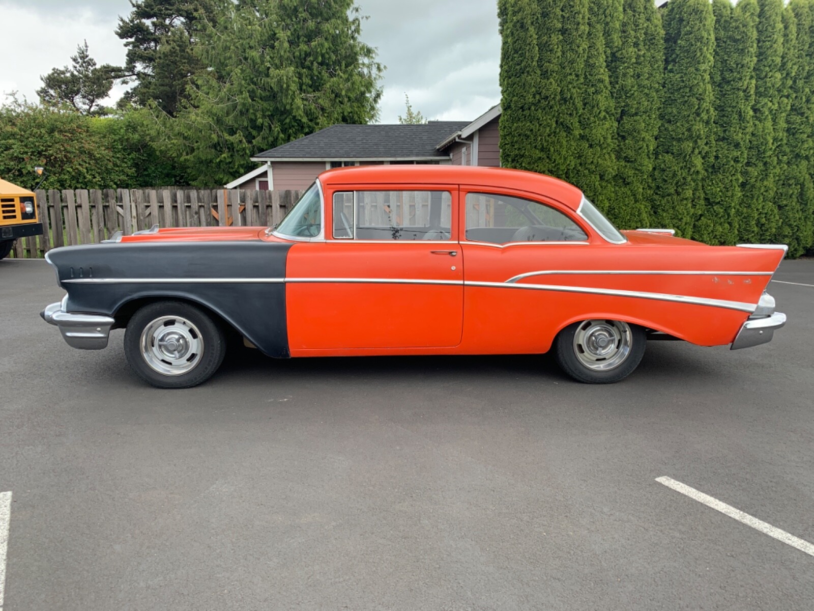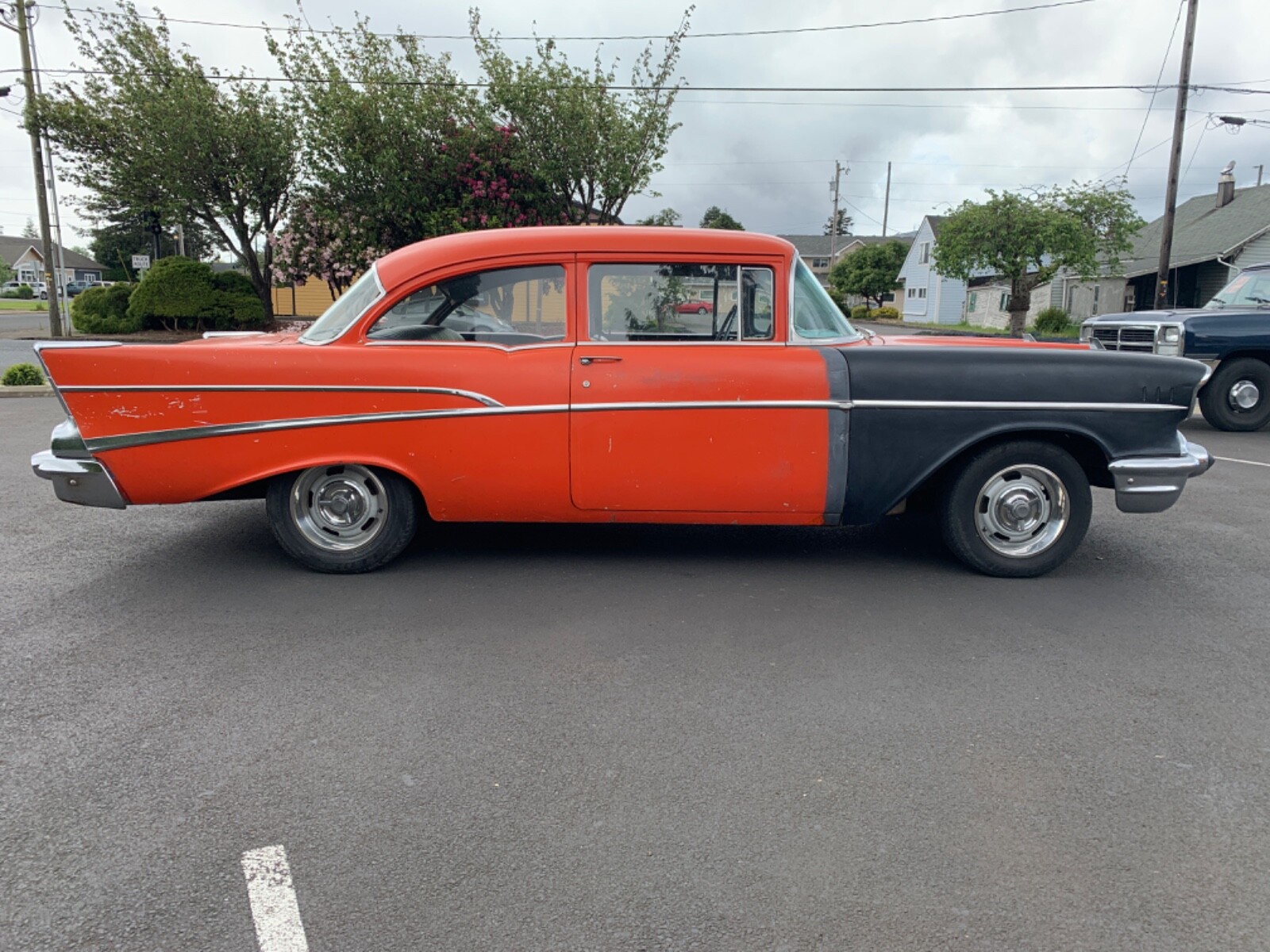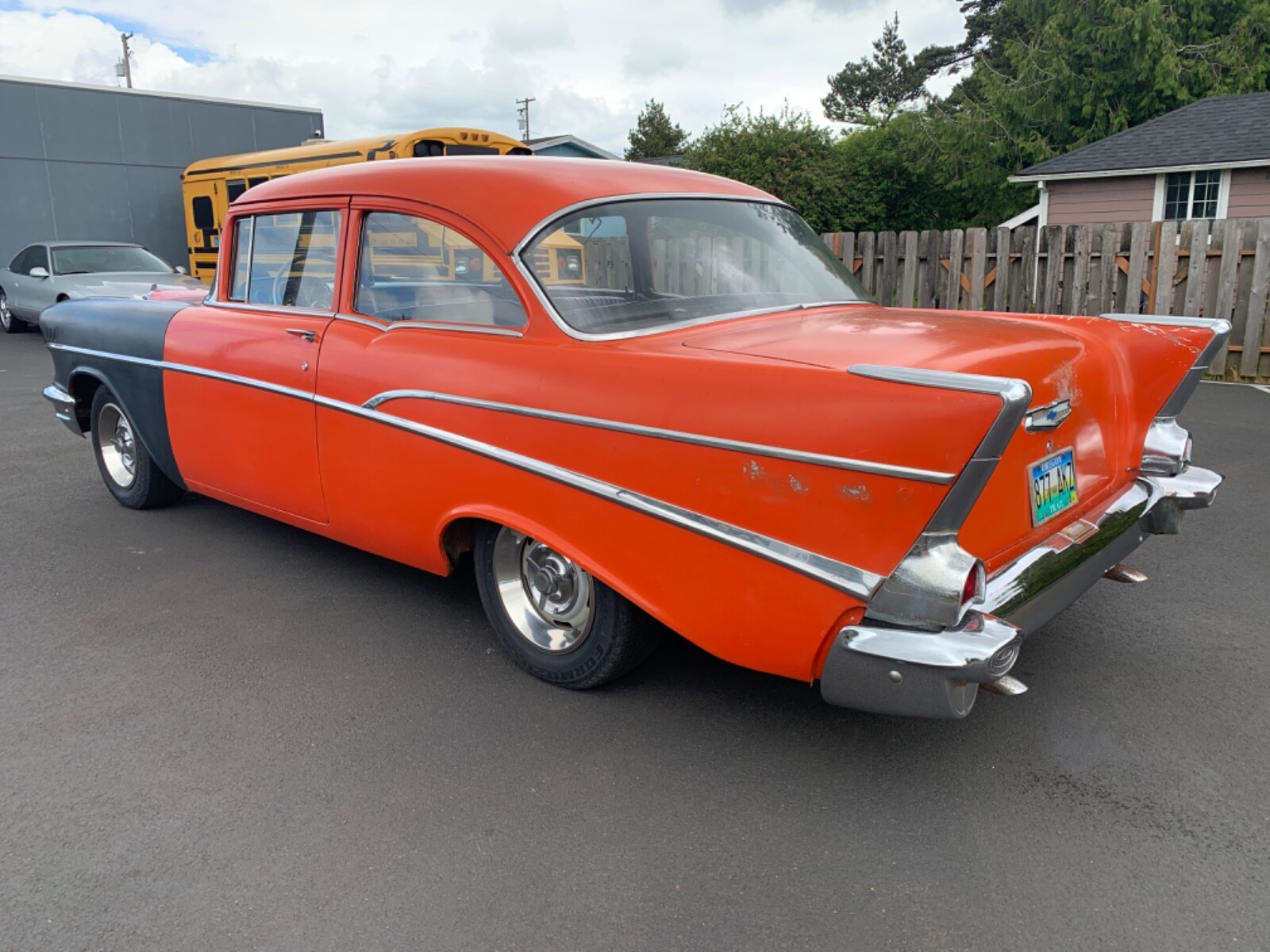1957 Chevrolet 210 Two-Door Sedan, same owner since 1996, bought it in 1996 almost exactly as it sits today, the black fenders were already on it and just left it that way and drove it like that. Has a nice sounding small block Chevy that the last owner said is a non-numbers matching but period correct 283, it does have the single hump "Power Pak" cylinder heads on it that I can see. Has a Thermoqaud 4-barrel carburetor sounds great when you get those big secondaries open. It has a tight 3 speed manual stick shift on the floor, spring loaded when you come up out of first, it’s always in perfect position between 2nd and 3rd. Interior looks very nice, both doors lock and unlock with a key. Double bench seats are in great shape, front seat slides forward and back nicely, two seatbelts in the front and two seatbelts in the rear. The windshield wipers, the headlights, taillights, brake lights, license plate light and turn signals and the horn are working, the emergency parking brake works very well also. I can see the high beam indicator illuminate red on/off when I push the foot switch to bright/dim headlights, and I can see both turn signal indicators on the dash working when I turn them on. Has a newer style Alternator instead of the old-style generator, it is still connected to the dash generator light so warning light turns on when key is turned to On, and goes away when started. All the glass looks good, I don't see any chips or cracks, very slight delam on a couple of the window edges. The factory AM radio, factory clock, dome light, cigarette lighter and the gas gauge are not working. A working oil pressure and temperature gauge are mounted under the dash next to an AM/FM/CD player, which has an amplifier mounted in the trunk. The front and back windows roll up and down nicely and the wing windows crank open with handles nicely also, all the heater controls slide nicely, and the heater blows lots of hot air. There is sound deadener installed under the carpet but not glued in, so inspection of floor pans is still available, headliner isn't sagging but starting to look old to me. There was a little rust in the trunk underneath the rubber mat on the driver's side, to the left of the upper 3 big X's stamped into the metal trunk pan, I put rust inhibitor on it and painted over it with Chevy orange. The trunk was the only area I touched up, Undercarriage looks like only surface rust to me, but I took lots of pictures of the underneath front to back both sides, call for more pictures. A metal bar was made and bolted into place between the frame rails that the top of the rear shocks are mounted to, old owner said he doesn't like the way Chevrolet mounted the top of the shocks to the trunk pan and did it so the shocks wouldn't bend up the trunk pan up over time. Corvette Rally wheels, beauty rings, center caps and knockoffs. The original Armstrong steering means no power steering leaks to worry about, but it does leave some drops of oil where I park. 4-wheel drum brakes were just bled and seem to stop fairly straight when applied. The VIN says it was born in Oakland, California with a straight 6 and three on the tree. The Cowl trim tag says 822C for paint, which was Dusk pearl on the bottom and Imperial Ivory on the top. Looks, Runs, Drives and sounds pretty nice and has a Clean Oregon title. Starts great cold, four accelerator pumps and choke closes, hit the key then idles high when started until gas pedal is tapped, starts great hot also. I have driven this car about 75 miles getting it ready to sell, 30 psi of oil pressure at idle and I've sat and idle for a long time, and I haven't had any problems with it getting hot or overheating. I have about 30 more pictures of the underneath and some walk around and driving videos also, call or text 503-801-8184 for them. Tires all look good but are old, I reserve the right to end the auction early for any reason. Full payment due within 3 days of the end of the auction, Car is available for viewing during daylight hours. Car has a clean Oregon title. Funds must be cleared before Car and title are released. Will meet with your shipper but buyer is responsible for arranging and paying for shipping. Car is located in Tillamook, Oregon 97141, and being Sold As-Is no warranty expressed or implied