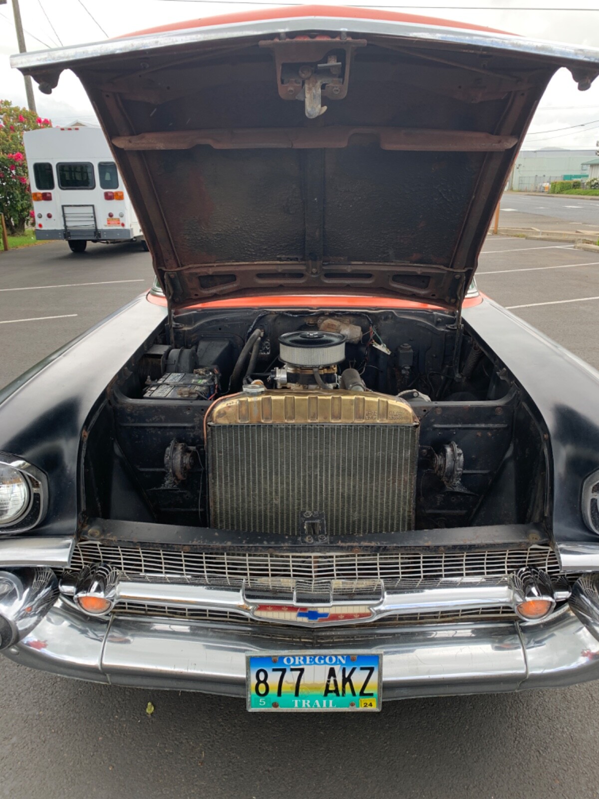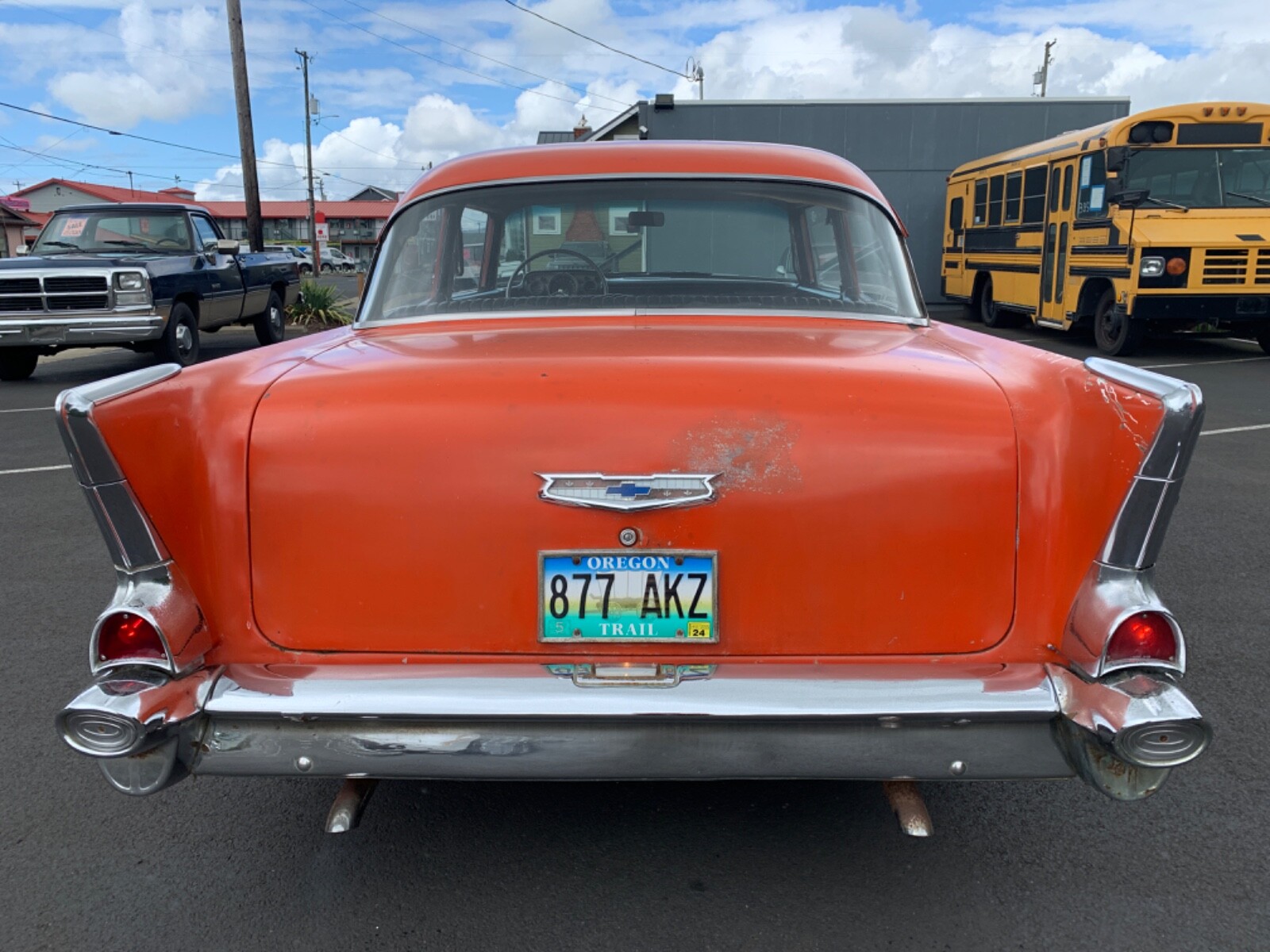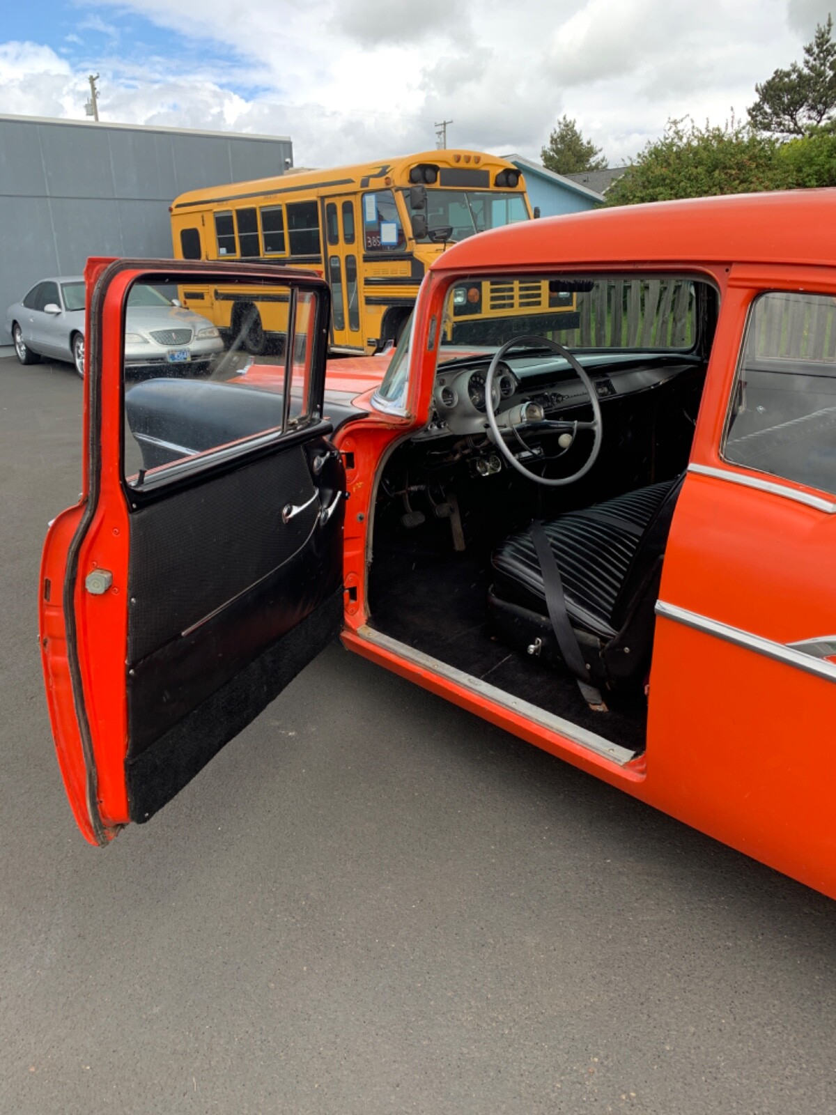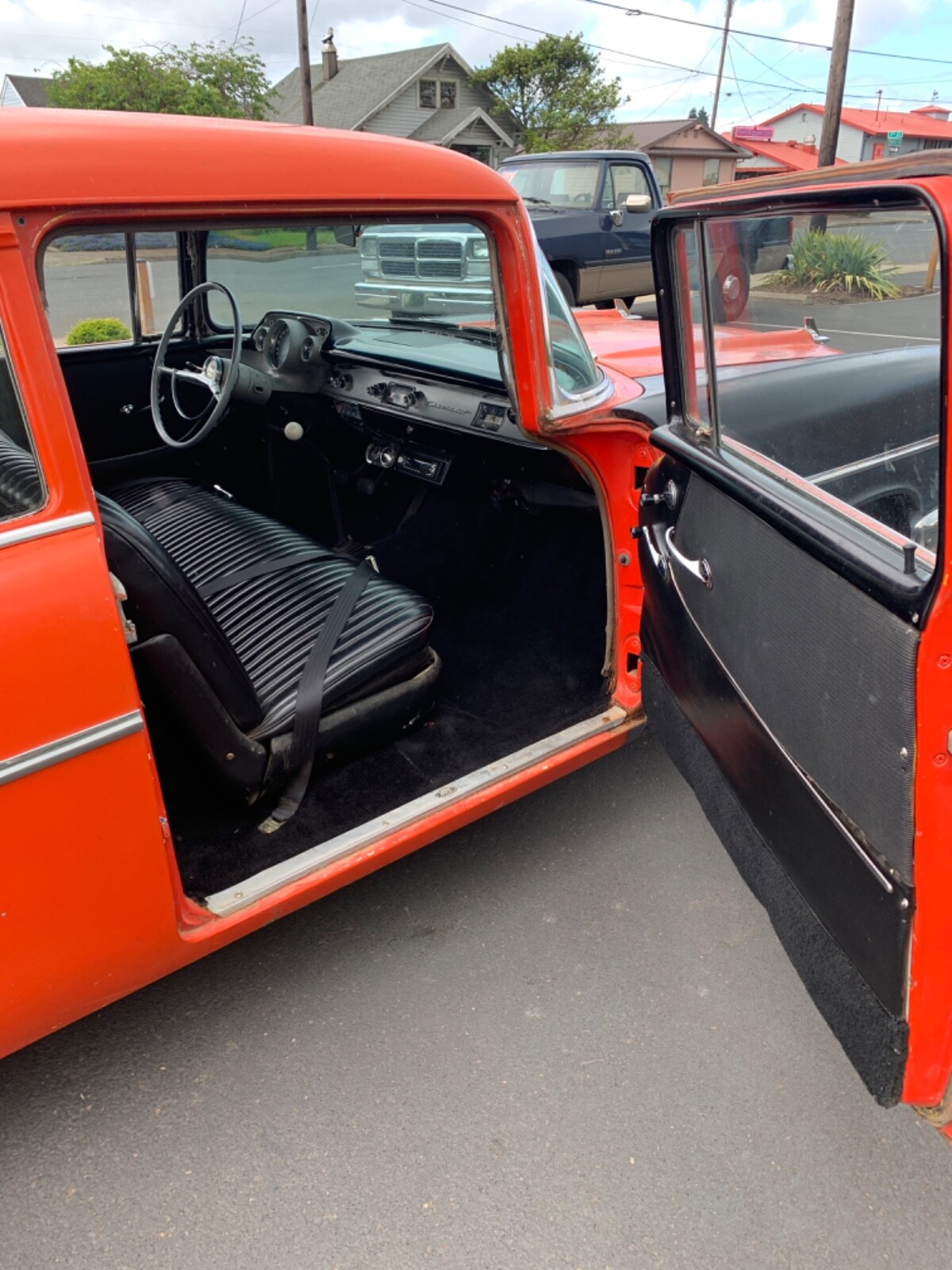 1957 Chevrolet 210 Two-Door Sedan, same owner since 1996, bought it in 1996 almost exactly as it sits today, the black fenders were already on it and just left it that way and drove it like that. Has a nice sounding small block Chevy that the last owner said is a non-numbers matching but period correct 283, it does have the single hump "Power Pak" cylinder heads on it that I can see. Has a Thermoqaud 4-barrel carburetor sounds great when you get those big secondaries open. It has a tight 3 speed manual stick shift on the floor, spring loaded when you come up out of first, it’s always in perfect position between 2nd and 3rd. Interior looks very nice, both doors lock and unlock with a key. Double bench seats are in great shape, front seat slides forward and back nicely, two seatbelts in the front and two seatbelts in the rear. The windshield wipers, the headlights, taillights, brake lights, license plate light and turn signals and the horn are working, the emergency parking brake works very well also. I can see the high beam indicator illuminate red on/off when I push the foot switch to bright/dim headlights, and I can see both turn signal indicators on the dash working when I turn them on. Has a newer style Alternator instead of the old-style generator, it is still connected to the dash generator light so warning light turns on when key is turned to On, and goes away when started. All the glass looks good, I don't see any chips or cracks, very slight delam on a couple of the window edges. The factory AM radio, factory clock, dome light, cigarette lighter and the gas gauge are not working. A working oil pressure and temperature gauge are mounted under the dash next to an AM/FM/CD player, which has an amplifier mounted in the trunk. The front and back windows roll up and down nicely and the wing windows crank open with handles nicely also, all the heater controls slide nicely, and the heater blows lots of hot air. There is sound deadener installed under the carpet but not glued in, so inspection of floor pans is still available, headliner isn't sagging but starting to look old to me. There was a little rust in the trunk underneath the rubber mat on the driver's side, to the left of the upper 3 big X's stamped into the metal trunk pan, I put rust inhibitor on it and painted over it with Chevy orange. The trunk was the only area I touched up, Undercarriage looks like only surface rust to me, but I took lots of pictures of the underneath front to back both sides, call for more pictures. A metal bar was made and bolted into place between the frame rails that the top of the rear shocks are mounted to, old owner said he doesn't like the way Chevrolet mounted the top of the shocks to the trunk pan and did it so the shocks wouldn't bend up the trunk pan up over time. Corvette Rally wheels, beauty rings, center caps and knockoffs. The original Armstrong steering means no power steering leaks to worry about, but it does leave some drops of oil where I park. 4-wheel drum brakes were just bled and seem to stop fairly straight when applied. The VIN says it was born in Oakland, California with a straight 6 and three on the tree. The Cowl trim tag says 822C for paint, which was Dusk pearl on the bottom and Imperial Ivory on the top. Looks, Runs, Drives and sounds pretty nice and has a Clean Oregon title. Starts great cold, four accelerator pumps and choke closes, hit the key then idles high when started until gas pedal is tapped, starts great hot also. I have driven this car about 75 miles getting it ready to sell, 30 psi of oil pressure at idle and I've sat and idle for a long time, and I haven't had any problems with it getting hot or overheating. I have about 30 more pictures of the underneath and some walk around and driving videos also, call or text 503-801-8184 for them. Tires all look good but are old, I reserve the right to end the auction early for any reason. Full payment due within 3 days of the end of the auction, Car is available for viewing during daylight hours. Car has a clean Oregon title. Funds must be cleared before Car and title are released. Will meet with your shipper but buyer is responsible for arranging and paying for shipping. Car is located in Tillamook, Oregon 97141, and being Sold As-Is no warranty expressed or implied