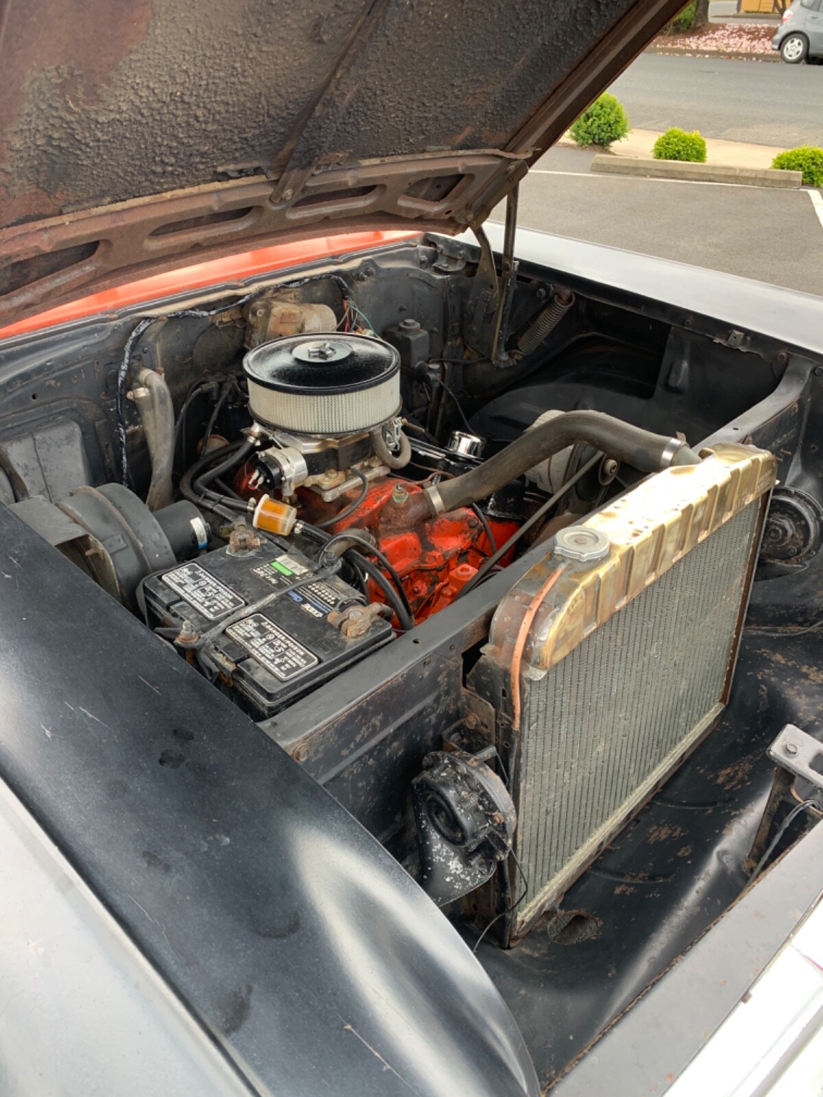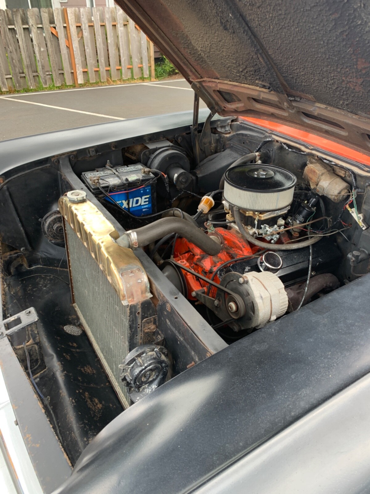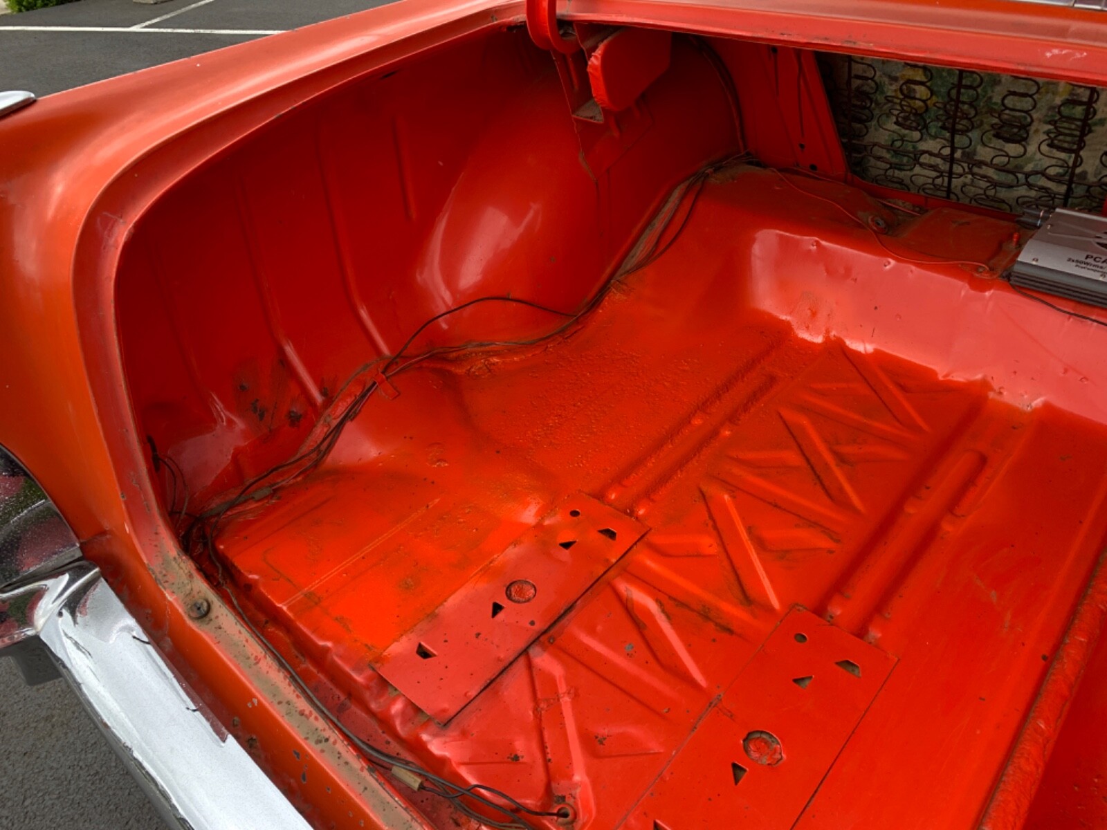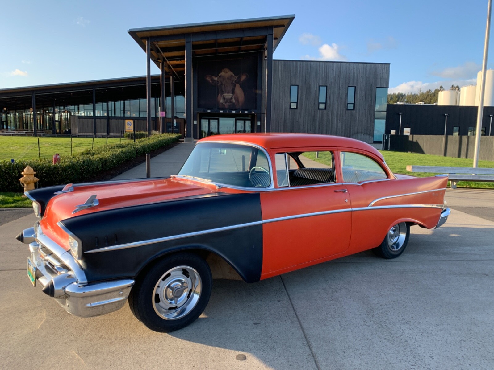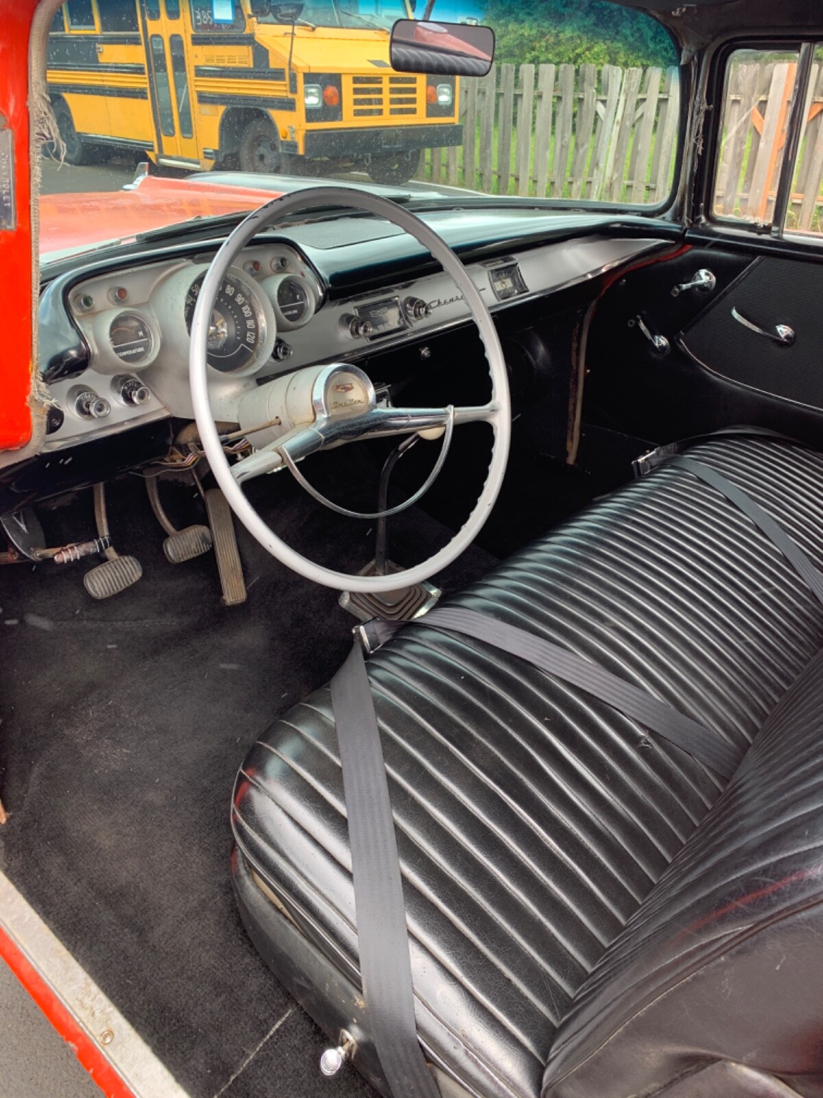 1957 Chevrolet 210 Two-Door Sedan, same owner since 1996, bought it in 1996 almost exactly as it sits today, the black fenders were already on it and just left it that way and drove it like that. Has a nice sounding small block Chevy that the last owner said is a non-numbers matching but period correct 283, it does have the single hump "Power Pak" cylinder heads on it that I can see. Has a Thermoqaud 4-barrel carburetor sounds great when you get those big secondaries open. It has a tight 3 speed manual stick shift on the floor, spring loaded when you come up out of first, it’s always in perfect position between 2nd and 3rd. Interior looks very nice, both doors lock and unlock with a key. Double bench seats are in great shape, front seat slides forward and back nicely, two seatbelts in the front and two seatbelts in the rear. The windshield wipers, the headlights, taillights, brake lights, license plate light and turn signals and the horn are working, the emergency parking brake works very well also. I can see the high beam indicator illuminate red on/off when I push the foot switch to bright/dim headlights, and I can see both turn signal indicators on the dash working when I turn them on. Has a newer style Alternator instead of the old-style generator, it is still connected to the dash generator light so warning light turns on when key is turned to On, and goes away when started. All the glass looks good, I don't see any chips or cracks, very slight delam on a couple of the window edges. The factory AM radio, factory clock, dome light, cigarette lighter and the gas gauge are not working. A working oil pressure and temperature gauge are mounted under the dash next to an AM/FM/CD player, which has an amplifier mounted in the trunk. The front and back windows roll up and down nicely and the wing windows crank open with handles nicely also, all the heater controls slide nicely, and the heater blows lots of hot air. There is sound deadener installed under the carpet but not glued in, so inspection of floor pans is still available, headliner isn't sagging but starting to look old to me. There was a little rust in the trunk underneath the rubber mat on the driver's side, to the left of the upper 3 big X's stamped into the metal trunk pan, I put rust inhibitor on it and painted over it with Chevy orange. The trunk was the only area I touched up, Undercarriage looks like only surface rust to me, but I took lots of pictures of the underneath front to back both sides, call for more pictures. A metal bar was made and bolted into place between the frame rails that the top of the rear shocks are mounted to, old owner said he doesn't like the way Chevrolet mounted the top of the shocks to the trunk pan and did it so the shocks wouldn't bend up the trunk pan up over time. Corvette Rally wheels, beauty rings, center caps and knockoffs. The original Armstrong steering means no power steering leaks to worry about, but it does leave some drops of oil where I park. 4-wheel drum brakes were just bled and seem to stop fairly straight when applied. The VIN says it was born in Oakland, California with a straight 6 and three on the tree. The Cowl trim tag says 822C for paint, which was Dusk pearl on the bottom and Imperial Ivory on the top. Looks, Runs, Drives and sounds pretty nice and has a Clean Oregon title. Starts great cold, four accelerator pumps and choke closes, hit the key then idles high when started until gas pedal is tapped, starts great hot also. I have driven this car about 75 miles getting it ready to sell, 30 psi of oil pressure at idle and I've sat and idle for a long time, and I haven't had any problems with it getting hot or overheating. I have about 30 more pictures of the underneath and some walk around and driving videos also, call or text 503-801-8184 for them. Tires all look good but are old, I reserve the right to end the auction early for any reason. Full payment due within 3 days of the end of the auction, Car is available for viewing during daylight hours. Car has a clean Oregon title. Funds must be cleared before Car and title are released. Will meet with your shipper but buyer is responsible for arranging and paying for shipping. Car is located in Tillamook, Oregon 97141, and being Sold As-Is no warranty expressed or implied