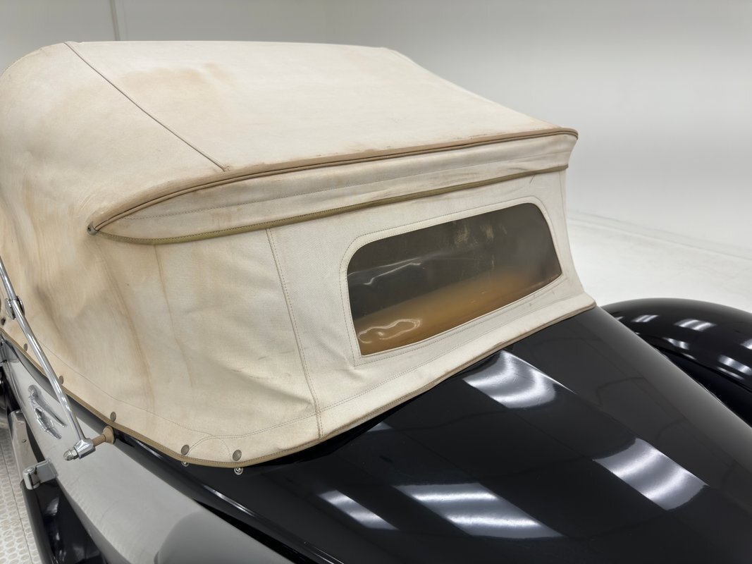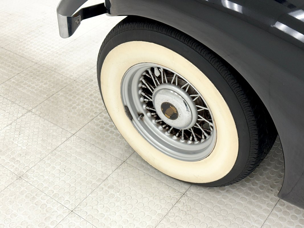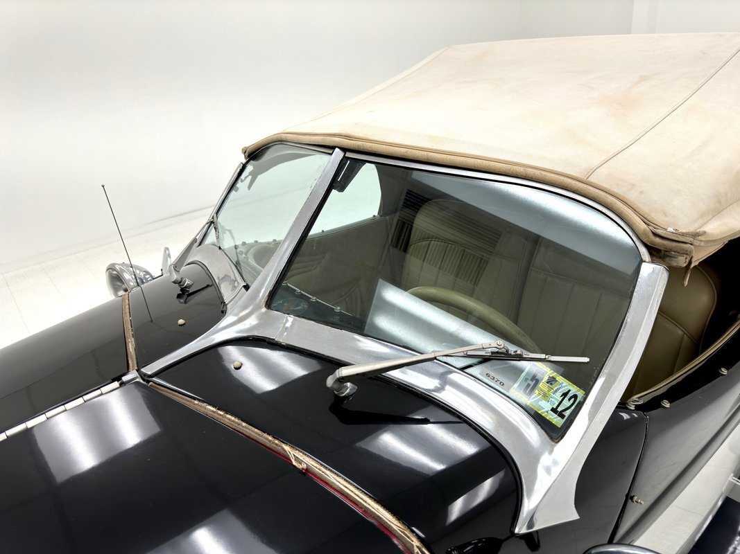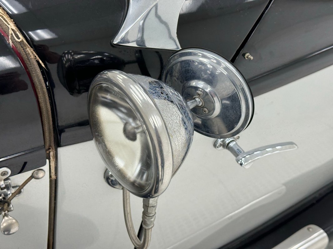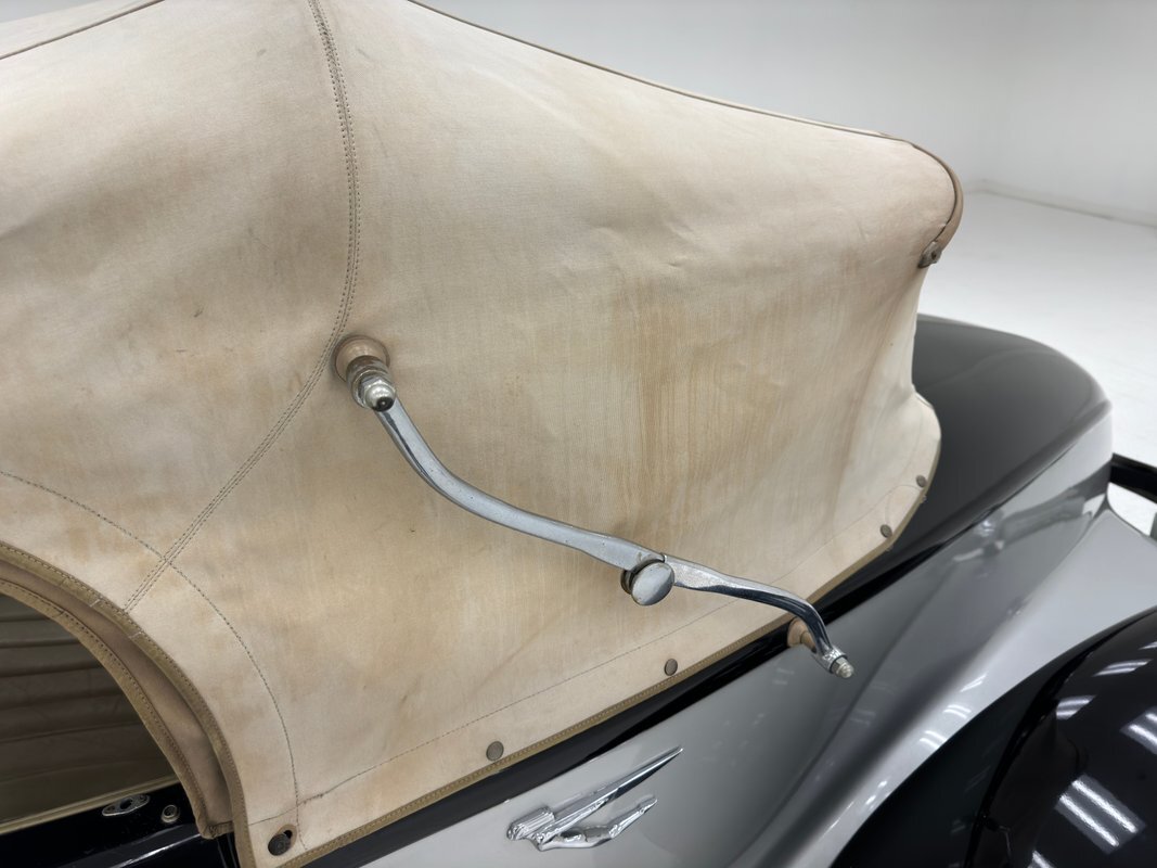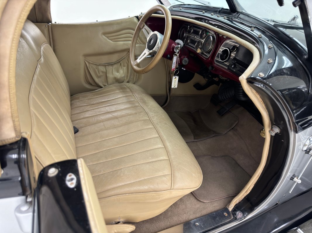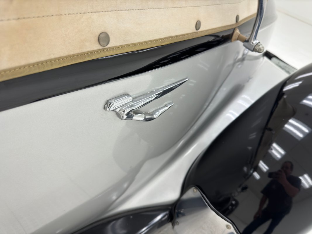 Painted in two tone black and silver for a classic look that's complemented with chrome elements and unique body parts. A smooth, flowing front bumper leads the car with fog lamps, an integrated grille, and large, external drum headlights. A winged woman is the hood ornament and her clothes have been blown off apparently. The side covers include long louvered vents and the faux exhaust pipes that crown its exotic looks. The front and rear fenders mirror each other with the rears outstretching from the body as the boat tail tapers inward, creating aerodynamic tunnels that allow air to pass around the car, (the latest iteration of the Ford GT uses a similar configuration). And that tail is something special as it comes to a point, flanked by round tail lights and in the case of our car, show two large exhaust tips protruding from under the sculpted bumper. Chrome rock guards match the chrome step guards on the running board and enhance the wonderful profile. An ivory canvas top with landau bars shows quite a bit of staining and if cleaned, would better match the wide white wall tires on 15-inch wire wheels. Other imperfections include some random scratches and scrapes, chipped paint, and some uneven gaps.