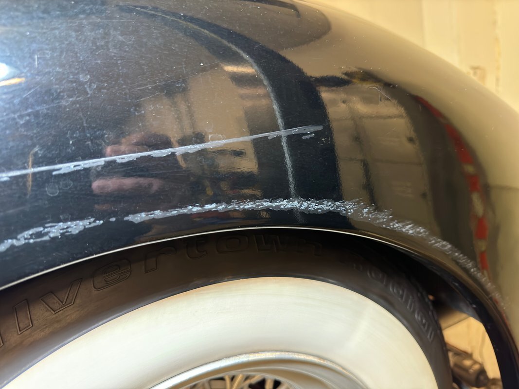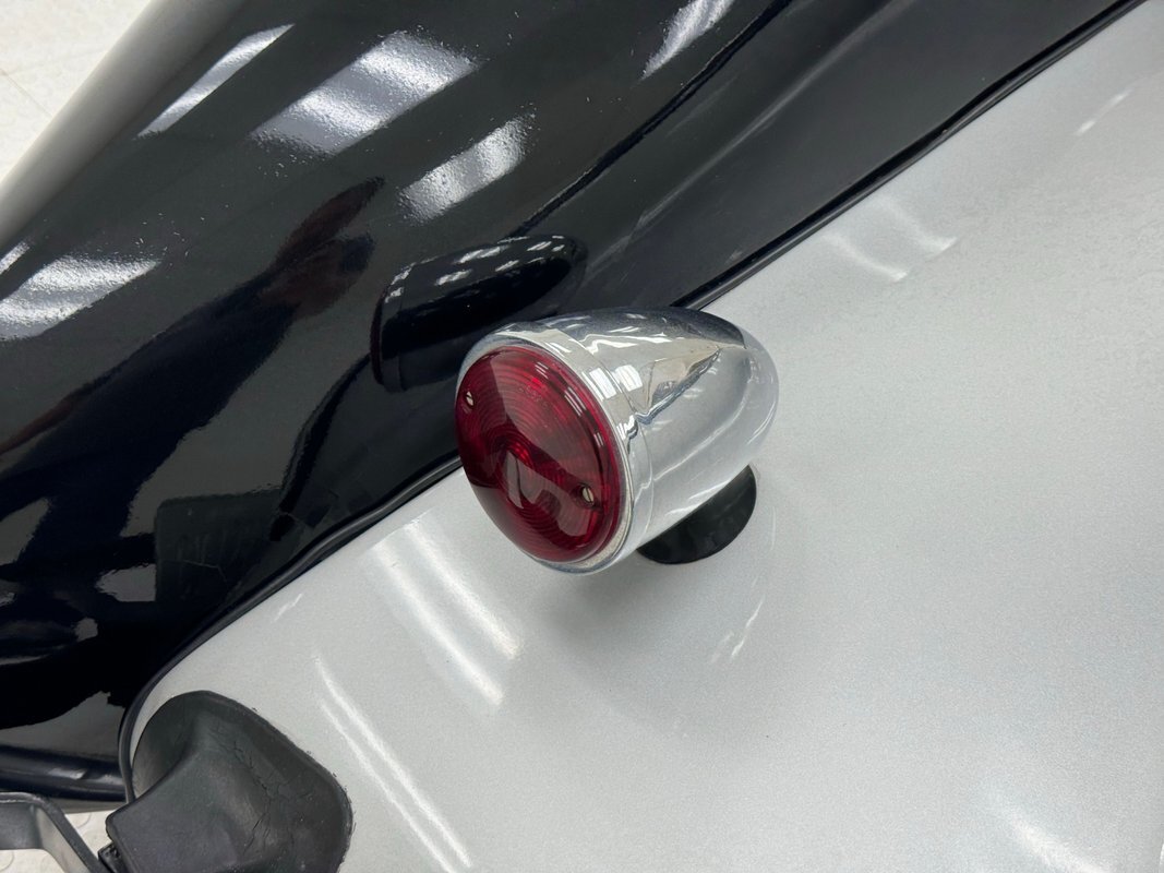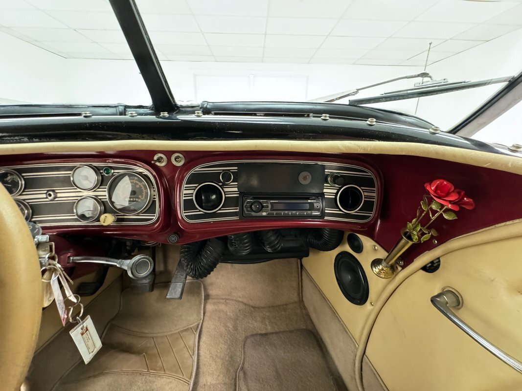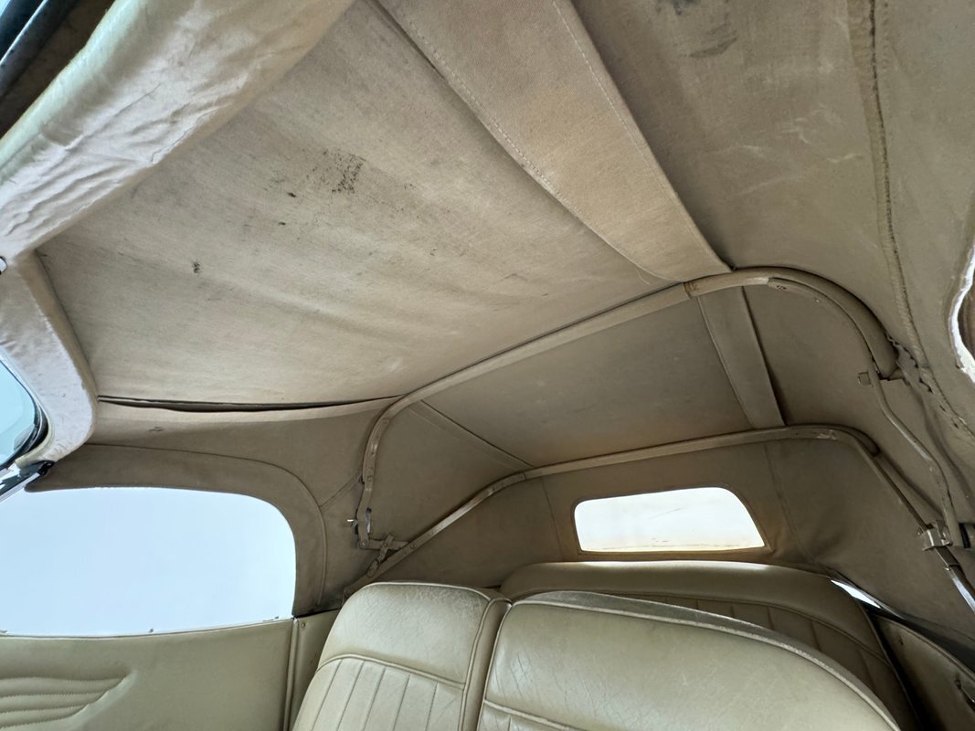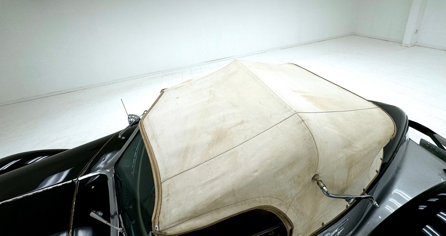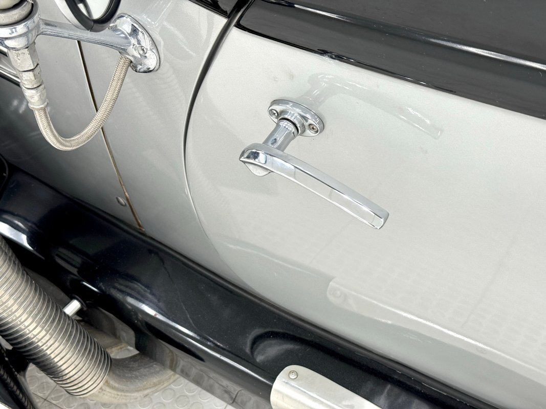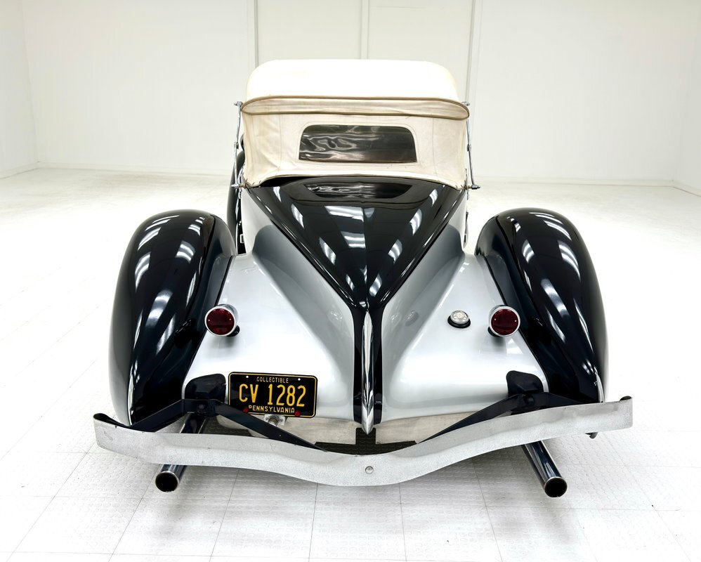 Painted in two tone black and silver for a classic look that's complemented with chrome elements and unique body parts. A smooth, flowing front bumper leads the car with fog lamps, an integrated grille, and large, external drum headlights. A winged woman is the hood ornament and her clothes have been blown off apparently. The side covers include long louvered vents and the faux exhaust pipes that crown its exotic looks. The front and rear fenders mirror each other with the rears outstretching from the body as the boat tail tapers inward, creating aerodynamic tunnels that allow air to pass around the car, (the latest iteration of the Ford GT uses a similar configuration). And that tail is something special as it comes to a point, flanked by round tail lights and in the case of our car, show two large exhaust tips protruding from under the sculpted bumper. Chrome rock guards match the chrome step guards on the running board and enhance the wonderful profile. An ivory canvas top with landau bars shows quite a bit of staining and if cleaned, would better match the wide white wall tires on 15-inch wire wheels. Other imperfections include some random scratches and scrapes, chipped paint, and some uneven gaps.