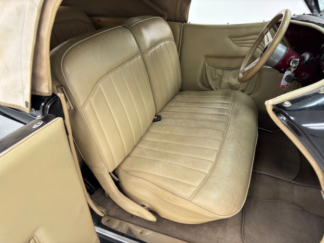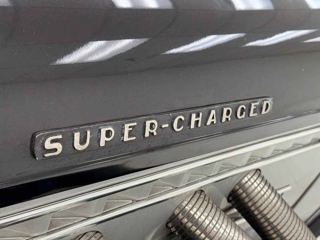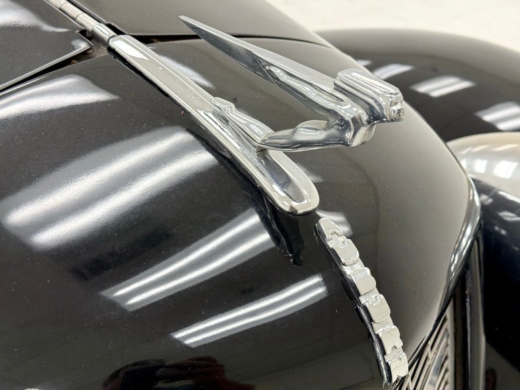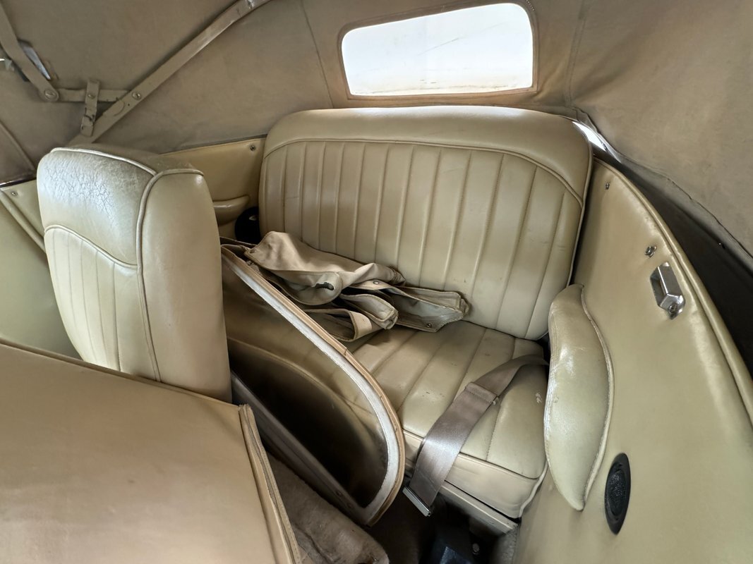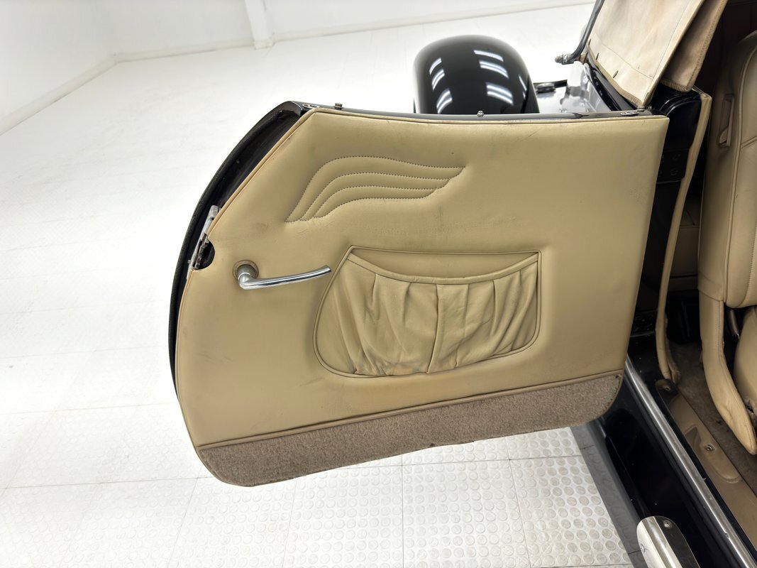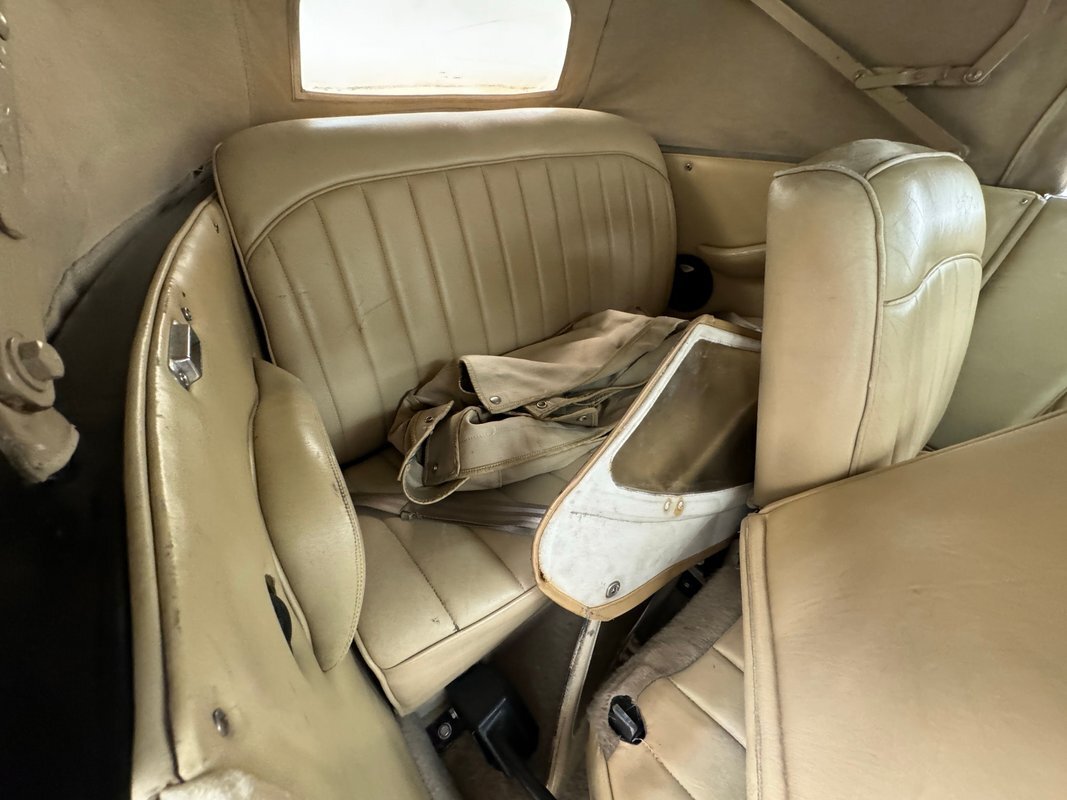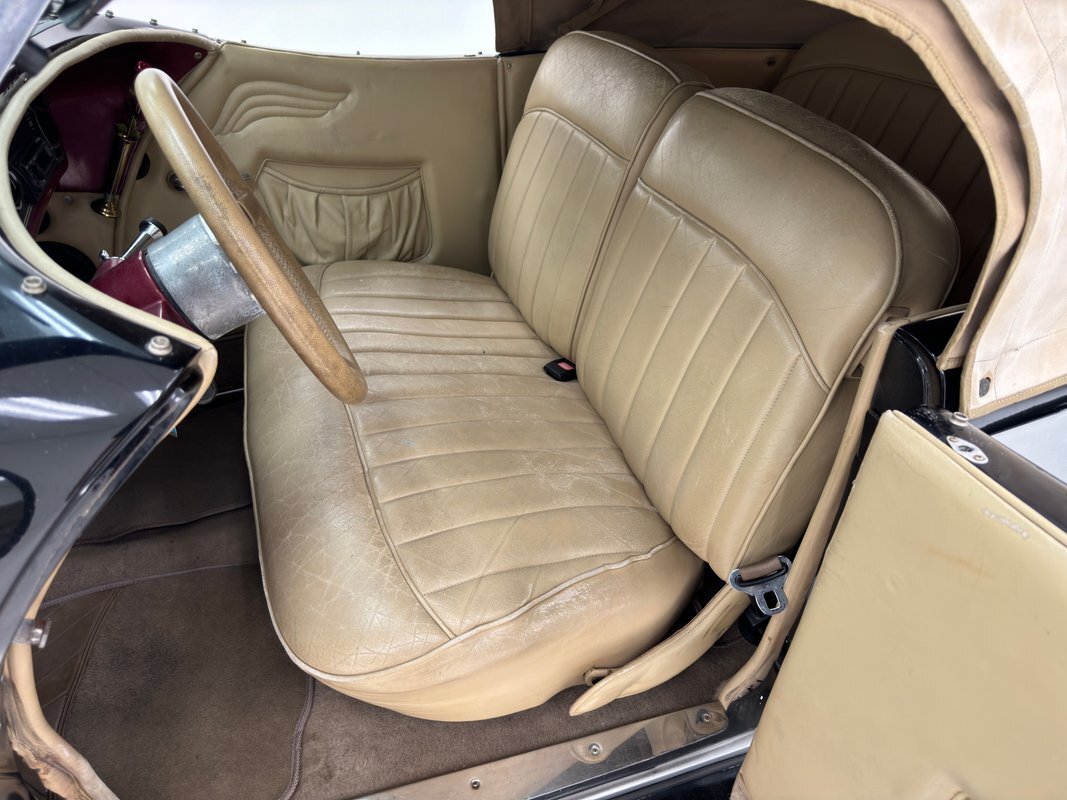 Painted in two tone black and silver for a classic look that's complemented with chrome elements and unique body parts. A smooth, flowing front bumper leads the car with fog lamps, an integrated grille, and large, external drum headlights. A winged woman is the hood ornament and her clothes have been blown off apparently. The side covers include long louvered vents and the faux exhaust pipes that crown its exotic looks. The front and rear fenders mirror each other with the rears outstretching from the body as the boat tail tapers inward, creating aerodynamic tunnels that allow air to pass around the car, (the latest iteration of the Ford GT uses a similar configuration). And that tail is something special as it comes to a point, flanked by round tail lights and in the case of our car, show two large exhaust tips protruding from under the sculpted bumper. Chrome rock guards match the chrome step guards on the running board and enhance the wonderful profile. An ivory canvas top with landau bars shows quite a bit of staining and if cleaned, would better match the wide white wall tires on 15-inch wire wheels. Other imperfections include some random scratches and scrapes, chipped paint, and some uneven gaps.