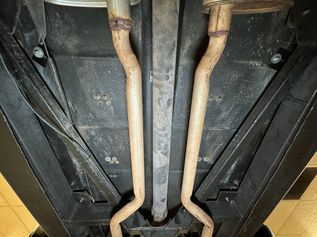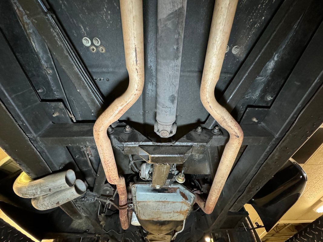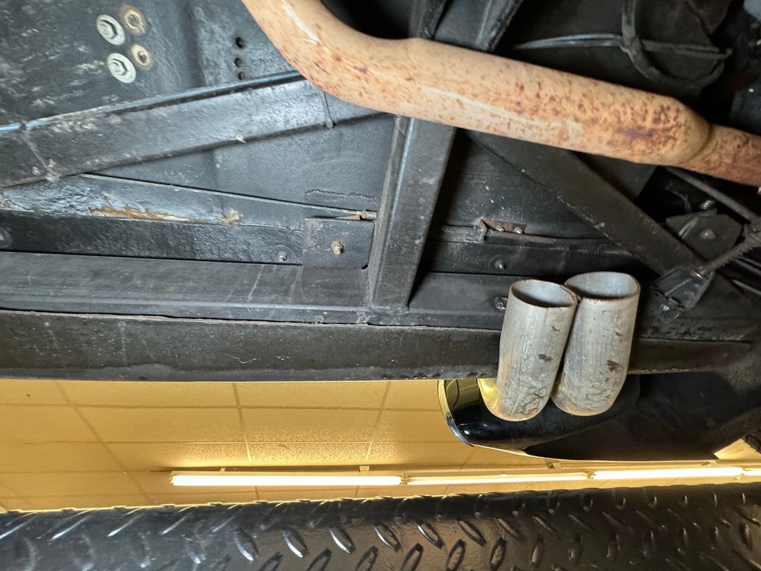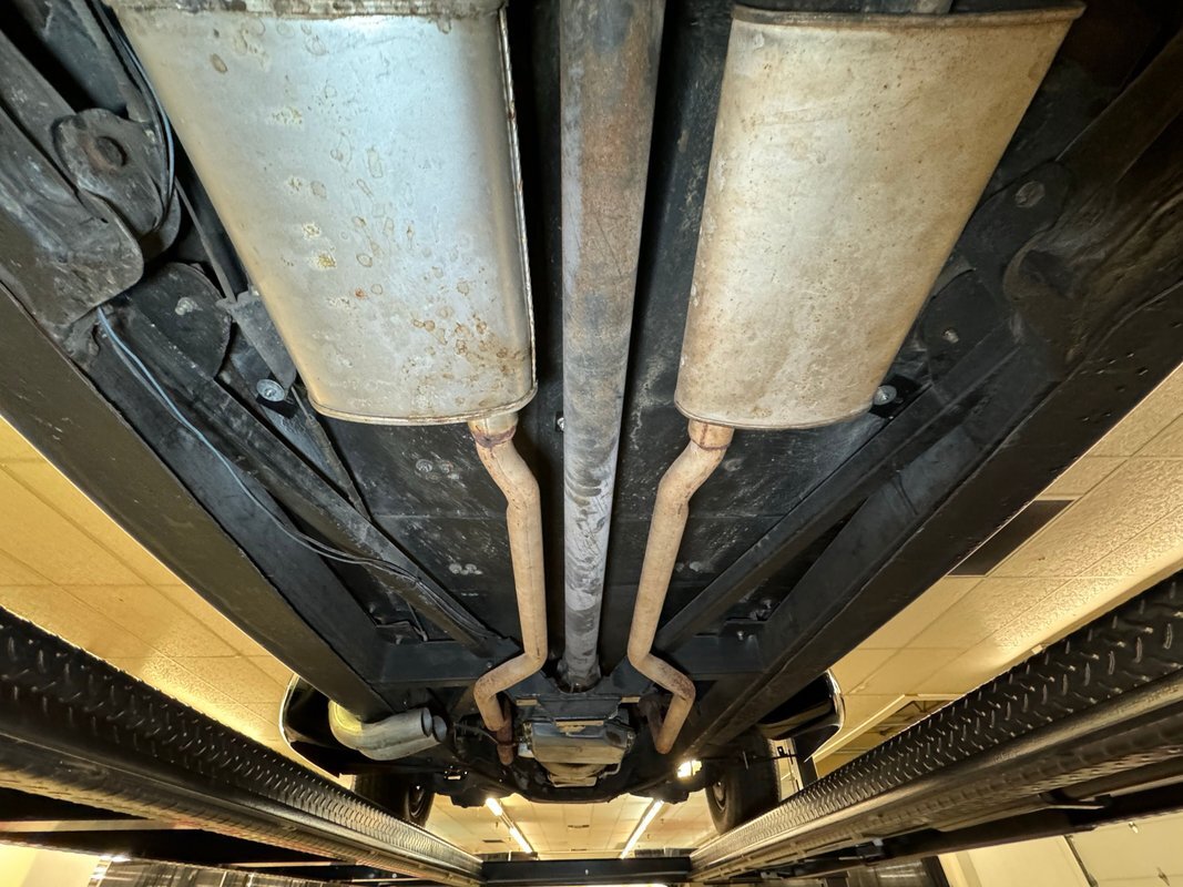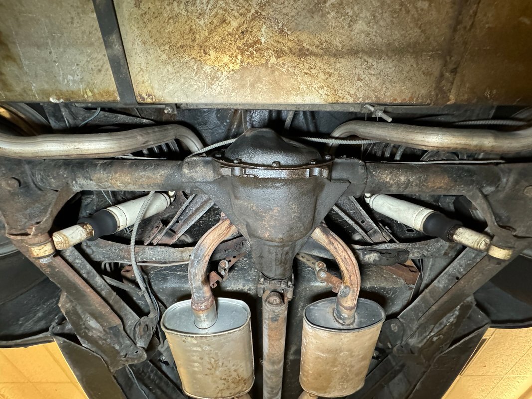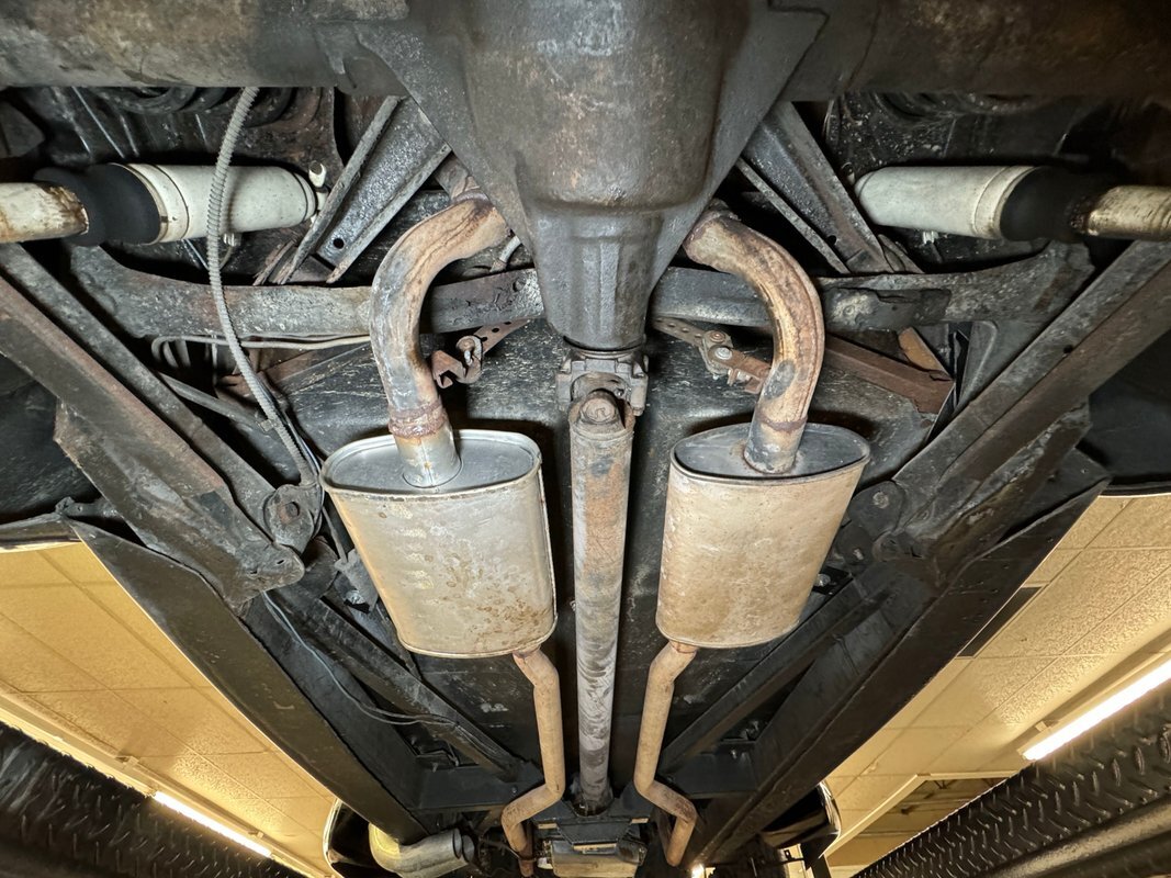 Driver quality underneath as well with ample surface rust as expected, some residual oil, and overall evidence of usage. The dual exhaust finds a pair of stock style mufflers then exits out the back as previously noted. Front suspension is independent and consists of coil springs while the back is a 4 link with coil springs.