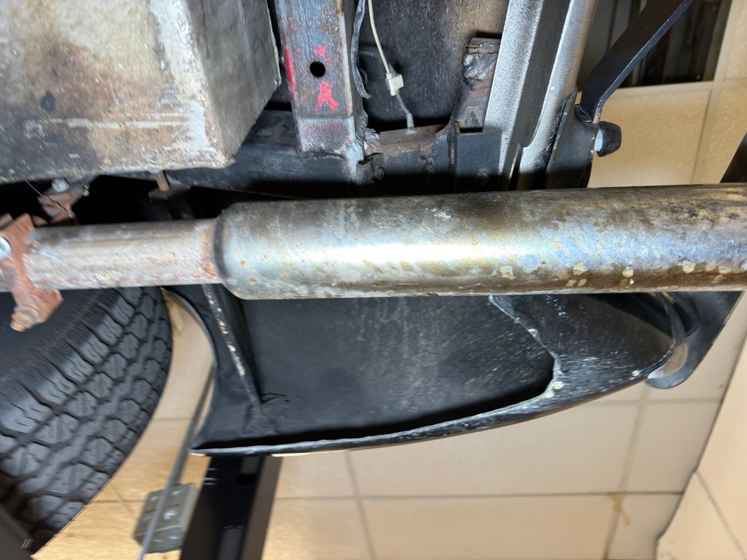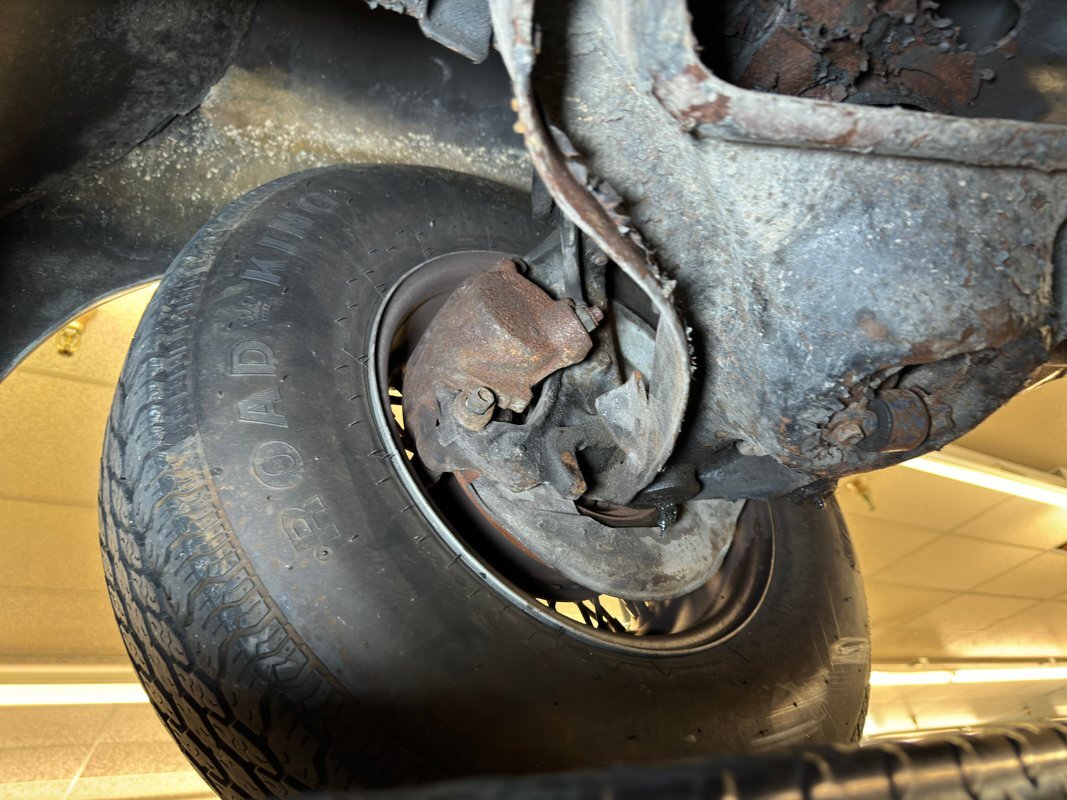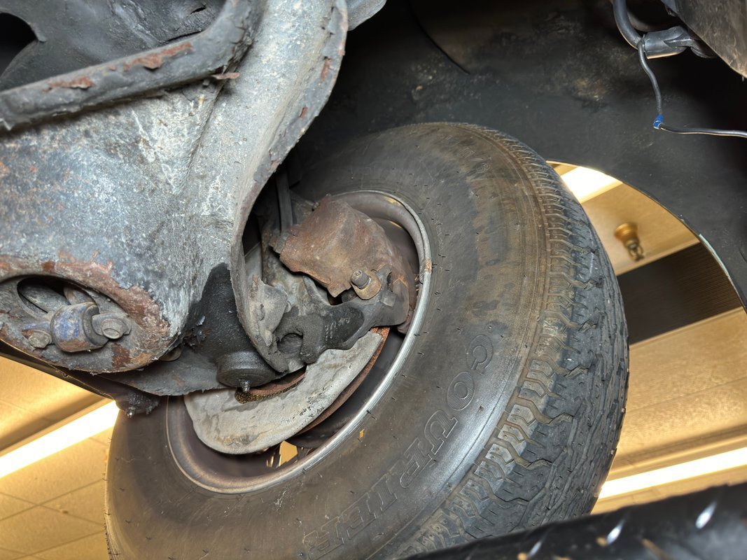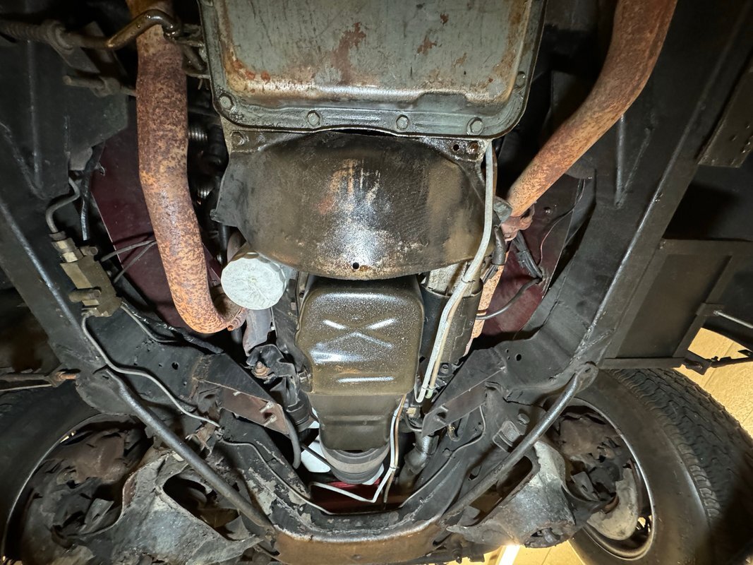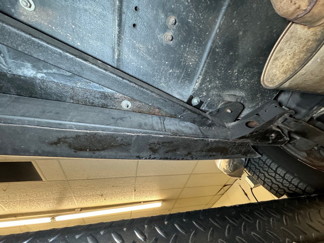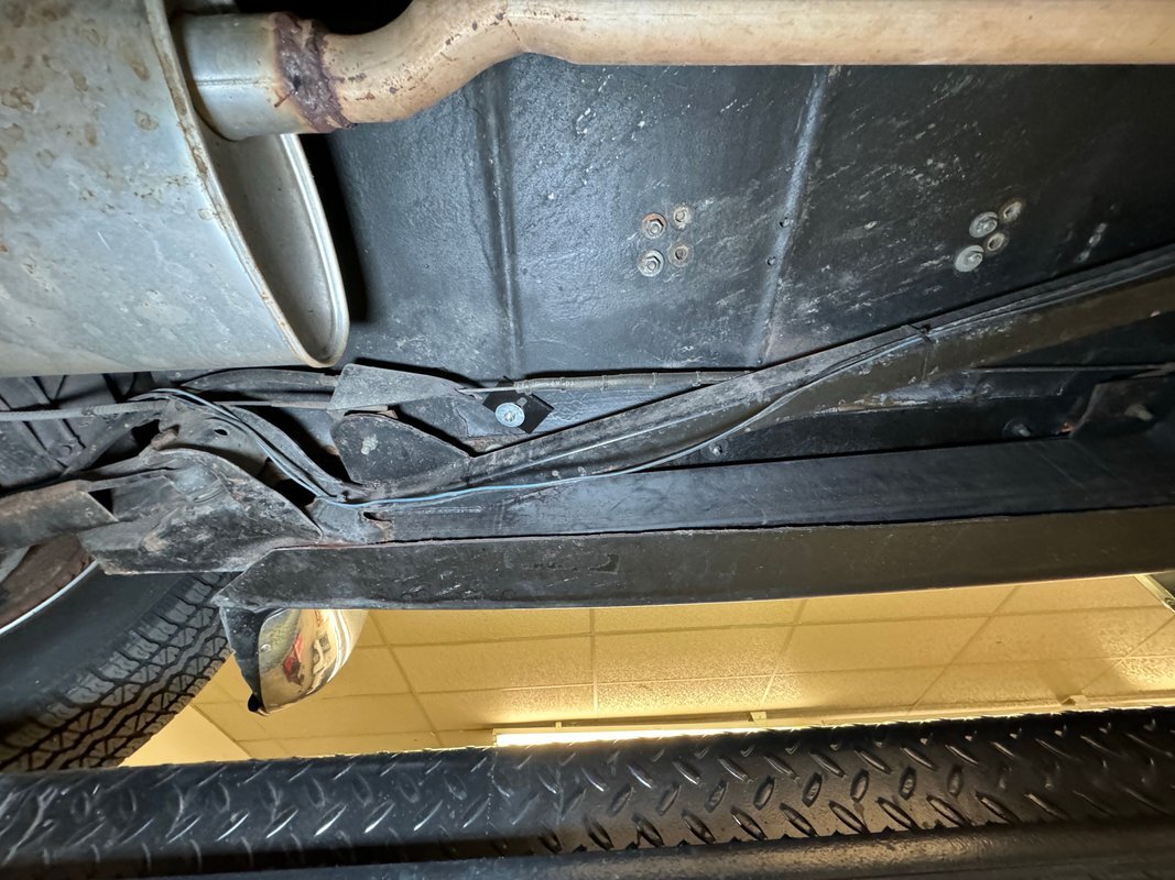 Driver quality underneath as well with ample surface rust as expected, some residual oil, and overall evidence of usage. The dual exhaust finds a pair of stock style mufflers then exits out the back as previously noted. Front suspension is independent and consists of coil springs while the back is a 4 link with coil springs.
