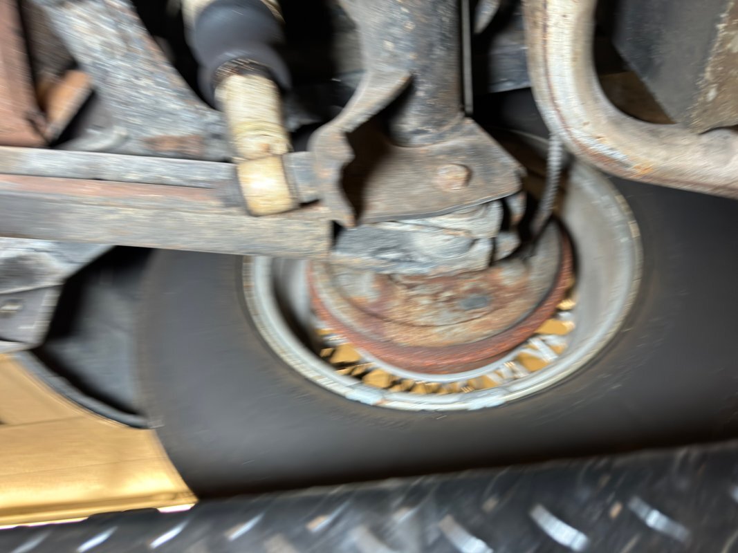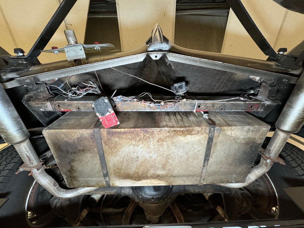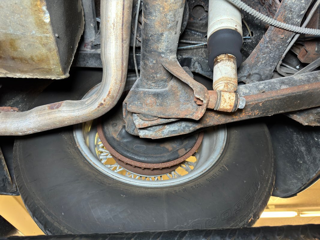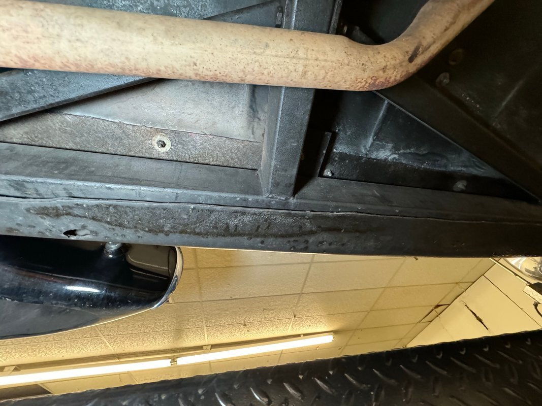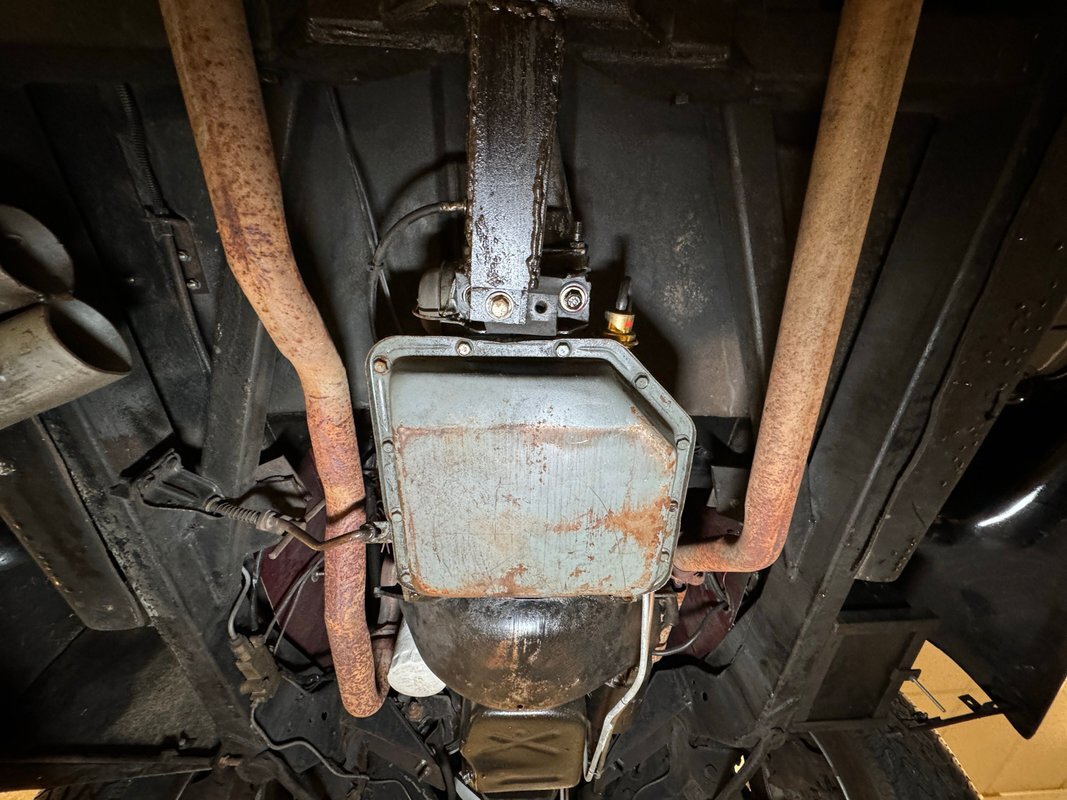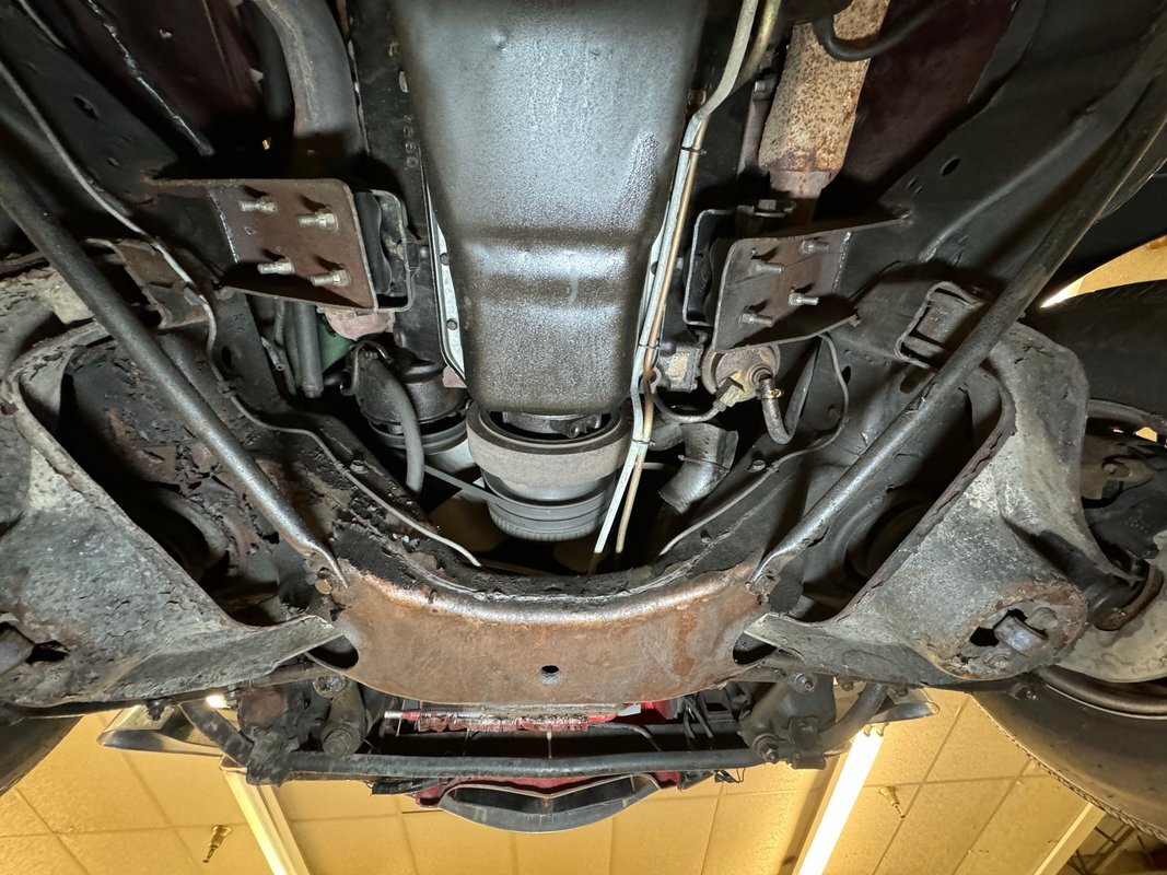 Driver quality underneath as well with ample surface rust as expected, some residual oil, and overall evidence of usage. The dual exhaust finds a pair of stock style mufflers then exits out the back as previously noted. Front suspension is independent and consists of coil springs while the back is a 4 link with coil springs.