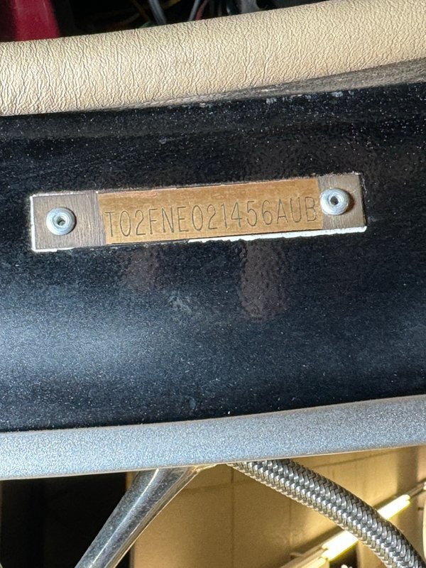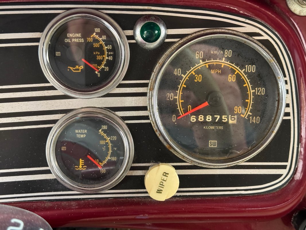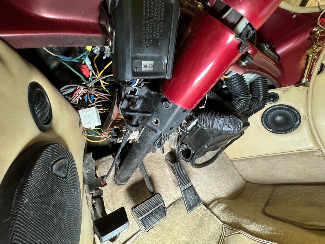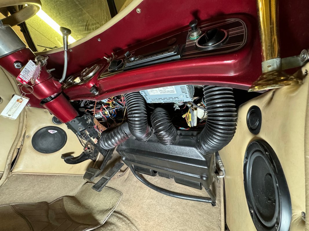 Beige leather door panels include a stitched wing design and pleated pocket along with door actuator which open the door suicide style. The split bench leather seat looks more modern and shows some wear, as expected on a car that has been used and enjoyed, but no major tears are seen. The rear seat, also in stitched beige leather has fared better and includes side mounted armrests on the walls. Leather also wraps the steering wheel which also shows its age but fully intact. The shifter is on the column which leads to a red backed dashboard with art deco design and Stewart Warner gauges that appear to be from the late 1970's era. The passenger side of the dash contains an AM/FM/CD radio and a flower vase is mounted to the right. Tan low pile carpet covers the floor along with floor mats, while the footwells also contain speakers. While down here, we note some door trim on the driver's side is detaching.