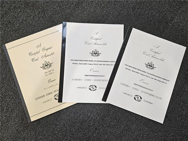 Documentation includes certification booklets from the Auburn-Cord-Duesenberg Club documenting the car’s status across several decades of enjoyment.