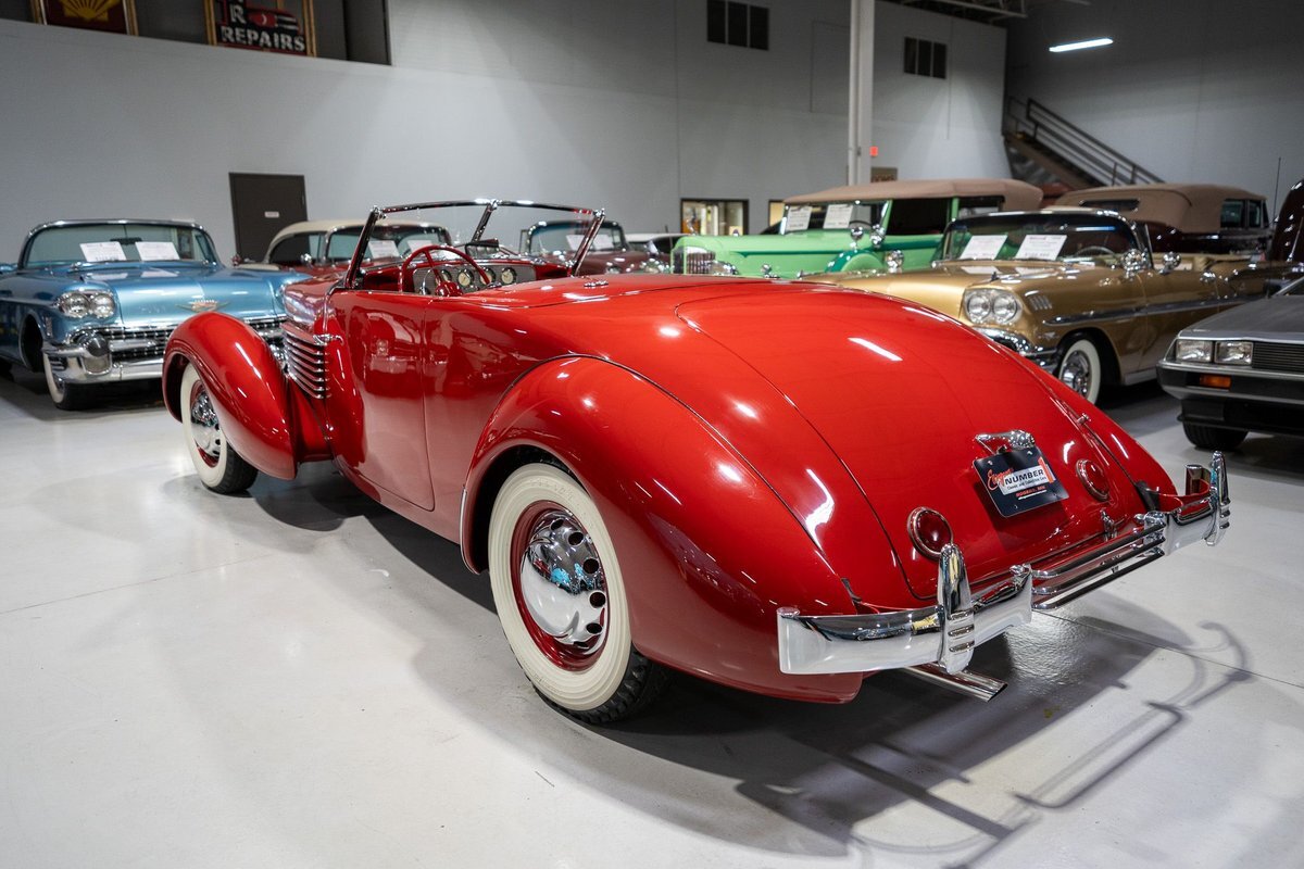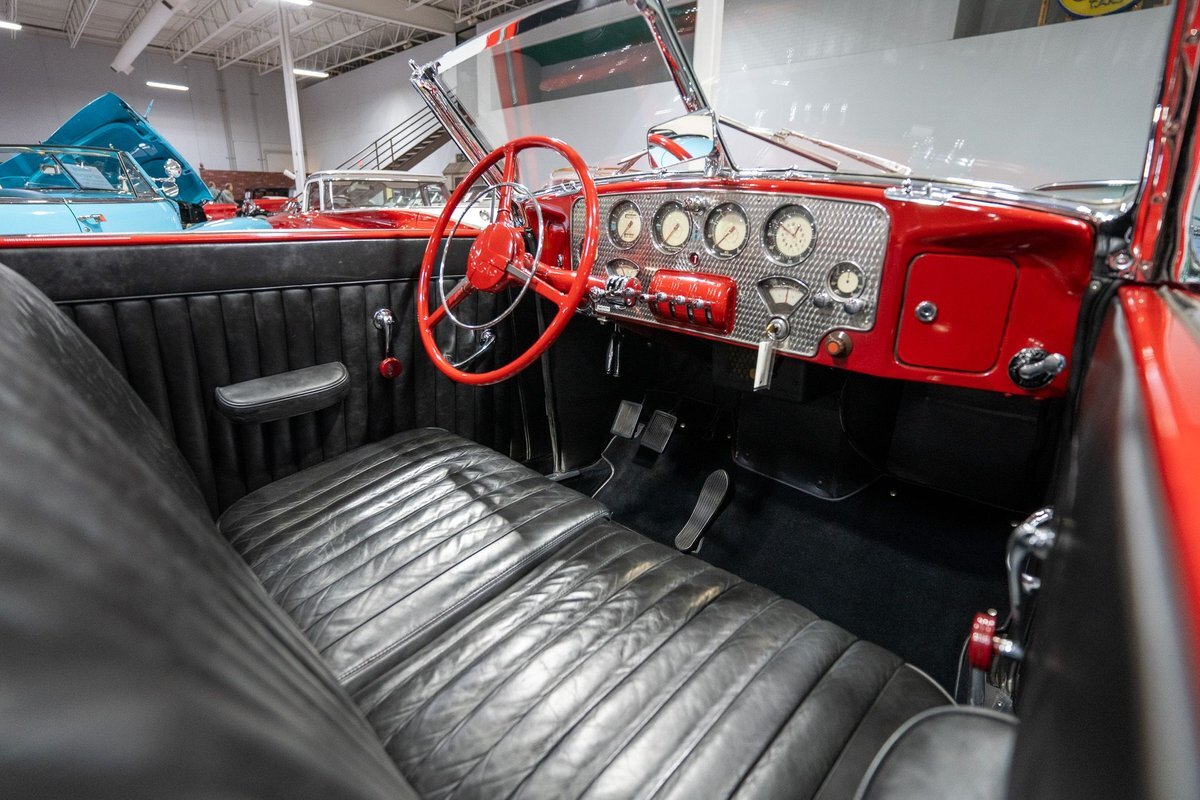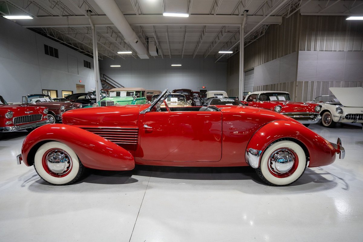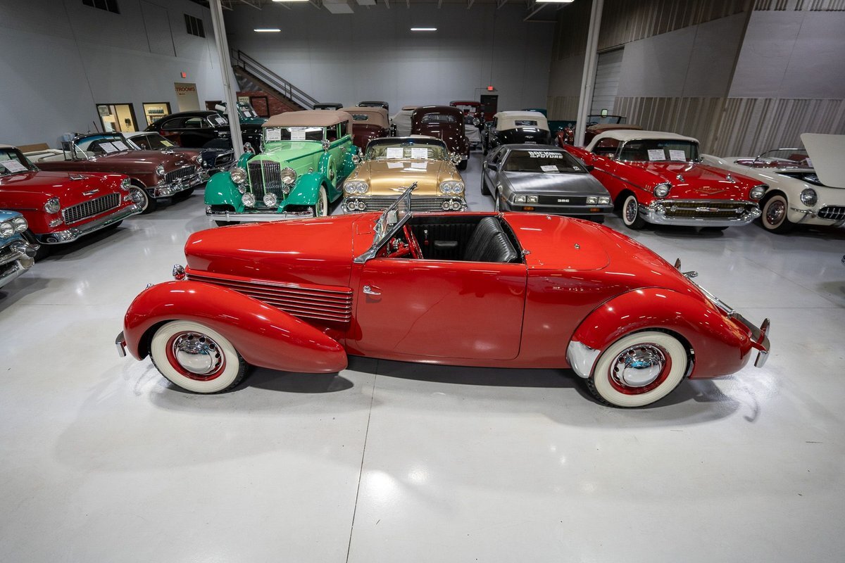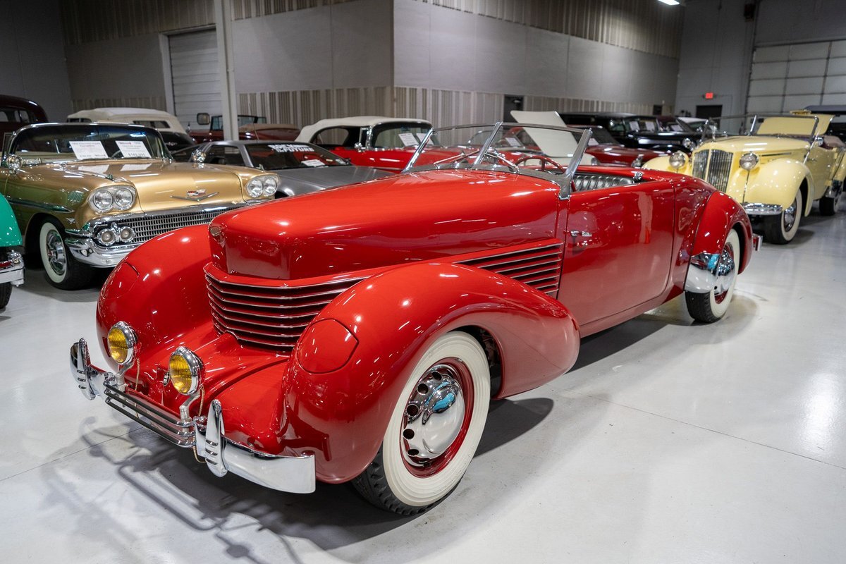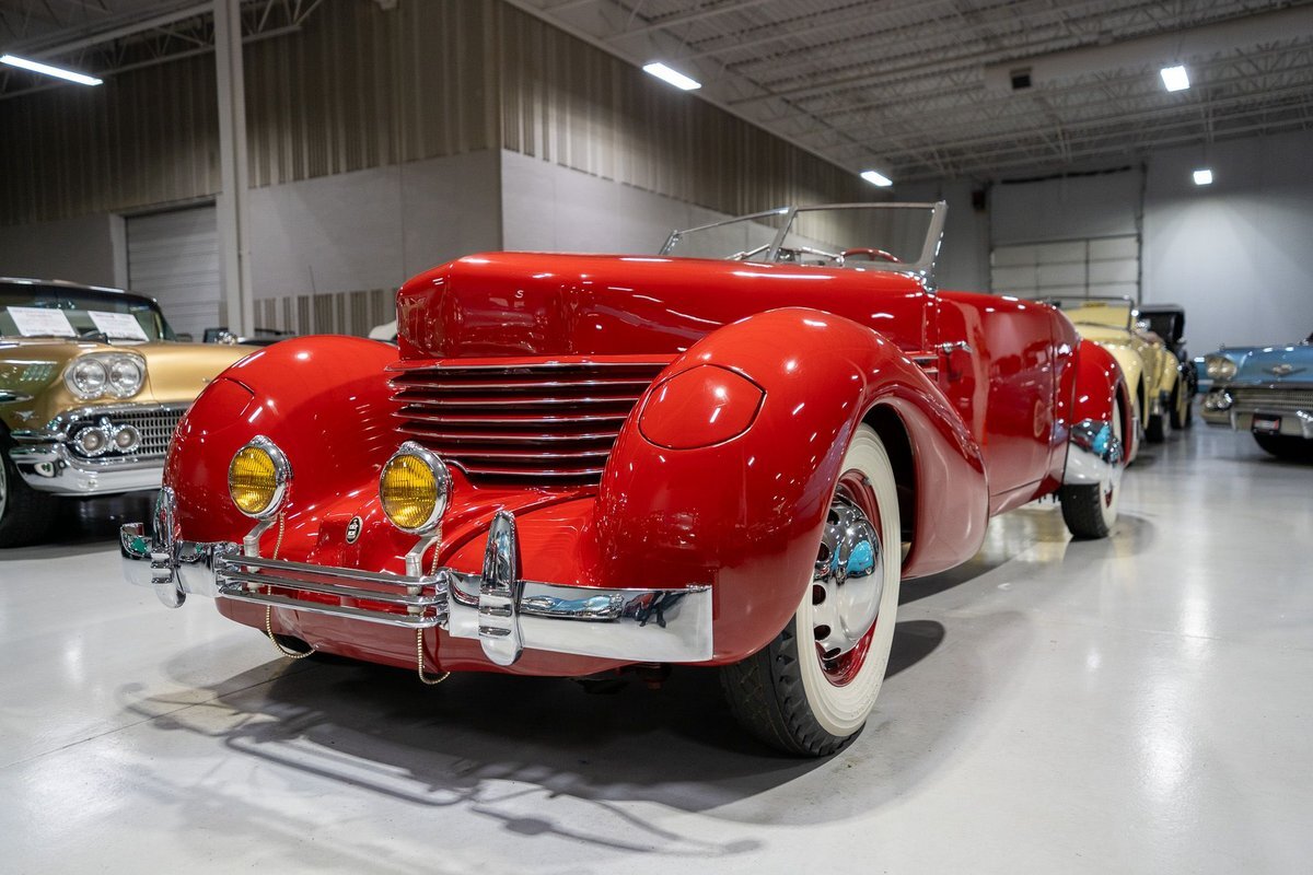 This 1936 Cord 810 Sportsman Convertible is a beautifully restored, concours award-winning example with southern history. Established in 1929, the Cord Corporation, was the namesake holding company for Errett Lobban "E.L." Cord's automotive ventures, including his shares in the Auburn Automobile Co. and Dusenberg, Inc., and the Lycoming Mfg. Co. among others. Shortly after the establishment of the Cord Corporation, the company began producing its first automobile in June 1929 with the Cord nameplate, the Cord L-29. While the Cord L-29 was and continues to be lauded for its gorgeous stance and appearance, the timing for its release could not have been worse. With the onset of the Great Depression starting in late 1929 and then continuing into 1930 and beyond, Cord production ceased in the end of 1931 and the remaining 157 models in stock were sold off at 1932 models. By the mid-1930s the economy began to recover and Cord reintroduced its novel front-wheel-drive automobiles, only this time sporting a new, distinctive "Coffin Nose" design. Styled by Gordon Buehrig, the new "Coffin Nose" Cord 810 models were essentially designed to be the "Baby Duesenberg." Not only did the 1936 Cord 810s feature famous new styling, they are also renowned for a number of revolutionary updates automobile design including front wheel drive, "semi-automatic" transmissions, hide-away convertible tops, and "roll up headlights." Touted in advertising materials as a car that "always 'goes where it is pointed,'" the front wheel drive design of the 810 Cord also allowed for a lower ride height, which eliminated the need for running boards. Another innovation for Cord in 1936 was the introduction of a "semi-automatic" transmission that utilized a "remote-controlled" pre-selector shifter that is set into the desired gear on the dash and then when the clutch is depressed the transmission shifts into the selected gear. Not only did this unique transmission design make for a roomier driver's compartment, it also paved the way for the true automatic transmissions that rose in popularity in the 50s and now dominate in automobiles today. Despite their ingenuity, financial issues finally put a halt on Cord's production in August 1937, with the company producing a mere 2,992 810 and 812 models during its short run from 1936-1937. This particular example spent its most recent years in several prominent collections and was awarded Best in Class and Best in Show awards at a concours event several years ago. Powering this '36 Cord Sportsman is a 288.64 Cubic Inch Lycoming V8 engine fed by a single 2 barrel carburetor that together were said to have created 125 horsepower when new. The 289 Lycoming V8 is mated to a 4 speed manual transaxle that is shifted via a novel for 1936 dash-mounted remote control shifter where the driver selects their desired gear, then depresses the clutch pedal and the car shifts into that gear. Exhaust exits this Cord's impressive powerplant via a single chrome-tipped exhaust port. Driving power is sent from the Lycoming V8 and transaxle to the front wheels making this Cord Convertible a front wheel drive vehicle. This 1936 Cord 810 rides on a set of wide whitewall bias-ply tires mounted on steel wheels and they are accented with a set of full wheelcovers, which together give this convertible a truly upscale look. The exterior chrome and brightwork on this 1936 Sportsman is gorgeous and helps an already stand-out car further stand out in a crowd. The black cloth convertible top is in wonderful condition as well and, like virtually every car of the pre-war era, is manually operated. Another novelty of this 1936 Cord Convertible are the retractable headlights that can be raised for nighttime driving or lowered flush into the fenders during the day. The exterior on this '36 Cord 810 has been refinished in a beautiful Rich Maroon paint that completes the fantastic exterior appearance of the CCCA Full Classic. The interior on this 1936 Cord 810 Sportsman is absolutely stunning! The bench seat has been reupholstered in beautiful black leather that provides a nice contrast with the rest of the car. The matching upholstered door panels and armrests, black carpeting, color-matched painted dash with its engine-turned instrument panel, and steering wheel are all in fantastic condition as well and appear to be in their stock configuration. The instrument cluster features an impressive collection of important instrumentation including a 150 MPH speedometer, 5,000 RPM tachometer, oil pressure gauge, temperature gauge, amp gauge, and fuel gauge, along with an AM radio and full-size clock. The dash is finished with a pair of locking gloveboxes that straddle the instrument panel. Whether you're buying your first full classic car or you're an established ACD or CCCA collector, this 1936 Cord 810 Sportsman Convertible would make an excellent choice. Give Ellingson's a call today at763-428-7337!