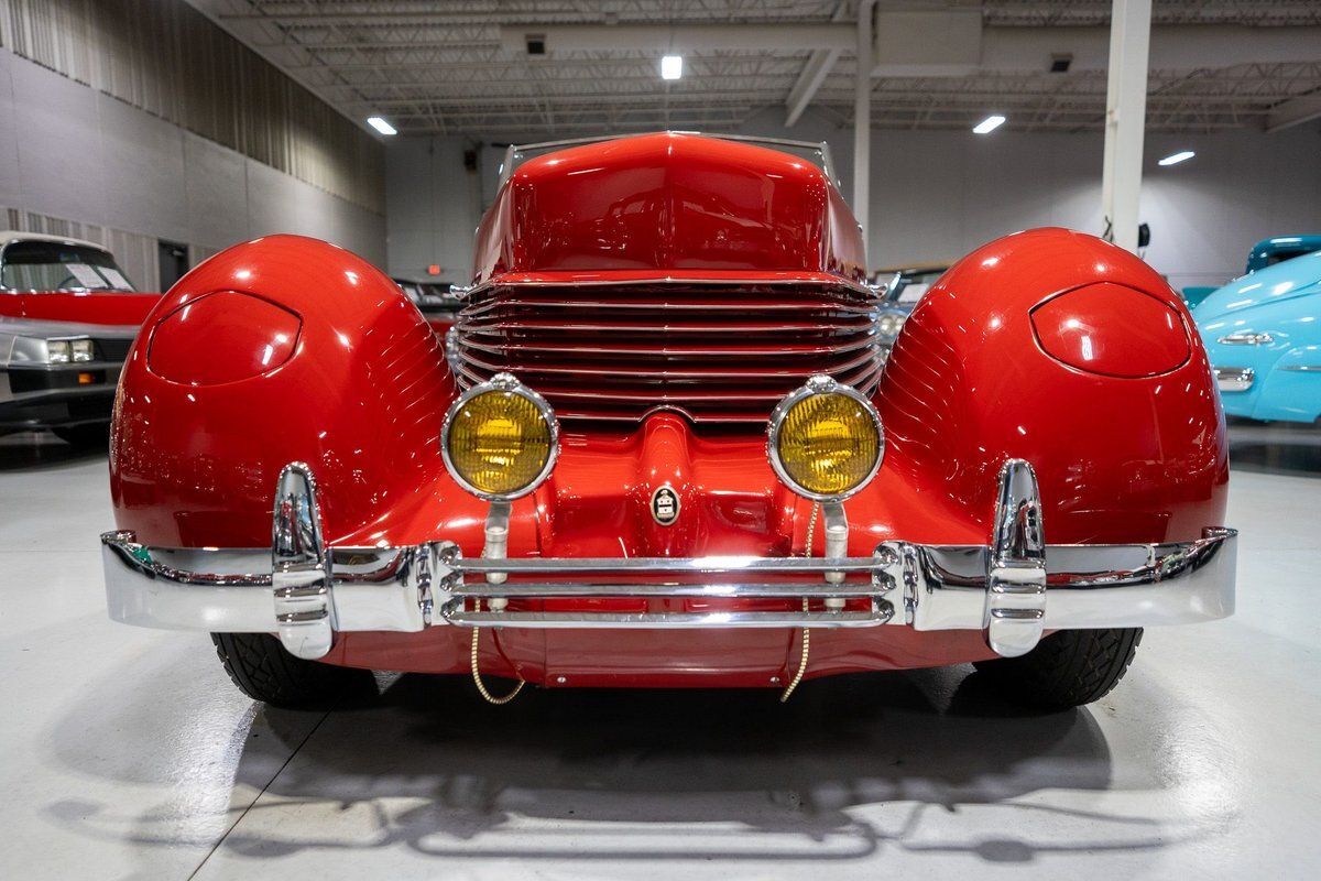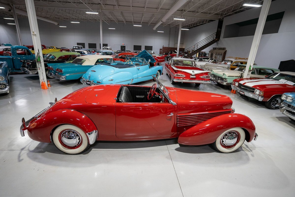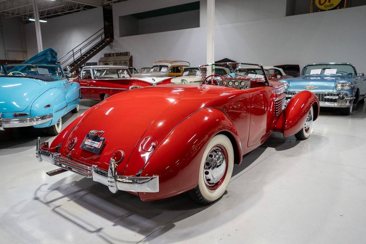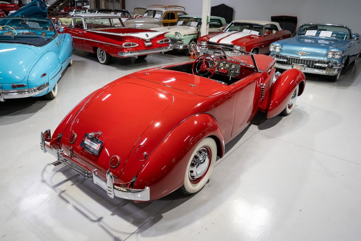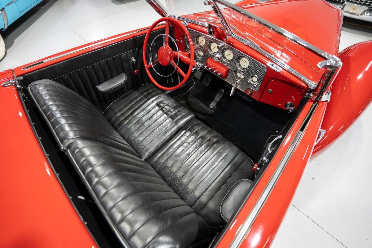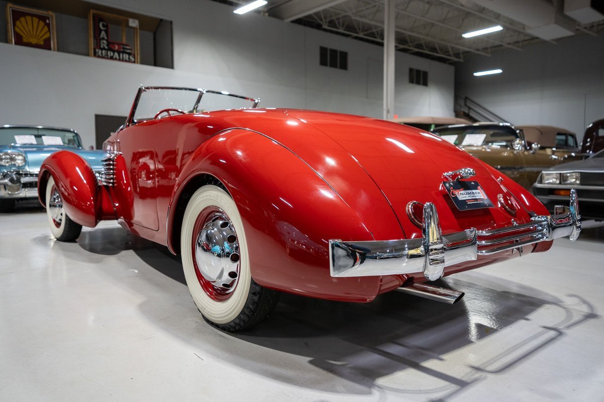 This 1936 Cord 810 Sportsman Convertible is a beautifully restored, concours award-winning example with southern history. Established in 1929, the Cord Corporation, was the namesake holding company for Errett Lobban "E.L." Cord's automotive ventures, including his shares in the Auburn Automobile Co. and Dusenberg, Inc., and the Lycoming Mfg. Co. among others. Shortly after the establishment of the Cord Corporation, the company began producing its first automobile in June 1929 with the Cord nameplate, the Cord L-29. While the Cord L-29 was and continues to be lauded for its gorgeous stance and appearance, the timing for its release could not have been worse. With the onset of the Great Depression starting in late 1929 and then continuing into 1930 and beyond, Cord production ceased in the end of 1931 and the remaining 157 models in stock were sold off at 1932 models. By the mid-1930s the economy began to recover and Cord reintroduced its novel front-wheel-drive automobiles, only this time sporting a new, distinctive "Coffin Nose" design. Styled by Gordon Buehrig, the new "Coffin Nose" Cord 810 models were essentially designed to be the "Baby Duesenberg." Not only did the 1936 Cord 810s feature famous new styling, they are also renowned for a number of revolutionary updates automobile design including front wheel drive, "semi-automatic" transmissions, hide-away convertible tops, and "roll up headlights." Touted in advertising materials as a car that "always 'goes where it is pointed,'" the front wheel drive design of the 810 Cord also allowed for a lower ride height, which eliminated the need for running boards. Another innovation for Cord in 1936 was the introduction of a "semi-automatic" transmission that utilized a "remote-controlled" pre-selector shifter that is set into the desired gear on the dash and then when the clutch is depressed the transmission shifts into the selected gear. Not only did this unique transmission design make for a roomier driver's compartment, it also paved the way for the true automatic transmissions that rose in popularity in the 50s and now dominate in automobiles today. Despite their ingenuity, financial issues finally put a halt on Cord's production in August 1937, with the company producing a mere 2,992 810 and 812 models during its short run from 1936-1937. This particular example spent its most recent years in several prominent collections and was awarded Best in Class and Best in Show awards at a concours event several years ago. Powering this '36 Cord Sportsman is a 288.64 Cubic Inch Lycoming V8 engine fed by a single 2 barrel carburetor that together were said to have created 125 horsepower when new. The 289 Lycoming V8 is mated to a 4 speed manual transaxle that is shifted via a novel for 1936 dash-mounted remote control shifter where the driver selects their desired gear, then depresses the clutch pedal and the car shifts into that gear. Exhaust exits this Cord's impressive powerplant via a single chrome-tipped exhaust port. Driving power is sent from the Lycoming V8 and transaxle to the front wheels making this Cord Convertible a front wheel drive vehicle. This 1936 Cord 810 rides on a set of wide whitewall bias-ply tires mounted on steel wheels and they are accented with a set of full wheelcovers, which together give this convertible a truly upscale look. The exterior chrome and brightwork on this 1936 Sportsman is gorgeous and helps an already stand-out car further stand out in a crowd. The black cloth convertible top is in wonderful condition as well and, like virtually every car of the pre-war era, is manually operated. Another novelty of this 1936 Cord Convertible are the retractable headlights that can be raised for nighttime driving or lowered flush into the fenders during the day. The exterior on this '36 Cord 810 has been refinished in a beautiful Rich Maroon paint that completes the fantastic exterior appearance of the CCCA Full Classic. The interior on this 1936 Cord 810 Sportsman is absolutely stunning! The bench seat has been reupholstered in beautiful black leather that provides a nice contrast with the rest of the car. The matching upholstered door panels and armrests, black carpeting, color-matched painted dash with its engine-turned instrument panel, and steering wheel are all in fantastic condition as well and appear to be in their stock configuration. The instrument cluster features an impressive collection of important instrumentation including a 150 MPH speedometer, 5,000 RPM tachometer, oil pressure gauge, temperature gauge, amp gauge, and fuel gauge, along with an AM radio and full-size clock. The dash is finished with a pair of locking gloveboxes that straddle the instrument panel. Whether you're buying your first full classic car or you're an established ACD or CCCA collector, this 1936 Cord 810 Sportsman Convertible would make an excellent choice. Give Ellingson's a call today at763-428-7337!