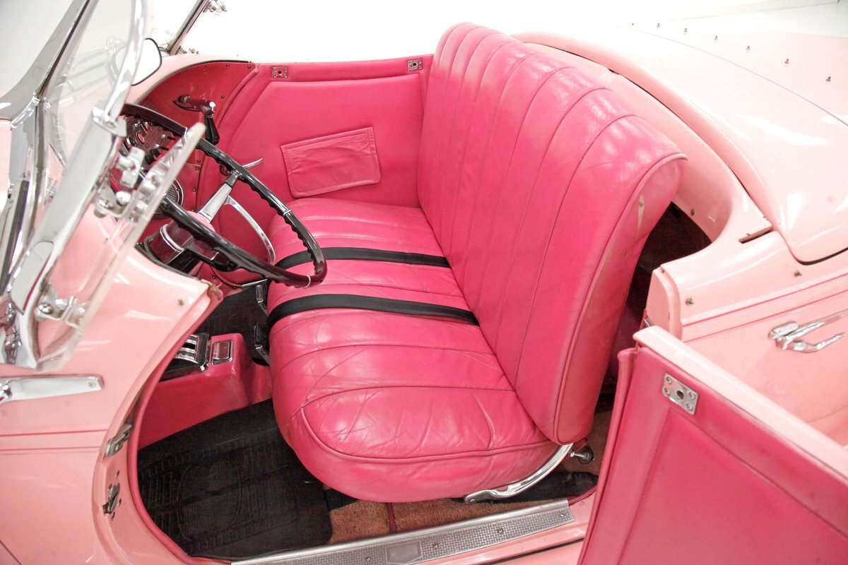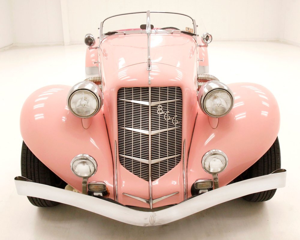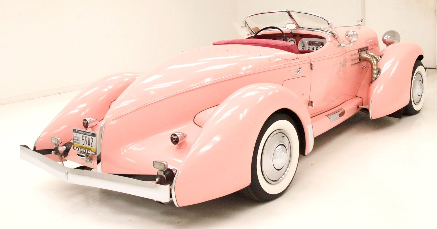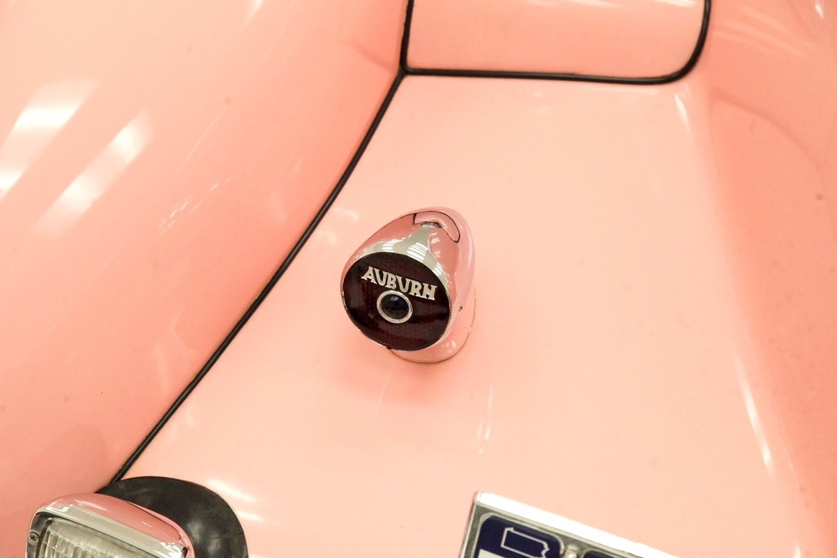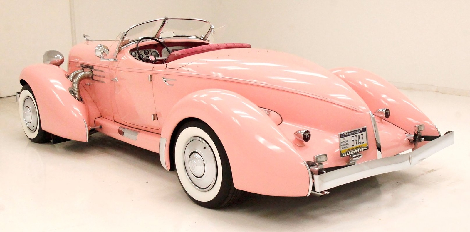 Fast forward to 1976 and go to Broken Arrow, Indiana and look up a gentleman named Glenn Pray. Here you'll find a man, who is in his second attempt at a reproduction, the first being the Cord which did not work out. So here we have his second attempt in the form of a reproduction fiberglass automobile emulating the Auburn 851/2 Boattail Speedsters. It does a pretty good job of it, with some obvious clues to the fact that it is a reproduction. This 13,653 title verified actual mile example was custom ordered in the blazing pink with hot pink lipstick interior, and all the options this manufacturer could muster up at the time. I'll put it into the category of and now I've literally seen everything!