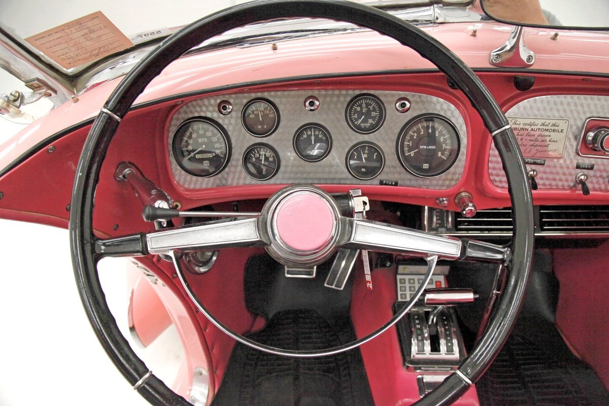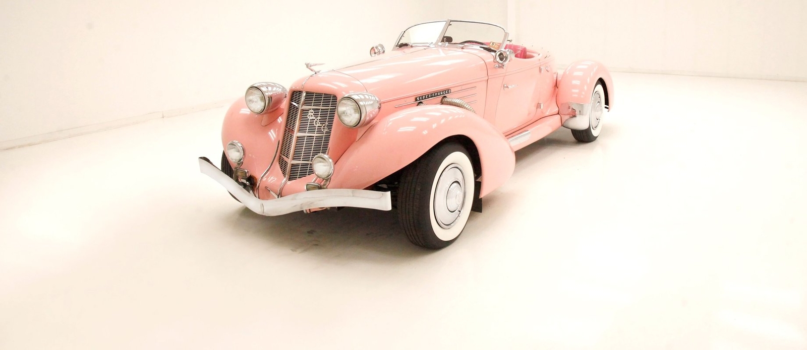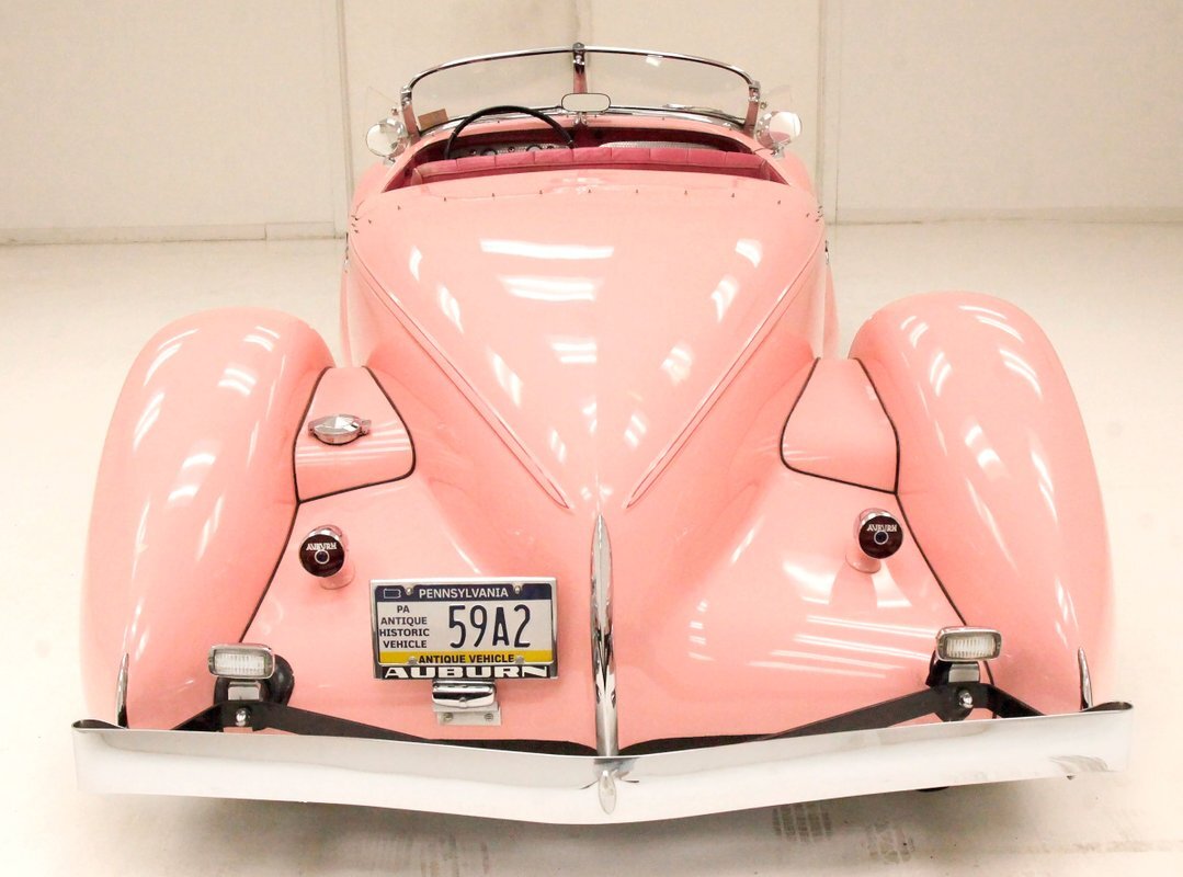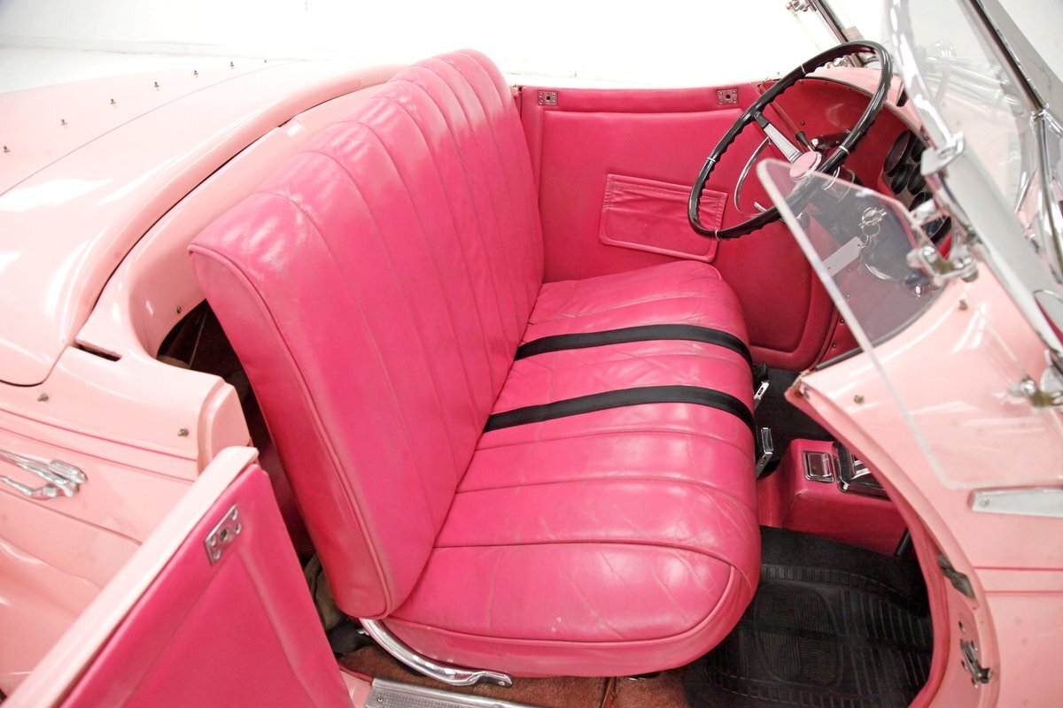 Fast forward to 1976 and go to Broken Arrow, Indiana and look up a gentleman named Glenn Pray. Here you'll find a man, who is in his second attempt at a reproduction, the first being the Cord which did not work out. So here we have his second attempt in the form of a reproduction fiberglass automobile emulating the Auburn 851/2 Boattail Speedsters. It does a pretty good job of it, with some obvious clues to the fact that it is a reproduction. This 13,653 title verified actual mile example was custom ordered in the blazing pink with hot pink lipstick interior, and all the options this manufacturer could muster up at the time. I'll put it into the category of and now I've literally seen everything!
