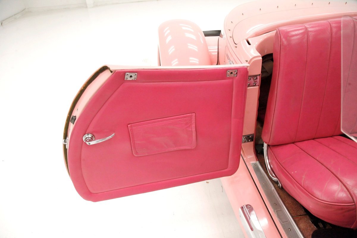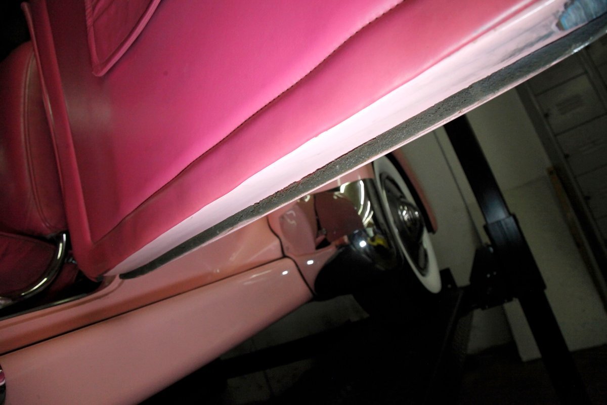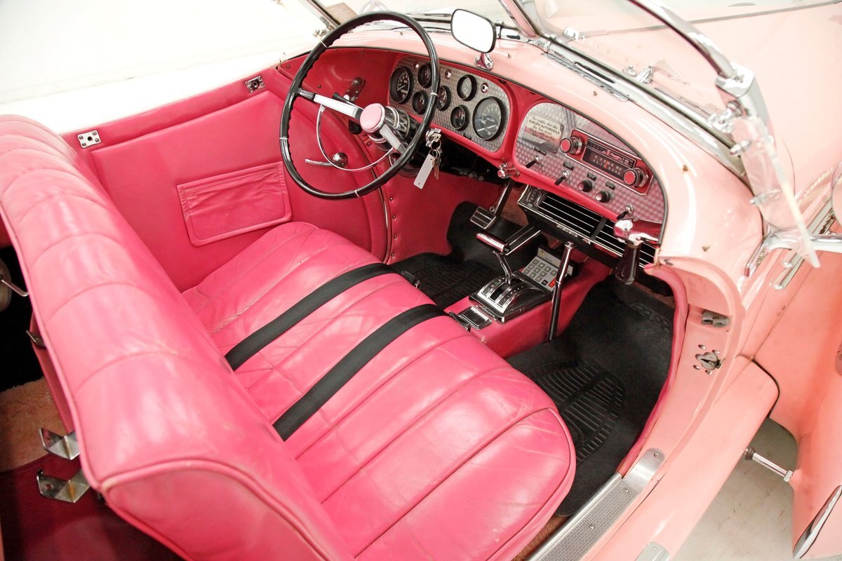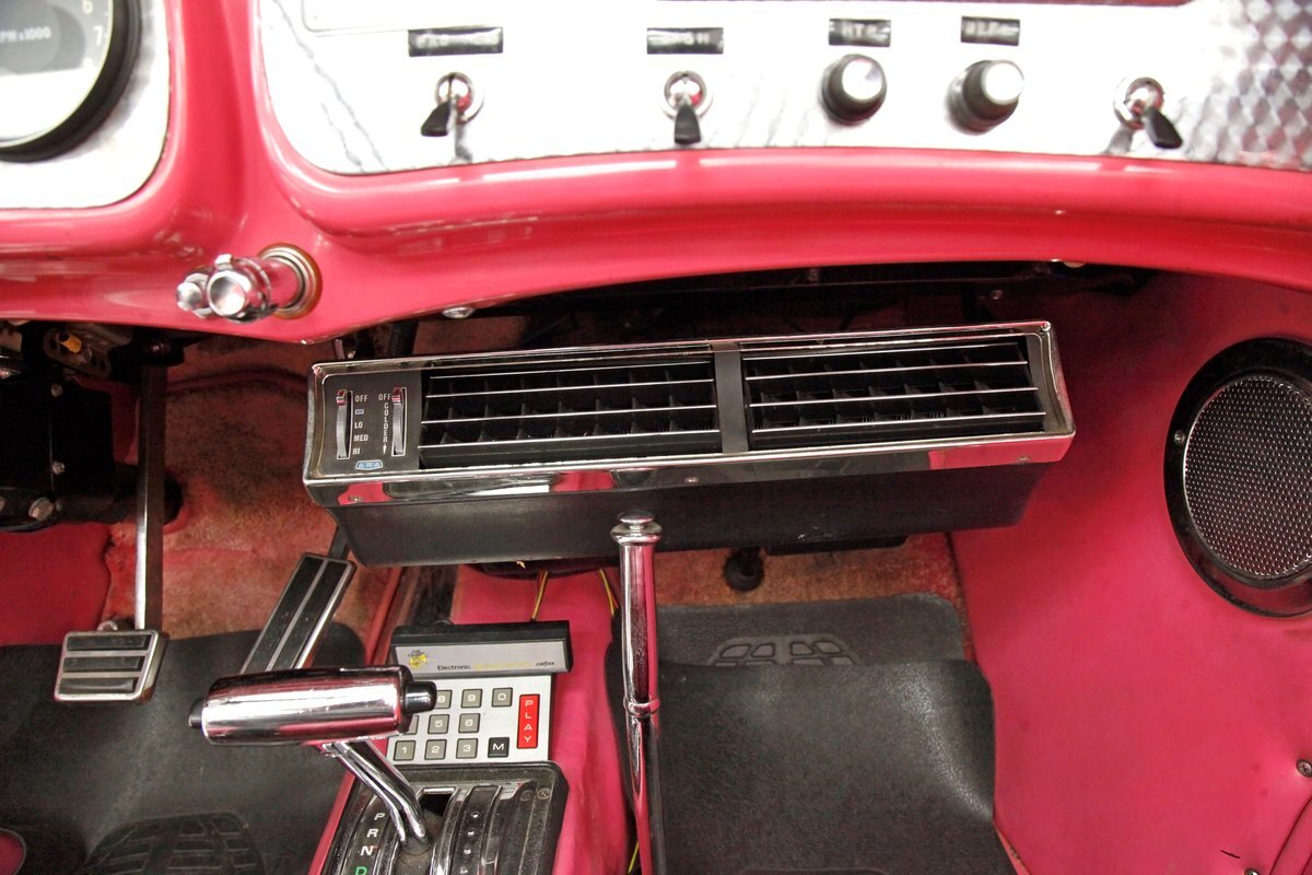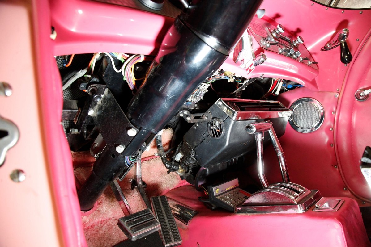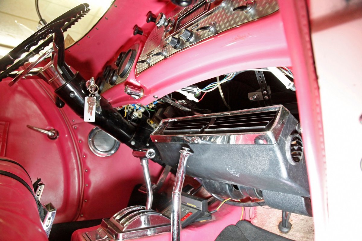 A swing forward of the suicide doors reveals some hot pink leather door panels to feast our eyes on. They have a small storage pouch stitched into them. My eyes slip inside to a full hot pink leather bench which has some tuck and roll stitching and is showing some slight aging in the form of light cracking. A pink center console in plastic resides in front and center of the bench and houses a Mustang T style shifter, (think 60's style Mustang). Above is a pink dash with dual machined swirls pattern inserts for the gauges in front of the driver, and an AM/FM radio and some toggles and knobs for the passenger. The dash is light pink fiberglass and has a top mounted rear view mirror. The steering wheel is black and has a half round horn ring with a pink center and a large AC unit hangs below the dash under the radio panel. Just below is some faded pink carpeting is covered by black protective mats.