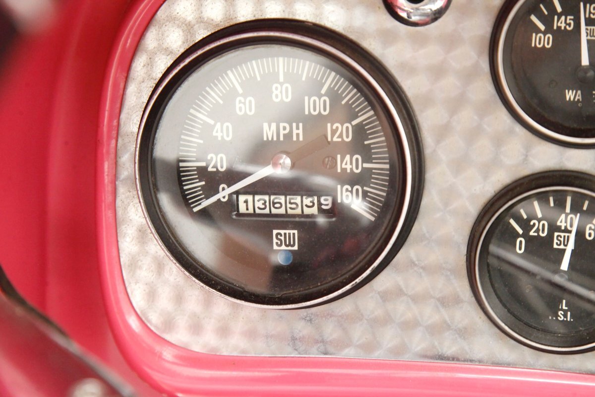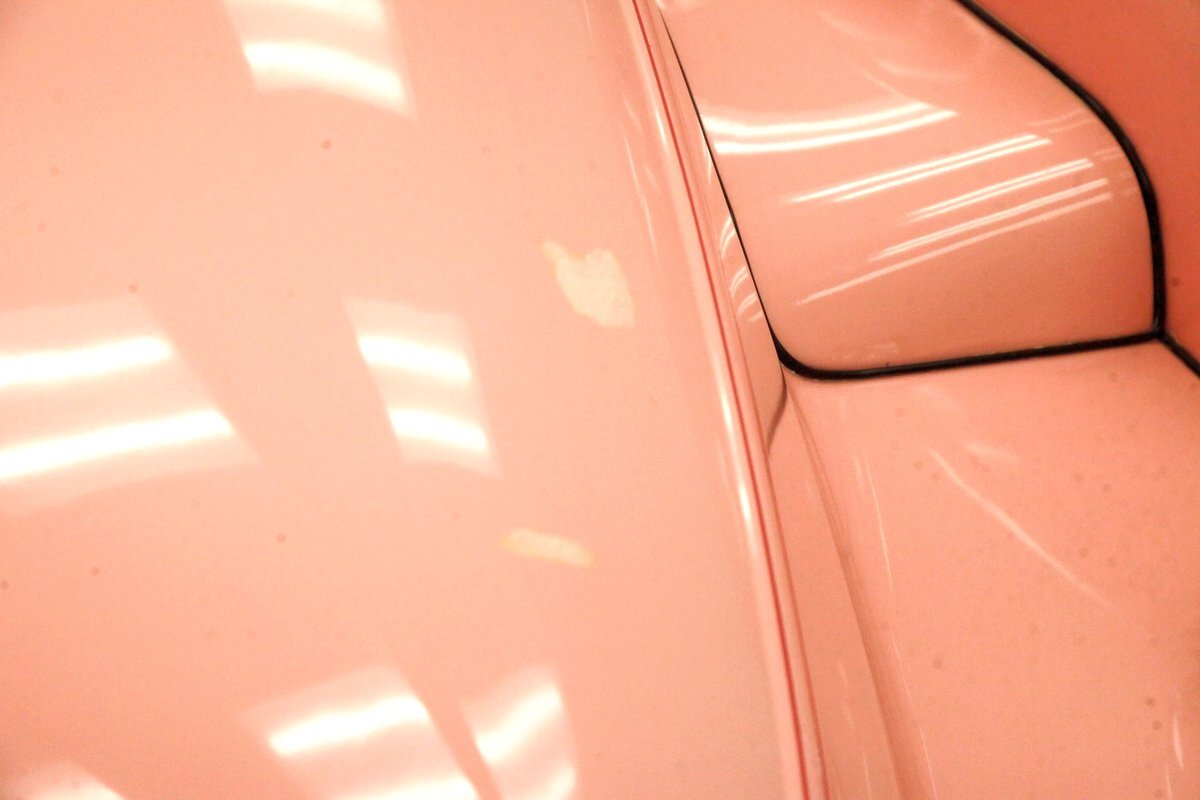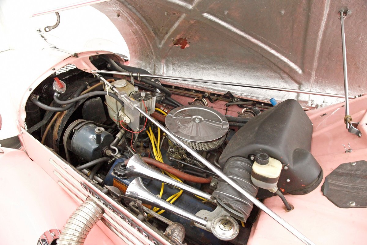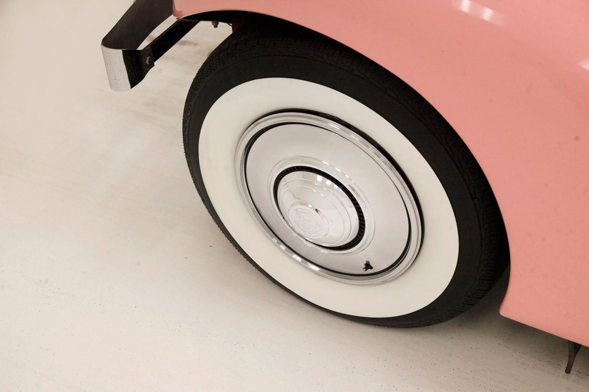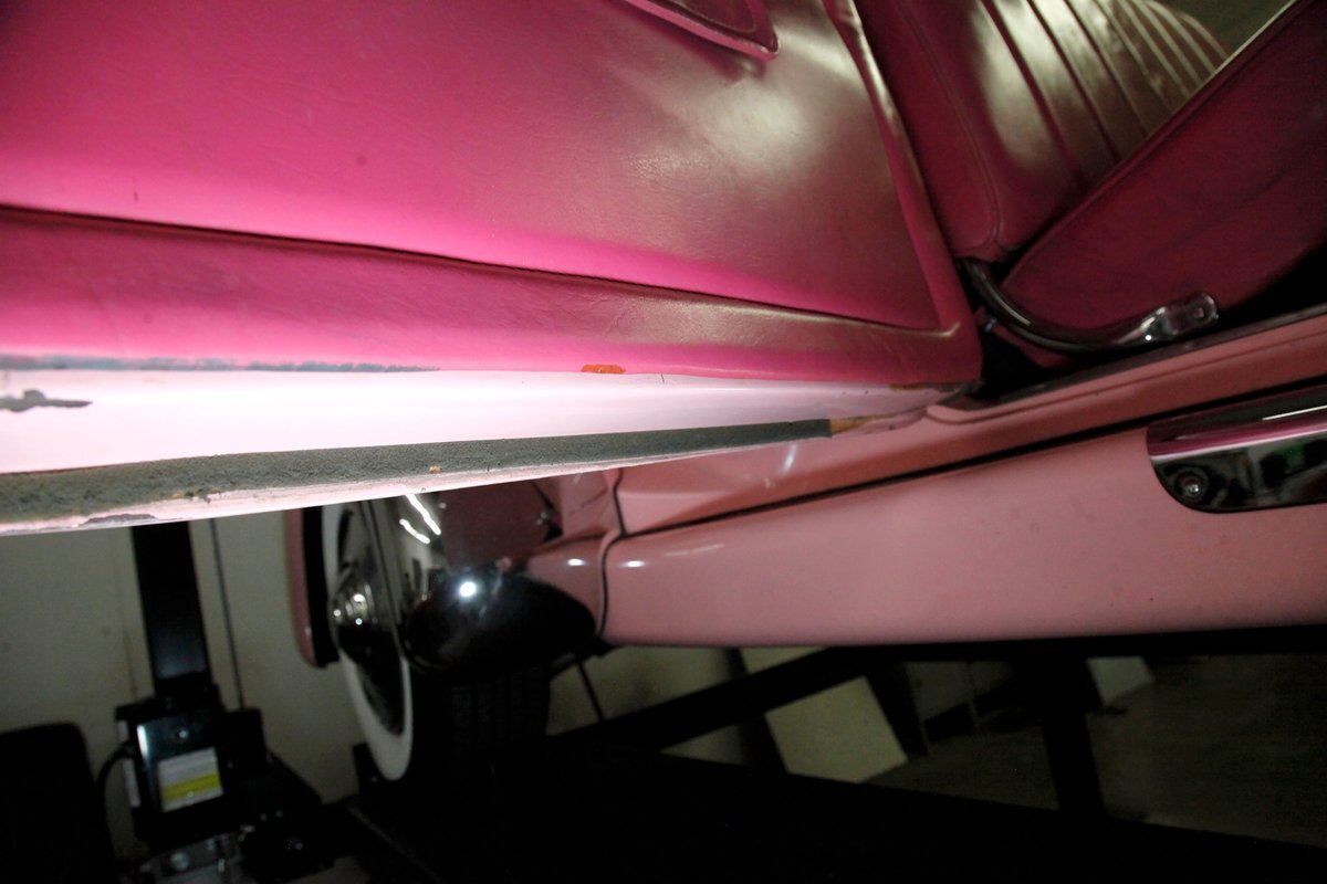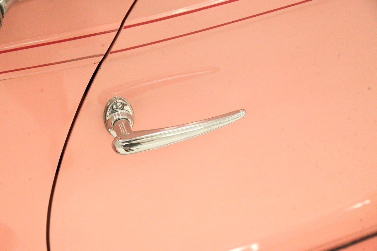 A swing forward of the suicide doors reveals some hot pink leather door panels to feast our eyes on. They have a small storage pouch stitched into them. My eyes slip inside to a full hot pink leather bench which has some tuck and roll stitching and is showing some slight aging in the form of light cracking. A pink center console in plastic resides in front and center of the bench and houses a Mustang T style shifter, (think 60's style Mustang). Above is a pink dash with dual machined swirls pattern inserts for the gauges in front of the driver, and an AM/FM radio and some toggles and knobs for the passenger. The dash is light pink fiberglass and has a top mounted rear view mirror. The steering wheel is black and has a half round horn ring with a pink center and a large AC unit hangs below the dash under the radio panel. Just below is some faded pink carpeting is covered by black protective mats.