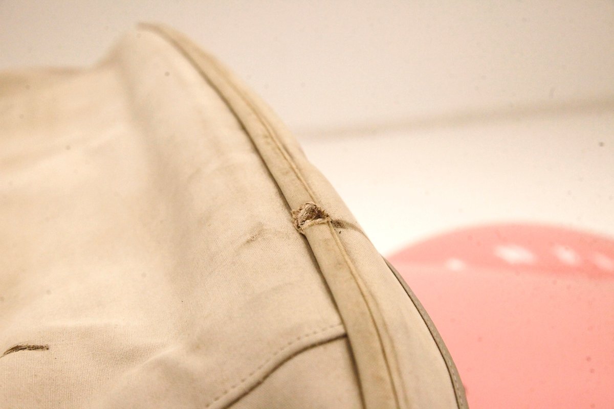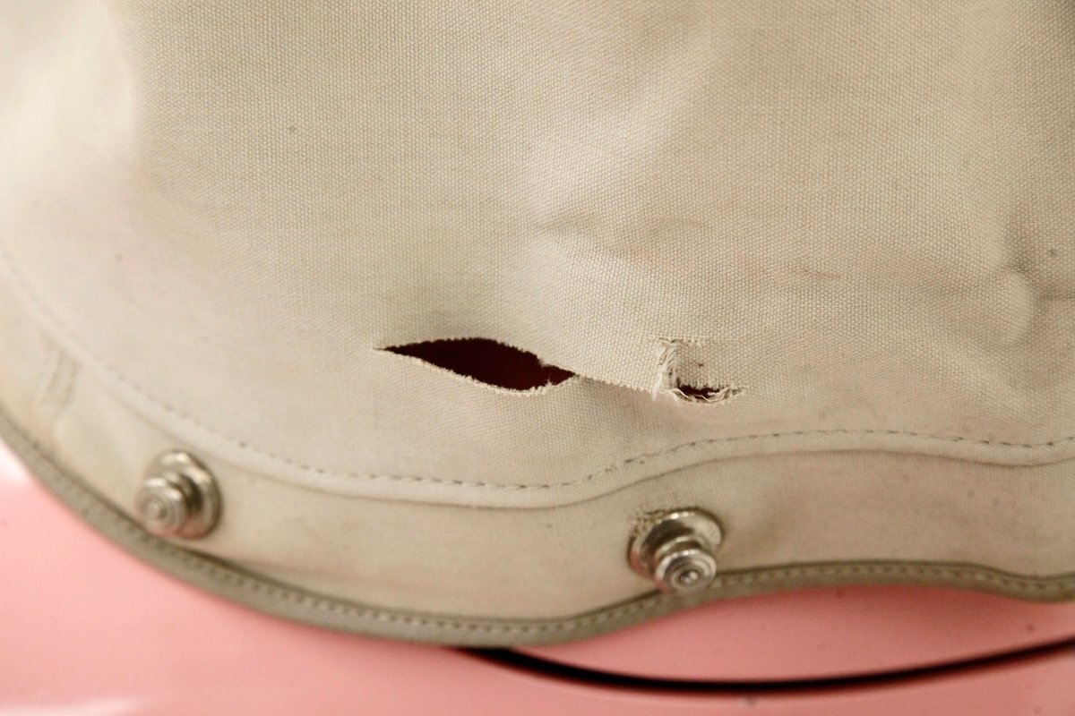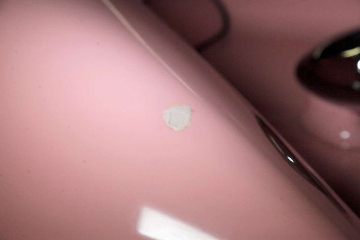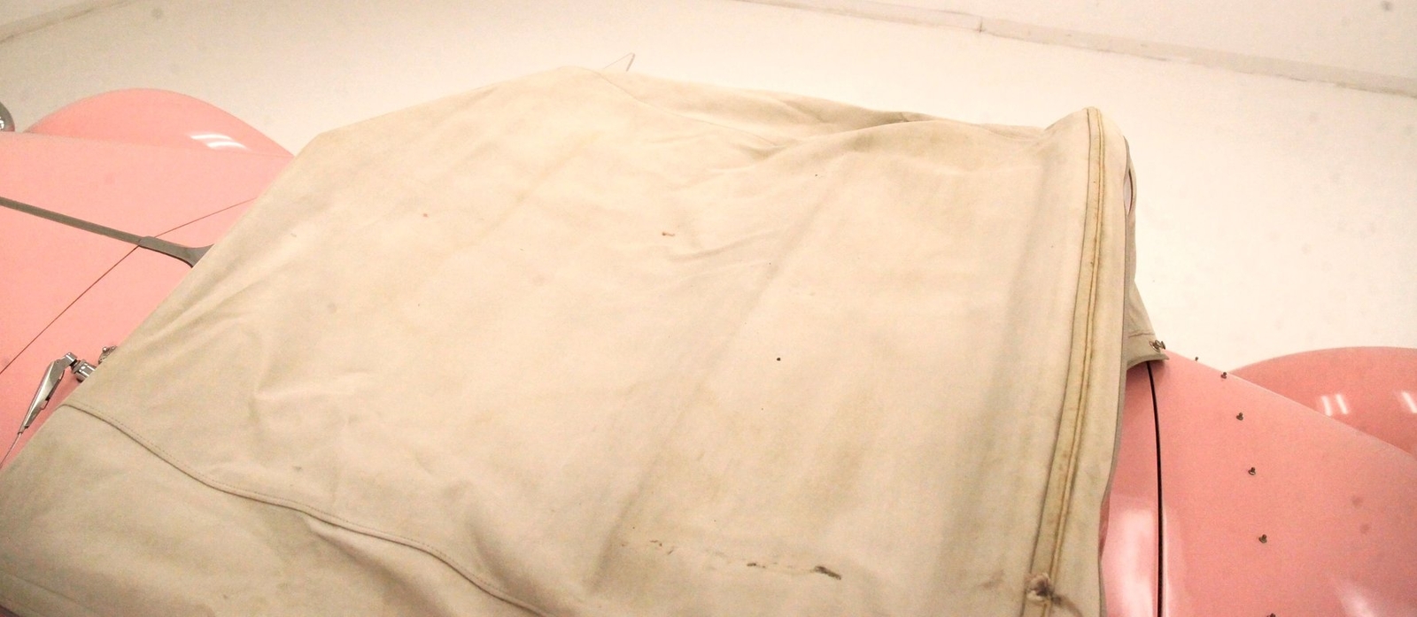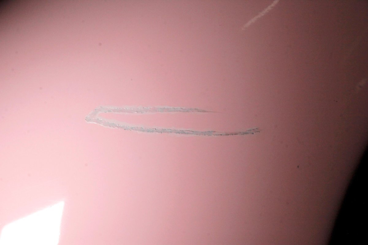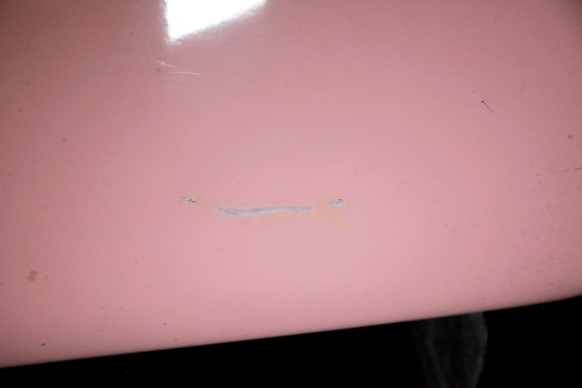 A swing forward of the suicide doors reveals some hot pink leather door panels to feast our eyes on. They have a small storage pouch stitched into them. My eyes slip inside to a full hot pink leather bench which has some tuck and roll stitching and is showing some slight aging in the form of light cracking. A pink center console in plastic resides in front and center of the bench and houses a Mustang T style shifter, (think 60's style Mustang). Above is a pink dash with dual machined swirls pattern inserts for the gauges in front of the driver, and an AM/FM radio and some toggles and knobs for the passenger. The dash is light pink fiberglass and has a top mounted rear view mirror. The steering wheel is black and has a half round horn ring with a pink center and a large AC unit hangs below the dash under the radio panel. Just below is some faded pink carpeting is covered by black protective mats.