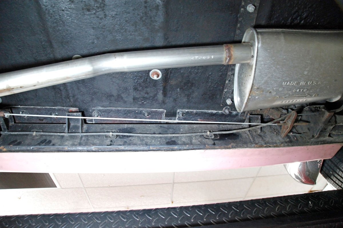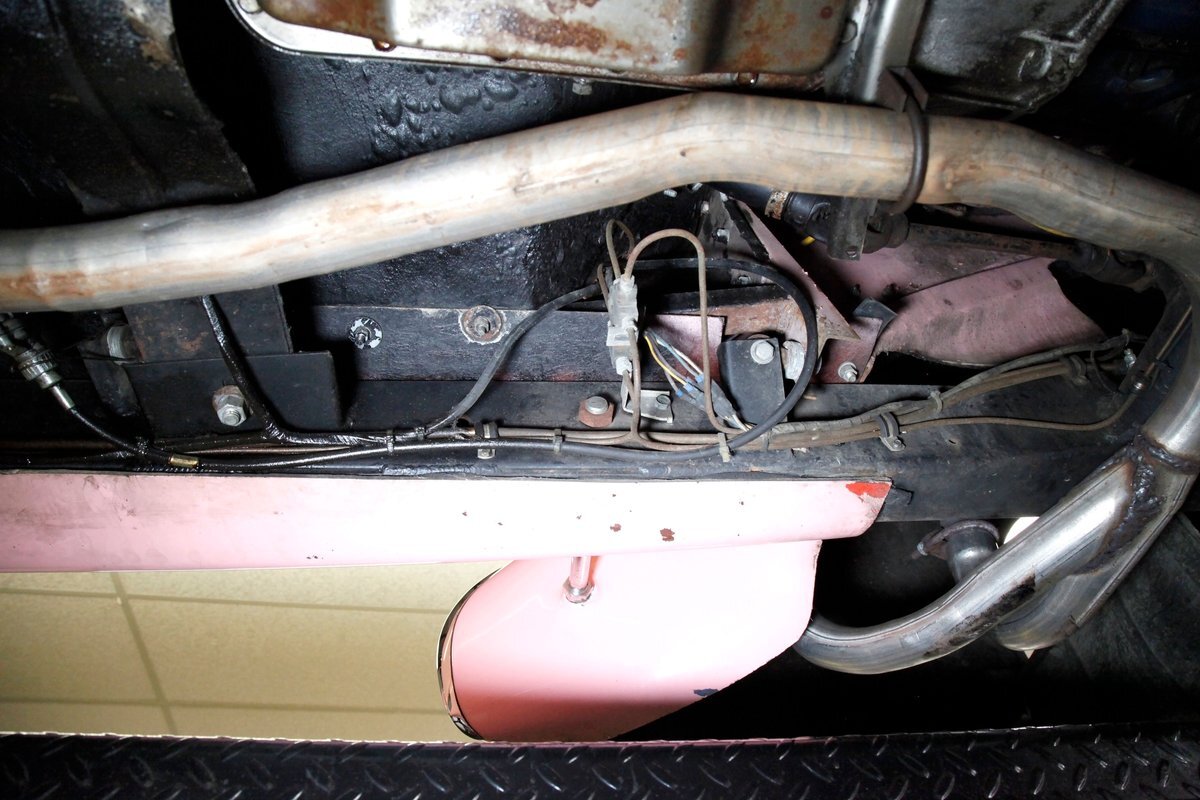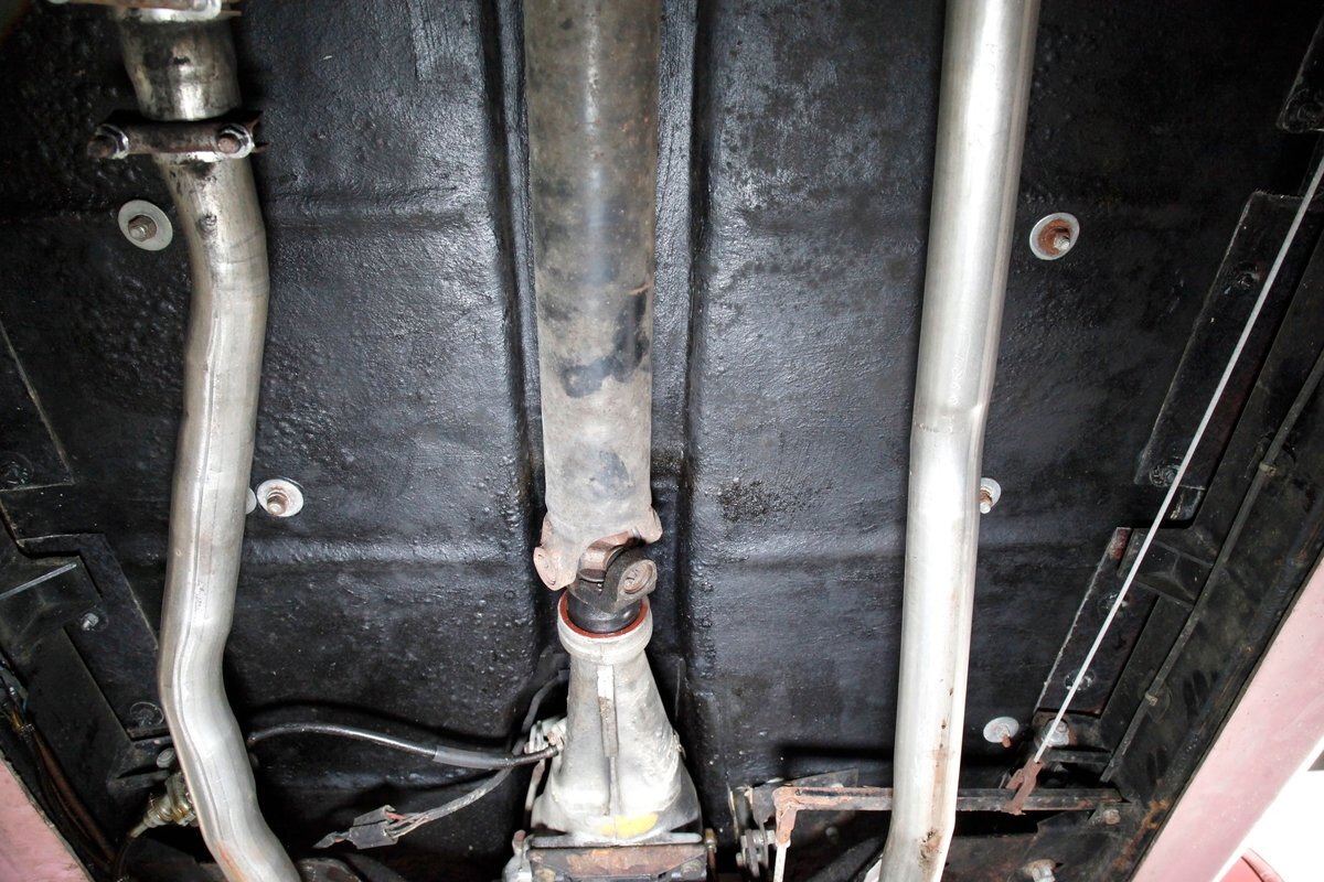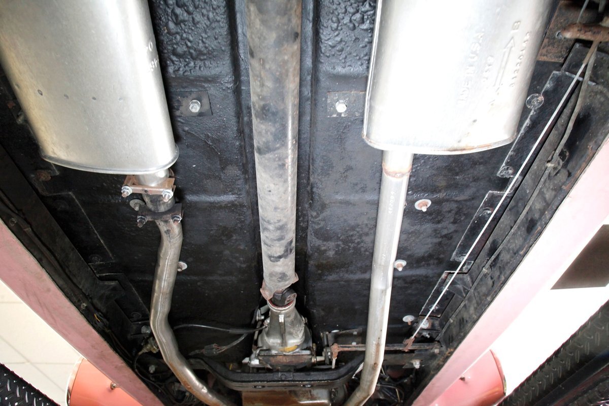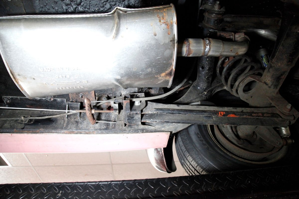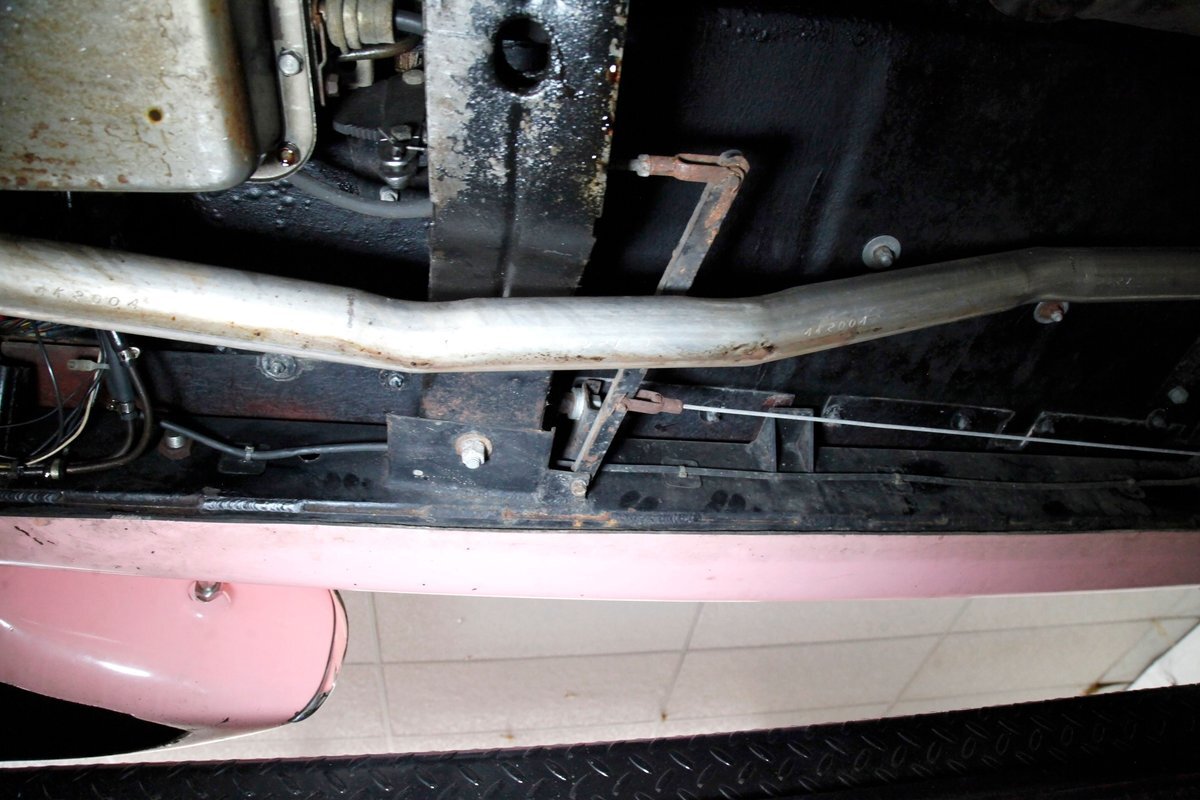 Some light patina is noted on the steel underpinnings of the black heavy coated fiberglass floor pans and wheel wells. Independent coil springs are on front and a 4 link with coil springs is reserved for the back. Power disc braking is up front, and power drums for the rear. Mostly nicely clean underneath.