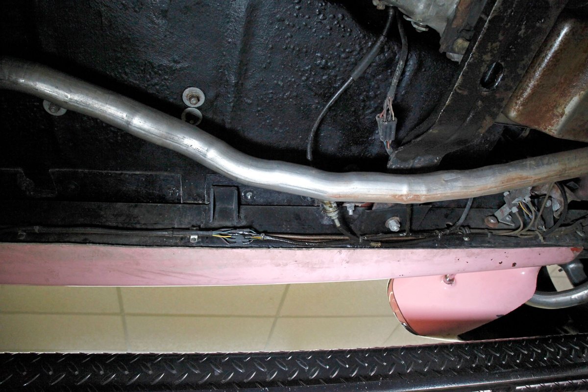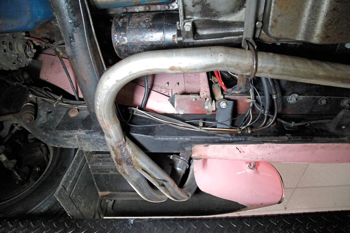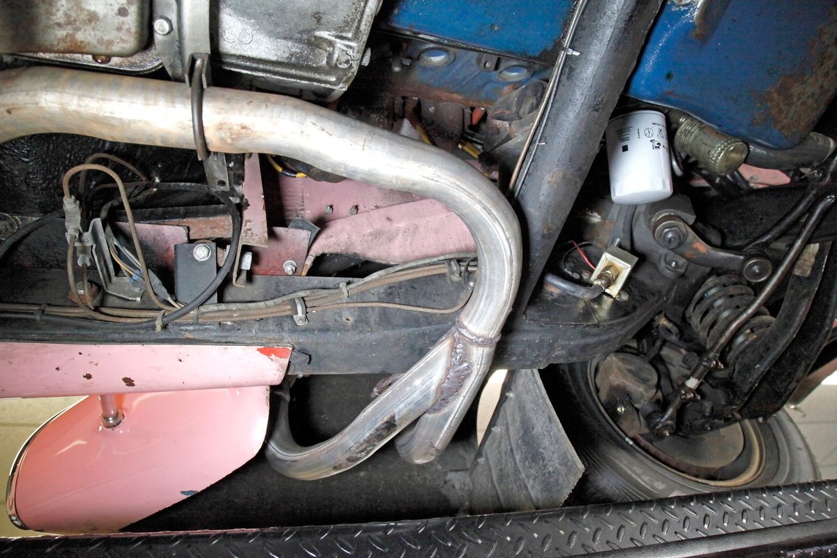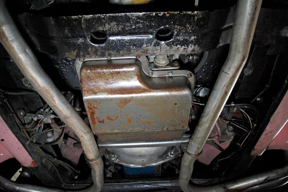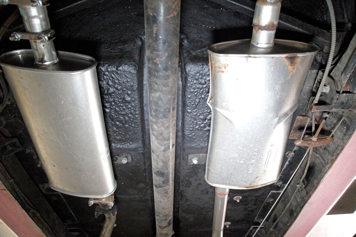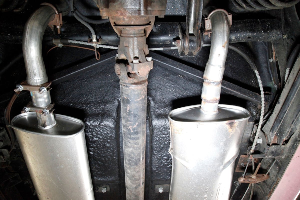 Some light patina is noted on the steel underpinnings of the black heavy coated fiberglass floor pans and wheel wells. Independent coil springs are on front and a 4 link with coil springs is reserved for the back. Power disc braking is up front, and power drums for the rear. Mostly nicely clean underneath.