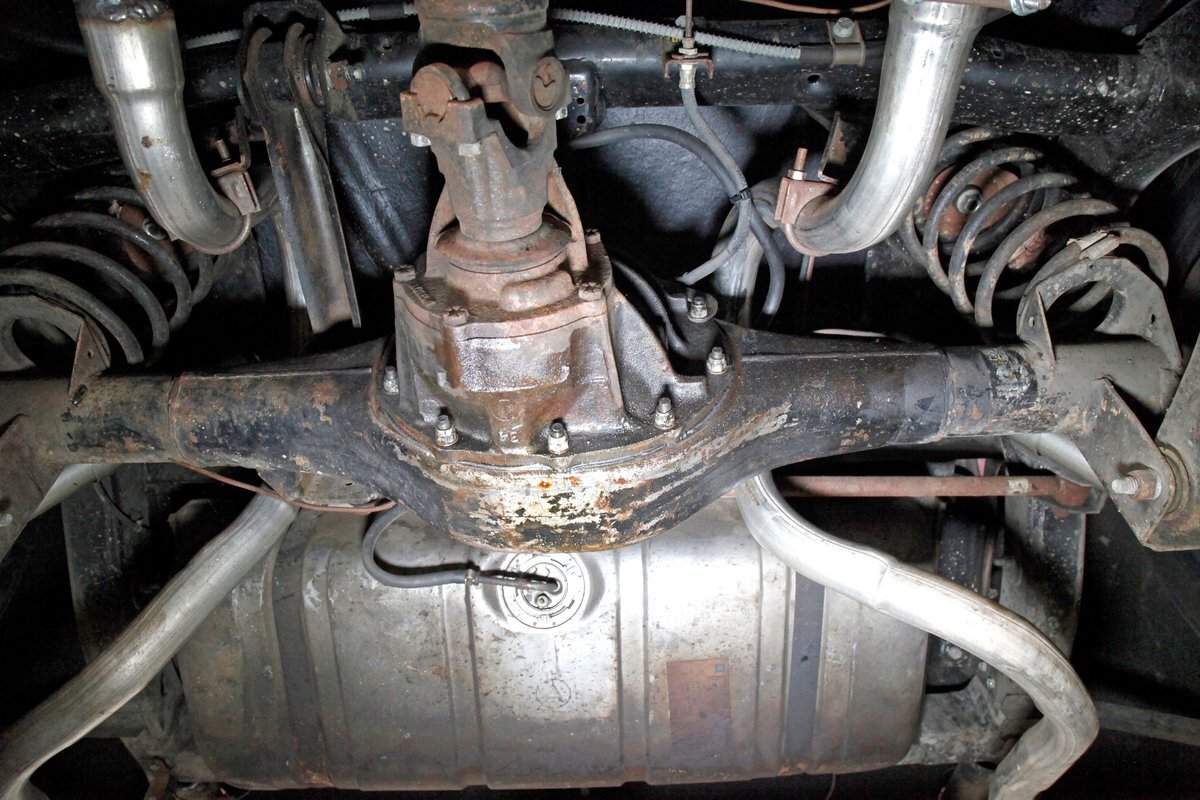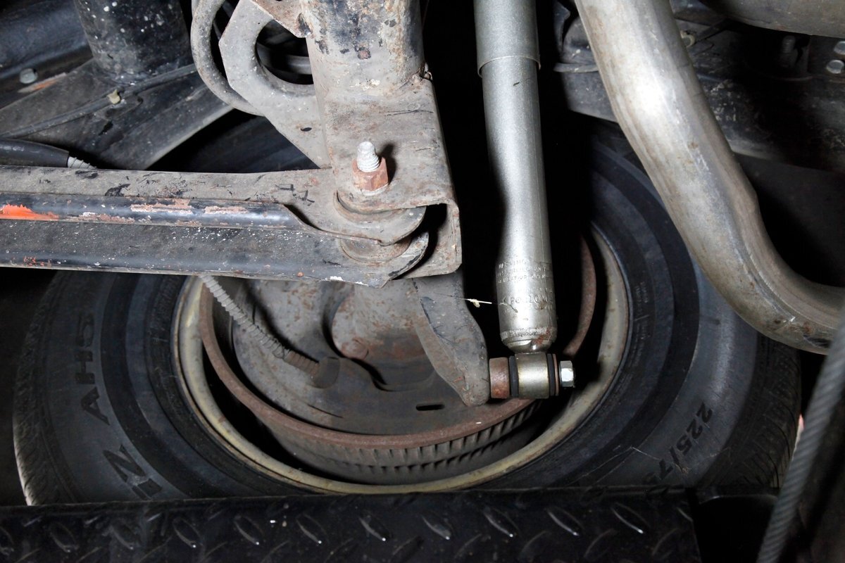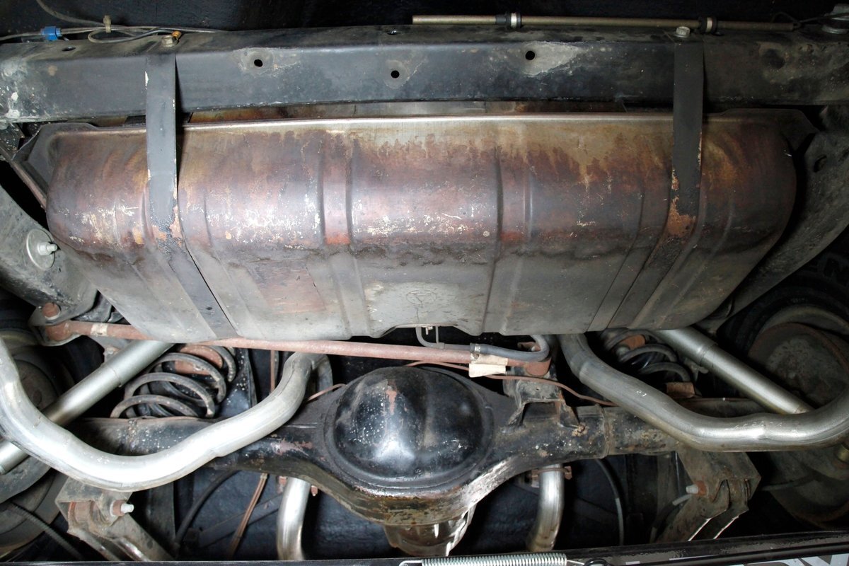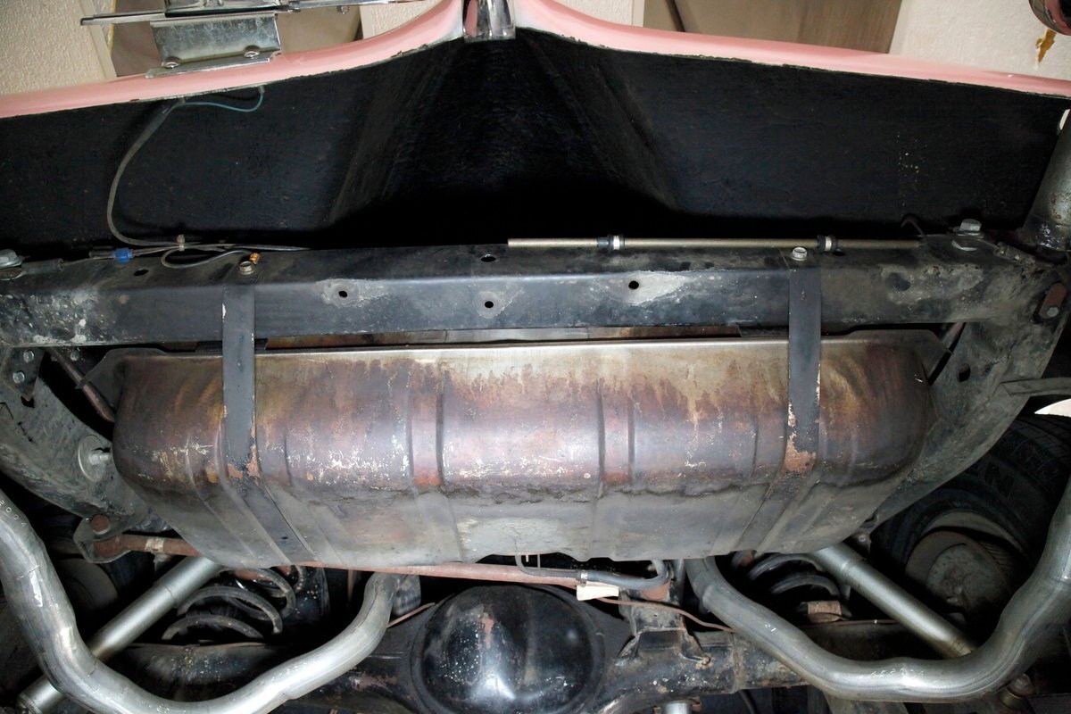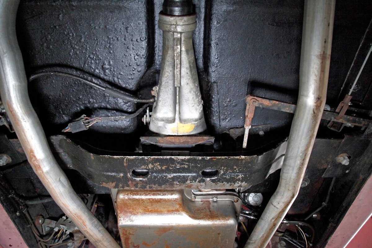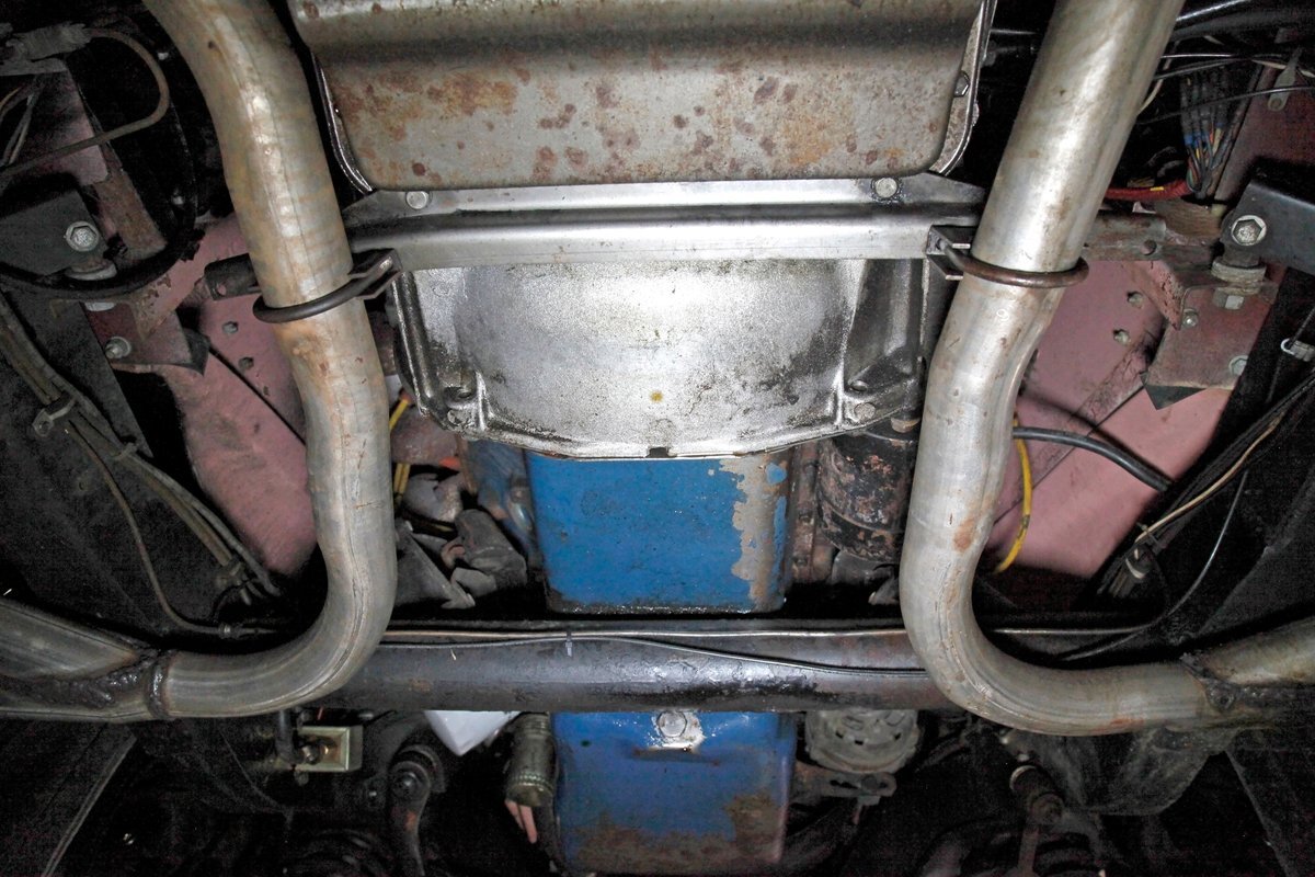 Some light patina is noted on the steel underpinnings of the black heavy coated fiberglass floor pans and wheel wells. Independent coil springs are on front and a 4 link with coil springs is reserved for the back. Power disc braking is up front, and power drums for the rear. Mostly nicely clean underneath.